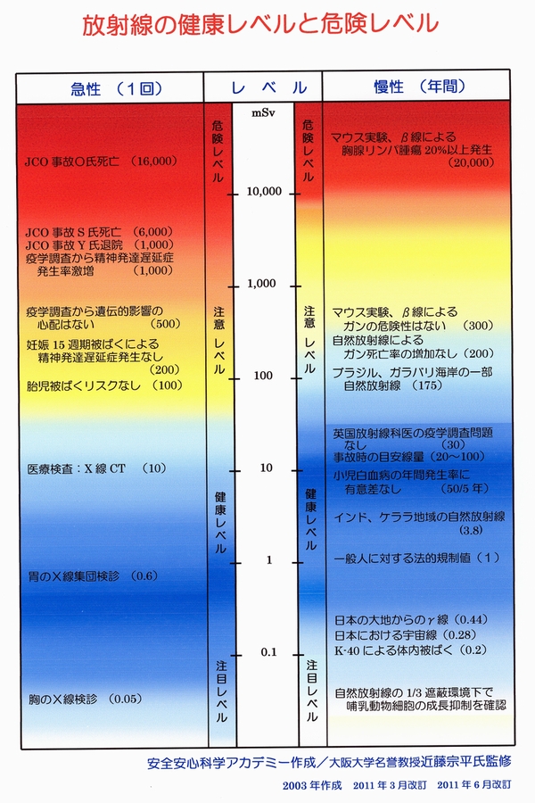 *放射線の安全量の具体量の提言として、安心科学アカデミー(現:安全安心科学アカデミー)から「放射線のレベルと危険度」として設立時の2003年に上記の内容で提言いたしました。 いっぽう、国際的にも著名な科学者団体・放射線専門研究組織からの放射線の安全量の提言は2004年、フランス科学アカデミーからの「年間200ミリシーベルト未満は実質的に無害」(実際的しきい値の存在)の提言。2005年アメリカ保健物理学会(放射線防護学の研究団体)より「年50ミリシーベルト未満は無害」の提言がなされております。 |