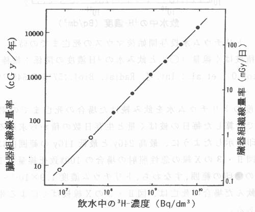 V章 マウスを用いた放射線影響の研究 U・2トリチウム水を飲み続けた場合の生体影響3-5) 文部省の核融合研究のための科学研究費特別研究の一環として、山本修と共同研究者は、1983年に、広島大学放射能医学研究所に、トリチウム実験棟を設立した。この実験棟で、各種の放射能の強さのトリチウム入りの水をつくって、これを飲料氷としてマウスに生涯にわたって与えた。 便用したマウスは、(C57BL/6NxC3H/He)F1 の一代雑種のメスである。これは、胸腺リンパ腫瘍の自然発生率が実際上ゼロであるため、発ガン実験に好適な系統である。これの5週齢のものを購入して、10週齢に達してから、体重が(24土1)gのものを選抜して、トリチウム投与実験を開始した。トリチウム水の原液は、トリチウムの放射能の強さが1.75×1014Bq/dm3、アマーシャム・インターナショナル社より購入した。 一定濃度のトリチウム水y(Bq/dm3)を与え始めてから、マウス体内のトリチウムの濃度が増加して平衡状態の値(プラトー)になってから(7日以後)、3匹を犠牲にして、各臓器から臓器片を採取し、ゼラチンカプセルに封入し、計量後凍結した上で、自動焼却装置で処理をした灰を液体シンチレーションカウンターで測定し、トリチウムの臓器1g当りの放射能の強さx(Bq/g )を計算する。xの値は各臓器間で違いはない(ただし、血液は少し放射能値が高い)。 そこで各臓器のx値の平均値くx〉から、次式によって、トリチウムβ線による体内被ばく線量率dD/dt(Gy/日)を求める3): dD/dt=くx>(Bq/g)×5.7keV(=9.13×10-13Gy)×60×60×24(Gy/日)(U・1) ここに、5.7keVはトリチウムβ線の平均エネルギーである(表I・3参照)。 臓器の比放射能の平均値くx>(Bq/g)を書き換えて1000くx>(Bq/g)と表示すると、飲んだトリチウム水の比放射能y(Bq/dm3)と同じ単位になる。トリチウム水摂取開始後7日以上たつと、マウスの臓器の比放射能は飲み続けた水の比放射能の30-34%となった3)。すなわち、次の実験式が得られた: 1000くx>(Bq/kg)=(0.3-0.34)y(Bq/edm3)(U・2) 式(U・1)と式(U・2)から、濃度yのトリチウム水を飲んでいる場合のトリチウムβ線による体内被ばくの線量率dD/dt=はつぎの式で与えられる: dD/dt=(2.37〜2.68)10-8y(mGy/日)=(8.65〜9.78)10-7y(cGy/年) (U・3) この式に用いたcGy単位は次のように定義される線量単位である: 1cGy=1センチグレイ=0.01Gy (U・4) 実験でえられた式(U・3)を図示すると図U・5のようになる: ![]() 図U・5 飲料水中の3H濃度とマウスがこれを毎日飲み続けて体内に摂取した3Hのβ線による被ばくの線量率の関係;●:実測値、○:外挿値。 (Yamamoto,o. et.al :Int.J.Radiat.Biol.73:535-541,1998.より改写)5) |