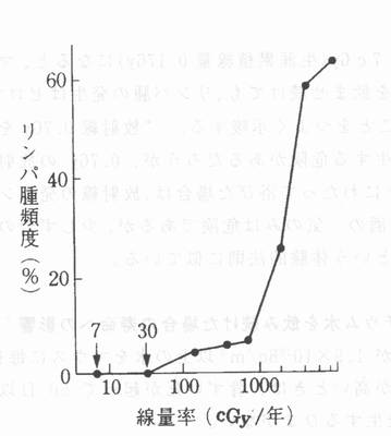 V章 マウスを用いた放射線影響の研究 U・2・2トリチウム水を飲み続けた場合の胸腺リンパ腫の発生 4.5) 図U・7は、骨ずい死が起らないトリチウム濃度の水を生涯にわたってマウスが飲み続けた場合の実験結果である。わかりやすくするため、胸腺リンパ腫以外の腫瘍の発生による死亡は除外した。図では胸腺リンパ腫頻度とマウスが毎日飲んだトリチウム水による体内被ばくの線量率の関係を示す。 ![]() 図U・7マウスの胸腺リンパ腫頻度と生涯飲み続けたトリチウム水中の3H濃度の関係;図では3H濃度の代りに3Hのβ線によるマウス体内被ばくの線量率を図の横軸の値に採用した。 (Yamamoto,o. et.al :Int.J.Radiat.Biol.73:535-541,1998 より改写)25) 図U・7の右から3つ目の黒丸は、3H濃度2×109Bq/dm3 の水を毎日飲み続けた場合である;この場合は3Hを飲み始めて平均400日後に25%の頻度でマウスの胸腺にリンパ腫が発生した。このときの3Hβ線による体内被ばくの線量率は、1年あたり1800cGy(図U・7の横軸参照)、一日あたり5cGyである。図U・7の右から2番目の黒丸は、リンパ腫頻度が60%で1年間の被ばく線量は3500cGy で、摂取した3H水の放射能の強さは4×109Bq/dm3 である。この濃度のトリチウム水摂取でも骨ずい死は起らないで、マウスの平均生存日数は約260日で、リンパ腫が多発するに十分の生存日数である。リンパ腫が多発する線量率の領域では、マウスの骨髄内の血球はトリチウムのβ線を浴ぴて大量に死ぬが、骨ずい死がおこるほどの壊滅状態にはならない。しかし、大量の仲間が死ぬので、これを補完するため、骨ずい内の生き残った幹細胞や各種の芽細胞(=末成熟細胞;図U・1参照)は活発な分裂・増殖を強制される。この結果、細胞分裂の際の誤りで、発ガン性異常を持った幼著細胞が有意の頻度で発生すると考えられる。事実、放射線の中程度の被ばくで一番よく死ぬのはリンパ球である(図U・2参照)から、マウスが被ばくした場合、リンパ球の腫瘍が一番よく発生するのは納得できる。 図U・7によれば、トリチウムβ線によるマウス体内被ばく線量率が、年間900cGy以下になると、リンパ腫の頻度が急滅し、年間30cGy(生涯累積線量0.7Gy )または年間7cGy(生涯累積線量0.17Gy )になると、マウスに生涯にわたってトリチウム水を飲ませ続けても、リンパ腫の発生はゼロである(図U・7)。図U・7はつぎのことをつよく示唆する。“放射線0.7Gyを1分以内に一気に浴ぴるとがんが発生する危険があるだろうが、0.7Gyの放射線を毎日少しずつに分けて、2年以上にわたって浴ぴた場合は、放射線の発ガン性毒性は消える”。上述の結論は、“酒の:一気のみは危険であるが、少しずつの酒は安全で百薬の長の効果がある”という体験的法則に似ている。 |