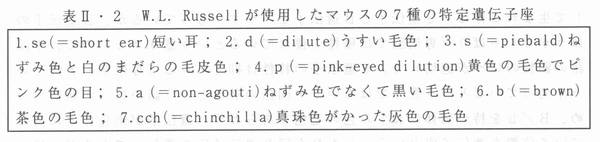 V章 マウスを用いた放射線影響の研究 U・3 放射線による生殖細胞の突然変異 1958年国連科学委員会は、核爆発実験による放射性降下物による微量汚染による被ばくが、人類の将来に遣伝的傷害を与える可能性があるから、放射線はどん徴量でも警戒が必要だという声明をだした(序章参照)。これは直線しきい値なし仮説が世界的に流布される端緒になった。この声明がでた頃からしばらくの間は、国連科学委員会でも国際放射線防護委員会でも、放射線のリスクは遺伝的影響が主要な議題であった。これに呼応して、米国のオークリッジ国立研究所のW.L.Russellは、常時数万匹のマウスを飼育しながら、遺伝的影響の研究を、1950年代後半から 6)、1980年初期 8)にわたって、総計数百万匹のマウスを使って研究を行った。 なぜ、このように膨大な数のマウスと長い年月が遺伝的影響の研究に必要であるか?それは、オスまたはメスのマウスに放射線を照射して、特別の遺伝的特色を持っているメスまたはオスで、放射線を照射していないマウスと交配して、それから生まれる仔マウスを調べ、約l0万匹にl匹の割合で生まれる変わりもの(突然変異個体)を見つける作業が必要だからである。 U・3・1 特定遺伝子座に関する突然変異の検出法 2) ねずみ色の普通(野生型)のマウスを長年飼育していると、まれに、茶色の毛色のマウスが生まれる。これをねずみ色の野生型のマウスと交配すると、生まれる仔はねずみ色の毛色で、野生型マウスと外見的にはかわらない。この場合、茶色の毛色を支配する遺伝子をbと書き、この遣伝子がb型に変化するまえの野生型遺伝子をBと書くことにする。茶色のマウスと野生型マウスを交配して生まれる仔は、b遺伝子とB遺伝子を一つずつもっているが、B遺伝子のほうがでしやばり(専門語では優性:優れているという意味はないので、中国語の顕性のほうが適切)で、b遣伝子の特性は抑えられる(専門語で劣性という;劣っているという意味ではない;中国語の潜性という語のほうが適切)ため、B/bを持つ個体はねずみ色の毛色をあらわす。遣伝子が染色体上に占めている位置を遺伝子座という。bもBも同じ遣伝子座の遺伝子であるが、違った性質を持っているので、対立遣伝子とよぶ。図U−9には、染色体上で、b遺伝子とB遺伝子を黒帯と白帯で区別して示し、両者が染色体上で同じ位置に存在することを示めした。ちがった対立遺伝子を持つ個体を、へテロ接合体とよび、B/bと表わす。茶色のマウスは、同じ劣性遺伝子bを2個もつので、ホモ接合体とよぴb/bと表わす。野生型マウスは、ホモ接合体でB/Bと表わす。 ![]() 図U‐9特定の遺伝子座に生じる劣性遺伝子をl世代で検出する方法 2)。検定用の茶色のマウスは、劣性遺伝子bについてホモ接合体であるため毛の色が茶色である。 茶色のホモ接合マウス(b/b)と野生型のマウス(B/B)の交配で生まれる仔は、へテロ接合体B/bであるから、外見上はねずみ色をしている。しかしこのヘテロ接合体を熱心にしらべていると、数万匹に1匹の割合で、茶色のマウスが見つかる。これは、B遣伝子に突然変異が起って、B遺伝子でないものに変化したためで、これをB*と表わすことにする(図U‐9)。B*/bとあらわされる個体が生まれ、B*遺伝子がb遣伝子を抑える力がなくなると、bの特性である毛の色を茶色にする特性がおもてに現れるのである。 W.L.Russell は、使用するマウスの数をへらし、研究の時間を短縮するため、表U‐2に示す7種の特定遺伝子座(ローマ字小文宇は遣伝子座の名前)に関する突然変異だけに注目した。 ![]() ねずみ色の野生型オスのマウスにX線を照射して、検定用の茶色のホモ接合体メスのマウスと交配すると、その仔の中に茶色のものが現れる割合は、X線の量に直線比例して増加する。例えば、X線を6Gy:一気に照射すると、茶色の仔が自然頻度の13倍の頻度であらわれる。これは、B遺伝子がB*遣伝子に突然変異を起こす頻度が13倍増加したことを意味する。 |