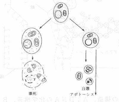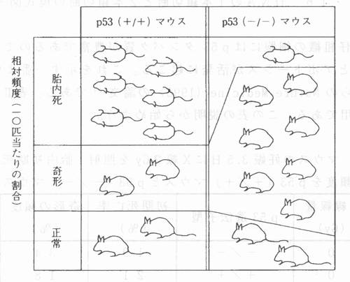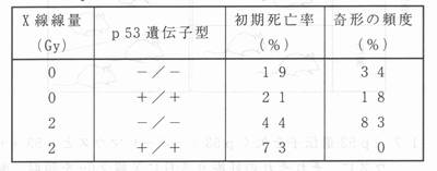 U章 マウスを用いた放射線影響の研究 U‐4 放射線による奇形発生の危険は低線量率照射では消失 U‐4・2 p53依存アポトーシスが放射線による奇形誘発を抑制 胸腺細胞は放射線被ばく後細胞の萎縮をともなって死亡する。これは、アポトーシス(図U‐14)と呼ばれる細胞死である。打撲などによる損傷組織の普通の細胞死は、壊死(図U‐14)と呼ばれ、細胞は少し膨張してから死ぬ。 ![]() 図U‐14 壊死とアポトーシスの特徴を示す模式図 2) 壊死:細胞が膨張して破裂して死ぬ。アポトーシス (自爆死):細胞は萎縮・断片化し、しばしば細胞核の崩壊を伴う。 分子生物学的技術の進歩により、各種の遣伝子を破壊したマウス(ノックアウト・マウスという)をつくることができるようになった。p53という遺伝子がある。これをノックアウトしたことをp53(-/-)とかく。記号が2個あるのは、マウスの個体の細胞は同じ遺伝子を2個もっているから、2個とも破壊したことを明記するためである。p53(-/-)マウスと正常なp53(+/+)マウスから胸腺細胞をとりだして試験管内で培養する。それぞれにγ線5Gyを照射すると、照射後7.5hrで、p53(+/+)胸腺細胞は50%死ぬが、p53(-/-)胸腺細胞はほとんど死なない 13))。前者は、普通マウスにX線3Gyを照射した場合、リンパ球が被ばく後急滅する生体実験の結果(図U‐2)に対応する。p53(-/-)マウスの胸腺細胞では、放射線を浴ぴてもアポトーシスは起こらない。放射線被ばくでアポトーシスが起こるためには、p53遣伝子によってつくられるタンパク質“p53 タンパク質”の働きが不可欠である。 放射線によるDNAの傷とアポトーシス 電離放射線の生物作用の主要な標的は細胞の核の中にあるDNAである。放射線で生成した電離と励起がDNA分子内または周辺に発生して、DNAに傷がつくことが、放射線の生物作用の主因である。図U‐15はDNAの構造と複製の模型図である。 ![]() 図U‐15 DNAの構造.A;DNAの化学構造.B;DNAの複製の模式 図 2)略語の説明:A=アデニン;T=チミン;G=グアニン;C=シトシン 放射線によるDNAの傷は、DNAの1本鎖切断と2本鎖切断(図U‐16)およぴDNAのいろんな部分にOHラジカル(水分子が放射線の励起または電離の作用をうけて生成さる化学反応活性の強い産物)が作用しておこる化学的変化である。この中で2本鎖切断が放射線損傷の主役である。他の傷は普通の場合は効率よく修復される。放射線被ばくで細胞にDNA2本鎖切断ができて、修復されないで残存すると各種のタンパク質分子が2本鎖切断を認識して各種の細胞反応が起こる。p53タンパク質分子が豊富に存在する細胞では、2本鎖切断の部位をp53タンパク質が認識して、細胞のアポトーシスが起こり、細胞は自爆して組織から廃棄される。 ![]() 図U‐16 DNAのl本鎖切断と2本鎖切断の模式図 2) マウスの胎仔組織の細胞にはp53タンパク質が豊富であるので、胎仔が放射線を浴ぴるとアポトーシスが活発に起こる。これを示す一番よい証拠は、T.Nomura らの Nature Medicine(1996 )の論文 14)である。表U‐5はこの論文からの引用である。この表の説明から始めよう。 ![]() 表U‐5マウスの妊娠3.5日にX線2Gyを照射;胎内初期死亡率と奇形頻度をp53(+/+)マウスとp53p(−/−)マウスで比較 14) 正常なp53(+/+)マウスでは、妊娠3.5 日という初期胎仔期にX線2Gyを照射すると、胎内初期死亡率は73%と高いのに、奇形は誘発されなかった。これに反して、p53遺伝子をノックアウトしたマウスp53(-/-)を同じ時期に同じようにX線を照射した場合は、胎内初期死亡率は44%と低ドし、奇形の頻度は83%と高頻度で発生した。すなわち、被ばくしたp53(/)マウス は致死作用には強くなったが、生き残りはほとんど全部が奇形で生まれた。この実験に関連して、つぎの実験結果が重要である。X線を妊娠9.5日に照射したマウス胎仔の神経管で調べたところ、p53(+/+)マウスでは高頻度でアポトーシスが検出されたが、p53(-/-)マウスでは放射線被ばくによるアポトーシスは全く起こらなかった。 図U‐17は、妊娠9.5日のマウスにX線2Gyを照射した場合の死亡率と奇形頻度をp53(+/+)マウスとp53(-/-)マウスで比べたもので、わかりやくするため、図で示したものである。アポトーシス活性のあるp53(+/+)マウス胎仔では、10匹に6匹の割合という高頻度で胎仔死がおこったが、奇形の頻度は10匹に2匹にすぎなかった。他方、被ばくしてもアポトーシスが起こらないp53(-/-)マウス胎仔は、期待通りに死亡率は10匹にわずかl匹の割でX線に強いことがわかった。しかし、このマウスでは、生まれた仔のほとんど(9匹中7匹の割合)が奇形をもっていた。 ![]() 図U‐17 p53遺伝子を欠くp53(-/-)マウスとp53(+/+)マウスに、それぞれの妊娠9.5日にX線2Gyを照射。両者の胎内死亡率と奇形頻度の比較を模式的に図示。 (T.Nomura らの Nature Medicine 2, 577-580(1996 )に基づく) 14) むすび 正常なp53(+/+)マウス胎仔は、放射線に弱くてよく死ぬが、よく死ぬ(アポトーシスの)おかげで、放射線障害による奇形の頻度は低い。他方、p53遺伝子を欠損したp53(-/-)マウスの胎仔は、アポトーシスで不良細胞が死なないため、見