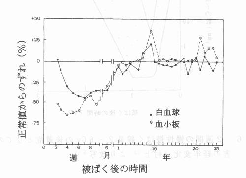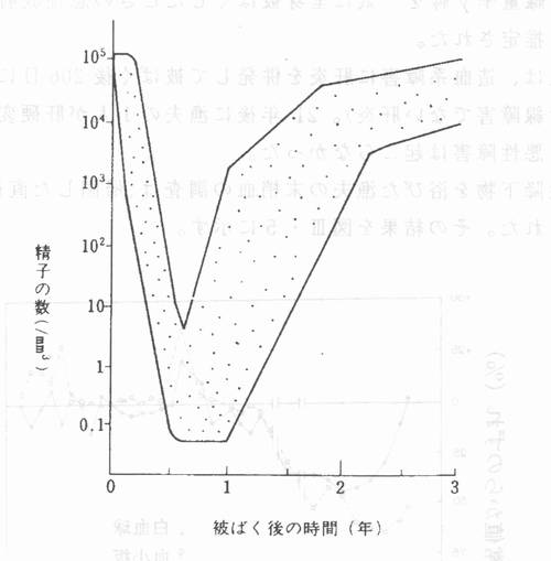 V章 放射線の人体影響 V・5 ビキニ水爆放射性降下物の日本人漁夫への健康影響 11,12) 1954年3月1日、米国は太平洋のビキニ環礁で水素爆弾の爆発テストを行った。近くで漁労をしていた日本の漁夫23人(18−39歳)が水爆からの放射性降下物を漁船と一緒に浴ぴた。漁船が焼津港に帰ってきた3月14日までに漁夫が体外γ線によって浴びた全身被ばく線量はつぎのように推定された;被ばく線量2-3Gyが11人、3.3-4Gyが5人、4.2-4.8Gyが3人、5.5-5.8Gyが3人、6.7Gyが1人。この全身被ばく線量は2週問にわたる慢性被ばくであるので、この被ばく線量の健康影響は、これらの線量の半分、すなわち、0.8-3.2Gyの高線量率γ線を一気に全身被ばくしたときの急性放射線症状に相当するだろうと推定された。 漁夫の1人は、造血系障害に肝炎を併発して被ばく後206日に死亡した(死亡主囚は放射線障害でない肝炎)。21年後に漁夫の1人が肝硬変で死亡した。残りの漁夫に悪性障害は起こらなかった。 水爆放射性降下物を浴ぴた漁夫の末梢血の調査は、帰国した直後から25年間継続してなされた。その結果を図V・5に示す。 図V・5 ビキニ水爆の放射性降下物を浴ぴた漁夫の末梢血中の白血球と血小板のカウントの長期間調査(Kumatori et al.1980 12)より 図V・5から、末梢血中の白血球数も血小板数も被ばく後約1ケ月ころ最低値に低迷し、その後半年は滅少のままで、1年後に正常値に回復し、以後25年間異常は起こらなかった。 表V・1 の男性患者Dの場合は、2Gy被ばくで一時不妊となった。同様に、ビキニ放射能被ばく漁夫の場合も、22以上の被ばくであって、精子形成障害が起こった。 図V・6は精子数が被ばく後の時間に応じてどのように変化したかを総括的に図示した。これは、各人についての詳細な調査結果 13)を総括して模式的に示したものである5)。 図V‐6 2週間の慢性被ばく線量2−6Gyの後遺症としての精子形成障害の経年変化(村上 13)より改写5)) 図V・6によれば、精子の数は放射線被ばく後急滅し、半年、1年に最低(正常値の104〜106という極端な滅少)となり、その後精子の数はゆっくり増加傾向をとり、正常値に回復するのは被ばく後1.5-2年である。 精子の滅少変化を末梢血中の白血球の滅少変化と比べると、精子の滅少のほうが白血球の滅少より桁違いに大きい。すなわち、精子形成機能は白血球形成機能より放射線に高感受性である。 白血球が幹細胞の分裂・増殖・分化をへて形成されるように(図U‐1参照)、精子も幹細胞(精原細胞)から派生し、精細胞の分裂・増殖・分化をへて形成される。精原細胞は放射線を浴ぴると非常に敏感に死ぬことが知られている。 被ばく量が大きいと精子形成は永久に回復しないため、永久不妊になる。中国のγ線被ばく事故では、男性患者Bは生殖腺被ばく線量7Gyで永久不妊になったと報告されている(表V・1)。しかし、この患者では性生活には障害はないと報告されているから、外部生殖器は他の多くの臓器と同程度の放射線抵抗性を持っていることが分かる。 |