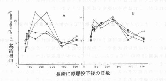 V章 放射線の人体影響 V・6 長崎原爆からの放射性降下物被ばくによる白血球数の増加 11)14) 長崎に投下された原子爆弾の爆発中心から3km東方に西山地区がある。ここは、金比羅山の山陰に位置するので、原爆の爆風、熱線、放射線は西山地区には到達しなかったので、西山地区は原爆の災害から免れた。 ところが、長崎原爆からの放射性降下物が西山地区に集中的に降り注いだ。広島原爆と長崎原爆を含めて放射性降下物が一番沢山落下したのが西山地区であった。このため、西山地区の調査が熱心になされた。その調査の結果の1つが図V・7である。 図V・7は、被ばく後の2ケ月から18ケ月の間にわたって、西山地区住民280人の末梢血中の白血球数の測定を継続して行った結果である。調査したのは、九州大学医学部放射線科のチーム 14) で、福岡から列車に乗って長崎まで出張して、現地の住民の血球調査を定期的に継続したのである。食糧も不足し貧困のどん底にあった敗戦直後に、このような地味な調査を長期間遂行した九大医学部放射線科の人達の科学的熱意には頭が下がる。 図V・7 長崎原爆からの放射性降下物を浴びた住民の被ばく後の白血球数の経時変化の調査;Aは成人;○=男性21-50歳、△=男性51歳以上;●=女性21-50歳、▲=女性51歳以上。Bは未成年者;○=男性0-10歳、△=男性11-20歳;●=女性0-10歳、▲=女性11-20歳。(中島その他 1953 14)11) ) 図V・7から、成人(図のA)も未成年者(図のB)も、放射性降下物を浴ぴた後、3-9月後に末梢血中の自血球数が増加したことが分かる。増加率は、成人男性が一番大きく最大約4倍で、成人女性では約2借であった(図V・7A)。未成年者は男女とも増加率は最大工8倍程度であった(図V・7B)。このように白血球の増加が起こったが、これには感染が関与した証拠はえられなかったので、白血球の増加は放射性降下物を浴びたことが原因であると考えられる。 西山地区の放射性降下物で測定値が定量的にえられているのは137CSγ線の値だけであるが、その値は体外からの累積被ばく線量で約0.2Gyと推定されている。この線量のうち被ばく後半年以内に浴ぴた量はどれくらいかはっきりしないが、過大に見積もって半分をあぴたとしても0.1Gyであるから、わずか0.1Gyのγ線慢性被ばくで白血球増加刺激をうけたことになる。白血球は放射線を一気に被ばくすると被ばく直後に一度増加してから滅少する特性(図V・1と図V・2参照)があるので、図V・7の白血球増加効果はγ線を慢性的に継続して被ばくし統けたためかもしれない。いずれにしても、図V・7は低線量放射線慢性被ばくで白血球増加が起こる証拠として貴重である。白血球の中には免疫関連細胞が含まれるので、図V・7は低線量放射線被ばくが免疫機能を亢進することで健康に有益効果を与える可能性を示唆する知見である。この慢性被ばく効果には137Csその他の放射性核種の体内摂取の寄与が:大きいと思われるが、これは当時の技術では測定できなかった。 |