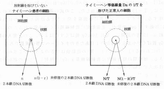 | W章 低線量放射線の健康影響の疫学的調査 W‐11 放射線に弱い“ナイミーヘン症候群”患者のDNA修復不全 ナイミーヘン遺伝病の特異的疾患と2本鎖DNA切断修復不全の関連 ナイミーへン患者は2本鎖DNA切断修復不全症である。これが原因となって、患者にはつぎの特異的疾患が発生する。1)患者の大半が先天性奇形症、小頭症頻度は100%;2)患者の35%がリンパ腫・白血病を21歳までに発病;3)全患者は若年で死亡;4)免疫不全症;5)末梢血リンパ球に転座・逆位が多発;6)患者の体細胞は、正常細胞より2−3倍のX線致死高感受性;7)患者の細胞は、放射線被ばく後、正常細胞で起こる「DNA合成一時停止」が起こらない。 上述の特性のうち、6)と7)は、ナイミーへン患者はDNA修復不全症であるため、放射線誘発の2本鎖DNA切断(dsb)の修復が不全となっている結果として説明できる。 特異唐アで、N=40Dn (6A) この式に自然発生dsbと放射線誘発dsbの毒性の強さの比fを補正囚子として追加すると式(6)の厳密な式になる。 ![]() 図W‐16 ナイミーヘン等価線量Dnの定義:正常人細胞が線量Dnを浴ぴたとき修復されないで残る2本鎖DNA切断(dsb)の数N(1−R)は、ナイミーヘン患者細胞に毎日自然発生するdsbのうち修復されない残存dsbの数n(1−r)のT日間の累積数Tn(1−r)と等しい。図の●印は残存dsbの数で、両細胞で等しい大きさ。rとRは、それぞれ、患者細胞と正常細胞のdsbに対する修復効率。r=0.4なら、傷が40%修復し、残存dsbの割合は(1−r)=0.6になることを意味する。Tは正常人が放射線被ばくして、ナイミーヘン患者と同類の疾息を発病をする危険期間の日数。 |