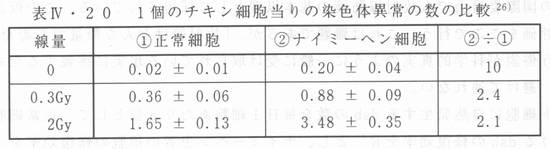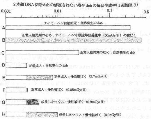| W章 低線量放射線の健康影響の疫学的調査 W‐11 放射線に弱い“ナイミーヘン症候群”患者のDNA修復不全 2本鎖DNA切断は自然発生と放射線誘発で微妙に違う 米国の放射線防護測定評議会(National Council on Radiation Protection and Measurements:NCRP)報告136号 30)は、つぎのように結論して、電離放射線はどんなに徴量でも毒であると主張している。自然発生の2本鎖DNA切断(dsb)は切れ口がきれいなためすぐ修復されるが、放射線誘発の2本鎖切断dsbは切れ口が複雑なため修復されにくいので、両者は質的に異なるDNA損傷である。従って、放射線は特異的な毒性効果をもっているという仮説が提唱されている。この仮説は、UNSCEARやICRPなど主要な放射線防護関連の国際委員会でも放射線防護の基本原理として採用されている。この仮説の再評価をここで行う。これは難題であるが、「放射線はどんな微量でも毒だ」という俗説が科学的真実のように一般に受け取られている現実に挑戦するためには、避けて通れない。 ヒト細胞に自然発生するdsbの数を毎日1細胞あたりn個として、正常細胞におけるdsbの修復効率をR’とし、ナイミーヘン患者の細胞の修復効率をrとする。ヒト細胞が毎日γ線をd(mGy)浴ぴた場合に1個の細胞に1日あたりに放射線で誘発されるdsbの数をz個とし、放射線誘発dsbの修復効率を正常細胞の場合はRとし、ナイミーヘン細胞の場合はrとする。放射線の障害効果はz個の放射線誘発dsbのうち修復されないで残存するdsbに比例するはずである。そこで、[z]のように[]で囲んで、残存dsbの数を表すことにする。 こうすると次のような表示式がえられる: [nwt]=n(1−R’)fg=5(1−R’)fg (12) [nnb]=n(1−r)fg=5(1−r)fg (13) [z]=z(1−R)=0.04d(1−R) (14) ここに、式(12)と(13)の右端の項の数字5は、増殖期のヒト細胞では毎日約5個以上のdsbが自然に発生しているという実験結果に基づく 27)。fは自然発生dsbの毒性を放射線誘発dsbの毒性と比べたときの相対比である。上述のNCRP報告ではf=0と仮定している。gは人体の各種の組織の細胞群で増殖期にある細胞の割合を表す。gは、休止期の細胞ではdsbの自然発生率がゼロ 27)であることを表示する因子である。初期胚では、gは1に近き、誕生後は全身平均でg=0.1桁と推走している。 この推定の状況証拠につぎの例がある。マウスの場合、初期胚と中期胎仔に於ける致死率20%を与えるX線の線量の比は1:10である(図U‐13参照)。 このことは、初期胚では全細胞が増殖期にあるが、中期胎仔では増殖細胞の割合が10%低下しため、後者がX線に強くなる、として説明できると考えている。 式(14)の数字0.04は、放射線1Gy当り40個のdsbが誘発されるという報告 28)に基づく。式(12)と(13)の下つき添え字wtとnbsは、これらが付着している量nが正常細胞のものかナイミーへン細胞のものかを区別する記号である。zに下つき添え字がないが、zは正常細胞の量である。 最近重要な報告がNature誌に発表された 26)。チキン(鶏)細胞を便って、Nbs1遺伝子の一部を人工的に破壊したNbsl変異細胞(以下ナイミーへン細胞と呼称)をつくり、正常なNbsl遣伝子をもつ細胞(以下正常細胞と呼称)と比べた。その1例は、全ての染色体異常の発生数で、γ線照射した場合と照射しない場合について比較した 26)。表W‐20に実験結果を総括して示す。 ![]() 表W‐201個のチキン細胞当りの染色体異常の数の比較 26) この表から、γ線を当てない場合の染色体異常の発生数は、ナイミーヘン細胞では正常細胞の10倍である。両細胞で自然発生のdsb数は等しいと考えられるから、この10倍の比は、自然発生dsbの修復効率を正常細胞ではR∴ナイミーヘン細胞ではrとした場合、(1−r)/(1−R’)に等しい。もし、r=0.5とすれば、R’=0.95となる。 γ線を照射した場合は、表W‐20から、ナイミーヘン細胞の染色体異常の頻度は正常細胞の頻度の2.3倍である。この比は、放射線誘発dsbの修復効率を正常細胞でR、ナイミーへン細胞でrとすれば、(1−r)/(1−R)に等しい。ここで、r=0.5とすれば、R=0.8となる。この場合の(1−r)/(1−R)の値2.3は,γ線照射による細胞致死誘発率をナイミーヘン細胞と正常細胞で比較したときの比が2.5である(式(9)参照)こととよい一致を示す。 上述の結果は、正常細胞においては、自然発生dsbの修復効率は95%という高い値であるが、(高線量率照射の)γ線誘発のdsbの修復効率は80%で、自然dsbに対する修復効率よりかなり低い。これは、γ線の障害効果は線量率を下げると激滅し、しばしば放射線リスタがゼロになる事実を考慮すると、低線量率照射で誘発されるdsbの修復効率Rは、0.8より増加し、白然発生dsbに対する修復効率R’=0.95に近づくと思われる。これらの考えで、式(12)〜14) の計算を進める。 fの値は、式(11)を考慮しながら、簡単のためf=0.1と仮定する。この値とR’=0.95,r=0.5を式(12)(13)に代入すると次式がえられる: [nwt] =0.025g(dsb/日);g=1(胎児初期) またはg=0.1(誕生後)(12A) [nnbs]=0.25g (dsb/日);g=1 (初期胎児)(13A) [z] =0.04dX0.05=0.002d(Gy/日);正常成人の慢性被ばく(14A) [z] =0.04×50×0.2=0.4(残存dsb/日); 正常人胎児期にDn/T