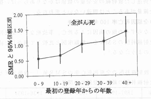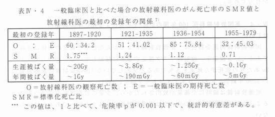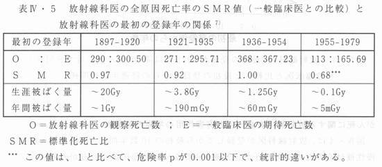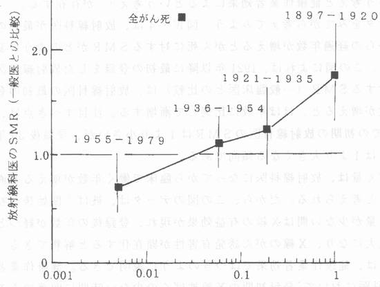 | W章 低線量放射線の健康影響の疫学的調査 W‐4英国放射線科医100年間のがん・その他による死亡率の調査 はじめに 国際放射線防護委員会は、原爆放射線によるがん死亡率と線量の関係は直線であるという仮定を、放射線リスク推走の基本に採用している。そうして、1Svあたりの致死がん確率を5%であると発表している(国際放射線防護委貝会の1990年勧告、p‐84,日本アイソトープ協会、1991)。原爆放射線は瞬時に全線量が放出されたから、少量の放射線を少しずつあびるような低線量率彼ばくのリスクは原爆放射線のリスクと同一であるとは限らない。 1895年にW.R.von Rontogen がX線を発見すると、あっという間に世界中にX線の医学的利用が普及した。従って、放射線の被ばくでは、医療分野での被ばくが一番長い歴史を持っていて、その被ばくは少量ずつ長期間の慢性的なものが中心であった。従って、19世紀末から現在までの放射線科医のがん死亡りスクをを調査すれば、低線量率被ばくのリスクが、原爆の高線量率被ばくのリスクと同程度か否かが判明すると考えられる。このような考えから、英国の有名な疫学者Sir Richard Doll は英国の放射線科医の死亡率を長期にわたって疫学的に調査を続けた。第l報は1958年に発表(W.M.Court Brown and R.Doll:Br.Med.J.ii:181-7,1958)、第2報は1981年に発表(P.G.Smith and R.Dll:Br.J.Raiol.54:187-94,1981)。第3報はこれから紹介する論文 7)である。 放射線科医のがん死亡率100年間の調査 7) 放射線科医と比較するための参照集団として、X線を職業的に浴ぴることのない参照集団として、一般の英国男性、ソーシャルクラスIの男性、および一般臨床医男性の3群をえらんだ 7)。死亡率の比較は、放射線科医の死亡数(0)と参照群におけるの期待死亡数(E)との比で行った。O/EはSMR(standardized mortality ratio:標準化死亡比)とよぶ。Eは次式で計算して求める。 E=n1P1E+n2P+・・・・・+nkPk (1) ここに、nIは放射線科医集団の1香目の年齢階級の人数、P1は参照集団のi番目の年齢階級の死亡率、kは調査集団で採用した年齢階級数である。SMRがlより大きいか小さいかで放射線科医の死亡率が参照集団より高いか低いか判断する。 表W‐4は、一般臨床医と比べた場合の放射線科医のがん死亡のSMR(標準化死亡比)と放射線科医の最初の登録年の関係をしめす。 ![]() 表W‐4一般臨床医と比べた場合の放射線科医のがん死亡率のSMR値と放射線科医の最初の登録年の関係 7) O=放射線科医の観察死亡数;E=一般臨床医の期待死亡率 SMR標=準化死亡比 − この値は、1と比べて、危険率pが0.001以下で、続計的有意差がある。 表W‐4によれば、最初の登録が1897−1920年の放射線科医のがん死亡率は、X線をほとんど浴ぴなかったと思われる一般臨床医に比べ、l.75倍で有意に高い。この高いがん死亡率は、この時期の放射線科医が生涯被ばくしたX線線量が大量であったためであることは間違いない。表W‐4によれば、この時期の放射線科医は臨床現場で生涯にX線を20Gyも被ばくしたと推定されている。 50%致死線量が急性被ばくの場合5Gyであるから、致死線量の4倍量を生涯に被ばくしていたことになる。それでも放射線科医に放射線急性死が一人もでなっかたのは、毎日少しずつのX被ばくで1年間当り1Gyの程度であったためである。すなわち、放射線の線量率が低下すると、放射線リスクは激滅する。放射線1Sv当りのがん死の過剰相対リスクは、原爆放射線の場合0.3(図W‐1)で、放射線科医の場合は表W‐4から計算すると0.04(=(1.75−1)/20Gy)であるから、後者は前者の13%に過ぎない。すなわち、放射線によるがん死のリスクは、原爆の高線量率の場合に比べて、放射線科医の場合は、l年間にlGyの慢性低線量率であったため、わずか13%に低下したのである。 一般臨床医と比べた場合の放射線科医のがん死亡率の標準化死亡比SMRは、放射線科医の最初の登録年が初期(1897−1920)から後期(1955−1979)ヘと年代が変化すると漸滅した(表W‐4)。この様子を図に現すと図W‐3のようになる。図では放射線科医の年間被ばくX線線量を対数目盛りで表示した。 ![]() 図W‐3放射線科医の標準化死亡比SMR(一般臨床医との比較)と年間被ばくX線量の関係(表W‐4のデータを図示したもの)7)7 図の中のエラーバーは95%信頼区間を示す。4桁の数字は最初の放射線医登録年。 図W‐3から、後期(1955‐1979)登録の放射線科医のがん死亡率のSMRは0.71で一般臨床医のがん死亡率より29%も低いが誤差の幅が大きくてわずかながら有意の差ではない(図W‐3の 1955−1979のSMR値の信頼区間参照)。 全原因死亡率に対するこの時期の放射線科医のSMRは、一般医と比較した場合、0.68である。すなわち、放射線科医は毎年すこしX線を浴ぴているが、一般臨床医より死亡率が32%も低く、これは統計学的に有意の低下(pく0.001)である7)。この時期の放射線科医は年間5mGyを20年慢性被ばくしたと推定されている(表W‐4の最下段参照)。したがって、この程度のX線の慢性被ばくは、死亡を低下させ、健康増進の効果、すなわち、放射線ホルミシス効果があることが示
