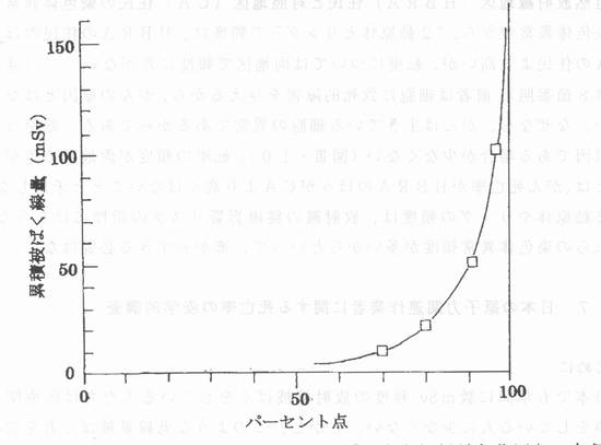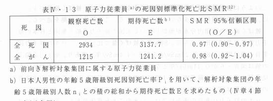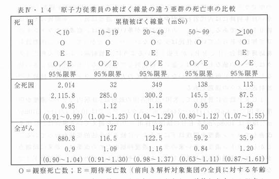 | W章 低線量放射線の健康影響の疫学的調査 W‐7 日本の原子力関連作業者に関する死亡率の疫学的調査 はじめに 日本でも年間に数mSv程度の放射線被ばくをしている人たちは医療関係の仕事をしている人に少なくない。しかし、このような低線量被ばく者を総括してその死亡率を追跡調査することは簡単にはできない。科学技術庁は、平成2年に、国内の原子力発電施設等の放射線業務従業者の死亡率の疫学的調査を(財)放射線影響協会に委託した。この第I期調査に続いて、第U期調査が平成7年度〜平成ll年度にわたってなされた。放射線影響協会には放射線従業者中央登録センターがあるので、ここに登録した作業者から選びだした対象者について、死亡率の調査が実施された。ここでは、この第U期調査の報告書の概要を述べる。 国内の原子力関連作業者の死亡率に関する調査 12) 放射線影響協会放射線従業者中央登録センターに登録された放射線業務従業者は、1995年3月において約30万人であった。この中から放射線業務に従事しなかった者と日本人でない者を除外した集団約24万人の中で生存が確認された119849人について、1999年3月までに生死の確認ができた人で、20歳未満と85歳以上の人などを除外した「前向き解析対象集団」ll9,484人について死亡率調査を行った。この調査の平均観察期間は約4.5年である。 「前向き解析対象集団」の各人の被ばく線量は、個人毎・年度毎の線量値を各原子力事業者が中央登録センターに登録したものである。「前向き解析対象集団」の調査期間中の個人の累積被ばく線量の分布の概要を図示すると図W‐8のようになる。 ![]() 図W‐8 原子力関連放射線業務に従事した「前向き解析対象集団」の各個人の累積被ばく線量の値をパーセント点の値で示した図。文献12の資料に墓づく作図。 図W‐8によれば、例えば累積被ばく線量が10mSvの人は約70%点(集団全員を線量が少ないほうから順にならべると、少ないほうから70%の点にいる人の線量は10mSvという意味)、80%点の被ばく量は20mSv、91%点の被ばく量は50mSv、97%点の被ばく量はl00mSvである。この集団の平均累積被ばく量は15mSvである12)。 図W‐8の被ばく線量の分布曲線は、図W‐6の原子力造船工の曲線と酷似した形をとっている。両者とも、集団内の大半の被ばく量は徴少であるが、少数の人はかなり高線量を被ばくしている。 前向き解析対象集団の原子力従業員の死亡率を日本人男性の死亡率との比較のため、標準化死亡比SMRを計算してみると表W‐13のようになる。この表によると、原子力従業員の全死因による死亡率は全日本人男性の死亡率より有意に低く、全がんによる死亡率も低い(ただし、統計的に有意の差ではない)。 この場合の原子力従業員の死亡率低下は比較した対照群が日本全国の男性であるから、健康作業者効果(healty work effect )を反映しているものと思われる(W章4節の健康作業者効果の項参照)。 ![]() 表W‐13原子力従業員a)の死因別標準化死亡比SMR 12) a)前向き解析対象集団に属する原子力従業貰 b)日本人男性の年齢5歳階級別死因別死亡率P1を用いて、解析対象集団の年齢5歳階級別人数niとの積の総和から期待死亡数Eを求めたもの(W章4節の式(1)参照)。 表W‐13では原子力従業員と全同・般男性との比較であるため、原子力従業者の有意の死亡率低下は健康作業者効果であると考えざるをえない。 原子力従業員を被ばく線量の違う亜集団に分けて、亜群間の死亡率を比べれば、健康作業者効果のはいる余地はへる。表W‐14はこのような比較である。 表W‐14原子力従業員の被ばく線量の違う亜群の死亡率の比較 ![]() O=観察死亡数;E=期待死亡数(前向き解析対象集団の全員に対する年齢別死亡率と等しい値で各亜群の死亡が起こったとして計算したもの;W章4節の式(1)参照) 表W‐14によると、原子カ従業員の全死因死亡率でも全がん死亡率でも、被ばく線量の増加にともなって、増加または滅少の一走の傾向はみられない。 このように放射線被ばくの影響が検出できなかったのは、被ばく線量が少い上に、死亡率の観察年数が少ないためと思われる。この結論の証拠を述べる。 被ばく線量の集団内分布が類似している米国の原子力造船工集団と日本の原子力従業員集団を比べてみる。80%点の被ばく量で比べると、日本の原子力従業員の値は図W‐8から20mSv/4.5年(=4.4mSv/年)であり、原子力造船工の値は図W‐6から14mGy/年となり、後者の集団にくらべて、日本の原子力従業員集団の被ばく線量率量はl/3にすぎない。さらに、日本の原子カ従業者の調査期間は原子力造船工の半分以下である。 日本の原子力従業員の調査結果は、つぎのことを意味がある。平均累積被ばく線量15mSvの放射線による死亡リスクは、検出できない程度に小さい。 |