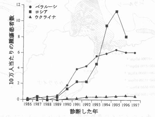 V章 放射線の人体影響 V・10 チェルブイリ放射能汚染によるパニックと真相 1)甲状腺腫瘍 図V・17は、14歳以下の着年時にチェルノプイリ放射能汚染を浴ぴた子供に発生した甲状腺腫瘍の発生頻度と腫瘍と診断した年の関係を示す。 図V・17 チェルノブイリ事故の年に14歳以下であった子供に発生した甲状腺腫瘍頻度と診断した年の関係 21) 図V・17によれば、チェルノブイリ事故の後、5年経ってから、甲状腺腫瘍の発生頻度が増え始め、7−8年後にピークに達した。腫瘍頻度はベラルーシとロシアでは同程度に高く、ウクライナは腫瘍頻度の上昇がやっと検出できる程度に低い。これらの甲状腺腫瘍の発生原因に対しては次の仮説が根強い: 「チェルノプイリ事故で放出されたヨード131が各地に降下して、そこに住んでいた子供の甲状腺に選択的に摂取され、ヨード131によるβ・γ線の局所的被ばくが甲状腺腫瘍を誘発した。」しかし、この仮説は、図V・17の場合に適用できない。なぜなら、チェルノプイリ事故によるヨード131の地上汚染地図(図V・16)によれば、汚染はベラルーシが突出していて、続いてロシアとウクライナであるから、図V・17のロシアの腫瘍頻度は、放射性ヨード131が腫瘍原因であるとすれば、ウクライナの腫瘍頻度に比べて高すぎる。 しかし、図V・17の汚染濃度の分布は、甲状腺腫瘍になった各個人の汚染濃度ではないから、甲状腺腫瘍頻度の分布との違いだけから、放射性ヨードが甲状腺腫瘍の病因である可能性を否走することはできない。これに関連しては、つぎのような評価がある。 チェルノプイリ事故当時0-18歳で、1991-1995年に甲状腺腫瘍と診断された人たち(ベラルーシとロシアの3都市と2729村落の住民)の甲状腺被ばく線量と各線量群毎の「(腫瘍患者観察数)(腫瘍患者数期待数)」を線量値で割った値、すなわち、過剰腫瘍発生率をまとめた報告があるので、表V‐6に示す 21)。 表V‐6 甲状腺被ばく線量と1Gy当りの甲状腺腫瘍誘発率の関係 21) (Jacob,P.et al:Br.J-Cancer 80 80(9) 1461-1469 (1999) より) a)ベラルーシの1983、1987年の年齢別頻度を3倍して求めた値。 表V‐6 の第5列によれば、ベラルーシとロシアのヨード131汚染濃度の高い地区にチェルノプイリ事故発生当時住んでいた子供に事故後5‐10年後に発生した甲状腺腫瘍の頻度は、事故直後の甲状腺被ばく線量にほぼ直線比例することを意味する。 ところで、事故直後にヨード131による個人別甲状腺線量を正確に測定することは至難である。さらに、ヨード131を被ばくしてわずか5年後の早期から被ばくが原因で甲状腺腫瘍が急増した点も疑問が残る。なぜなら、γ線被ばくによる甲状腺腫瘍では被ばく後10年以上の潜伏期があるのが普通であるからである 21)。 チェルノブイリ事故では、放射能汚染による恐怖報道が過熱したため、心的外傷後ストレス障害(post traumatic stress disorder)が放射能汚染地区の住民に蔓延し、放射能恐怖症が甲状腺腫瘍の発生を加速した可能性が高い。事実、放射性ヨードの甲状腺摂取を防護するために、チェルノプイリ事故直後に普通のヨードをいち早く住民に摂取させたポーランドでは、甲状腺腫瘍頻度の増加はなかった。この措置がとられたポーランド住民の甲状腺被ばく量は、上位5%の値は0.2Gyで、かなりの線量であった。ベラルーシ全体の平均値は0.05Gyであった。このポーランド関連の報告は、Z.Jaworowskiが、All Chernobyl's victims.と題して、21st Century,11(No.1)14-25(1988)に発表したものである。 |