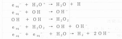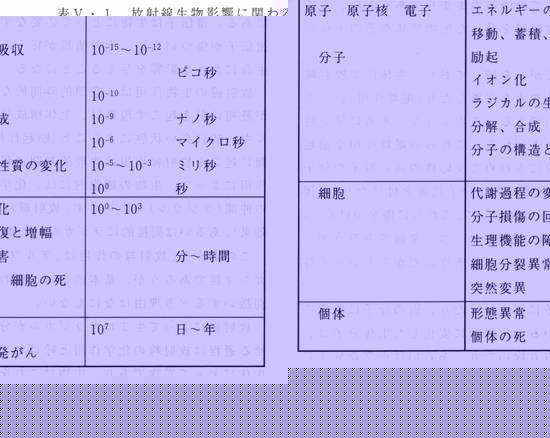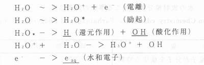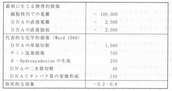 | X章 放射線生物作用の分子機構 X‐2放射線初期過程 荷電粒子が生体内の原子の近くを通過すると、粒子が作る電場が原子内の電子のクーロン場に急激な変化を与える。そのため原子内の基底状態にあった電子ははじき出されたり(電離)、高いエネルギーの準位に移される(励起)。電離されたり励起された分子はそれ自身でエネルギーを再配置したり、そのまま他の分子と反応する過程を経て活性化イオンやラジカルを生成する。この過程を生体の70%を占める水への放射線作用をみると理解しやすい。 表X‐l放射線生物影響に関わる現象とそれらの時問スケール ![]() 放射線初期効果は、放射線が生体物質を通過してからきわめて短い時間内に起こる現象であり、水の放射線分解を例に取ると、表V‐2のような時間スケールで起こる。 表X‐2 水の放射線分解で起こる事象の時間スケール (Radoation Chemistry,edts.Edts"Farhataziz and Rodgers より改表) ![]() 動物軟組織の約80%は水である。放射線が生体に働くときには、直接生体を構成する分子を不活性化(傷をつける)する場合と、水の照射によって生じたラジカルが生体構成分子を不活性化する場合がある。前者は放射線が直接生体高分子を不活性化するであり、直接効果と呼ばれ、後者は水のラジカルによる間接的な反応であるので間接効果と呼ばれる。実際には、生体に対する影響は、直接効果、間接効果の両方が作用していると考えられるが、放射線の種類による効果の違いや、放射線効果がさまざまな物理的・化学的条件によって異なる現象(修飾効果とよばれる)は間接効果によって説明されている。 放射線はその軌跡(Track)に沿ってエネルギーを周辺の水分子に与える。水分子の電離や励起を起こすに必要なエネルギーは100eVより小さく平均して30-40eVである。この領域の大きさのエネルギー吸収により生じる初期生成物の集まりをスパーとよぶ。 水の放射線分解はあらまし、次のような過程を経て起こる。 放射線のスパー内で最初に生じる生成物は、H3O+, OHラジカル、水和電子eaq-であり、次のような過程を経て作られる。eaqは、H3O分子の正荷電のぶん囲気をeのまわりに配向させて存在する、寿命のかなり長い(10-6秒)電子である。 ![]() さらに、水和電子とOHラジカルは次のような反応を介して、過酸化水素H202やOHラジカルなどを生成する。 ![]() 細胞内で、生体物質に反応して、その働きを失わせたり(失活)化学的な構造を変化ざせるのは、主に、上のような反応で生まれたOHラジカルである。 100eVのエネルギーが吸収された時に生じるラジカルの数をラジカル生成のG値(Gvalue)といい、GOH、GH、Geという風に表現される。それらの、細胞内でのおよその値は次のようである。 GOH=2.8 GH=0.6 Ge=2.7 表X‐3 1Gyの低LET放射線を受けた細胞核内で起こる変化 3) ![]() これらは、pH3−11の純枠な水の中での値である。細胞核内でも、同じような効率でOHラジカルが生成されたとすると、1Gyの吸収線量により直径l0μmの細胞核内では、およそ90,000個のOHラジカルが生成されることになる。 X線のような低LET放射線を照射された細胞核に生じる“きず”がどのくらいあるか、そのおよその数は表X‐3に示したようになる 3)。 |