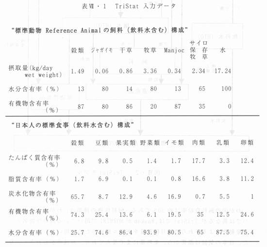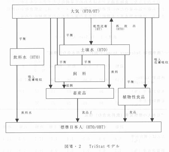 | Z章 トリチウムの環境動態と人体影響 Z‐3トリチウムの環境動態 Z‐3・8 トリチウムの環境動態モデル:どのようにして人体に取り込まれるか Z‐3・8・1何故モデルが必要か 人工的に作られたトリチウムが環境中に放出されるのは、トリチウムを使用している施設から、1)大気圏に放出される、2)地中埋没などにより地圏(地中)に放出される、3)排水などとして、河川や海(水圏)に放出される場合に分けられる。少量の汚染物質が、一時的に発生源から放出された場合には、その汚染物質は、周辺環境中に広がっていき、最初の汚染場所では、汚染濃度が低くなっていくのが普通である。しかしながら、一定の発生源から、絶えず、汚染物質が発生している場合には、そこに住む人は絶えず、汚染物質にさらされることになる。現に我々は、化石燃料を燃やすことにより生じる炭酸ガスや化学汚染物質による恒常的な地球環境の悪化の中で生活している。 将来、核融合炉を実用化したとき、核融合炉から、あるいはそれに関連した施設から、環境中ヘトリチウムが放出することは避けられないであろう。では、その環境や人への健康影響はどの程度のものなのか、許される程度のものであるのかどうか、それらを明らかにする前提として、トリチウムの環境中での挙動や、人への取り込み量をあらかじめ評価しておくことは、まずしておかなければならないことである。 Z‐3・8・2 トリチウムが定常的に放出ざれているときの環境挙動モデル トリチウムは水素の同位体であるから、地質学的な時間のスケール、すなわち1万年とか、l億年とかの時間のスケールで言えば、われわれ人類の生存に必要な物質に含まれ、人体と環境中を行き来する水素の中に、一様に分布するようになるに違いない。しかし、これは、大阪湾で流したコップー杯の氷が、太平洋の水に一様に混じるまでの時間をスケールにするような話であり、それまでにトリチウムの放射能は滅衰してしまい、そのリスクを問題にする必要はなくなるだろう。ここでは、あるトリチウム発生源があり大気中に、一定の割合でトリチウムを放出している場合を考えることにする。地中への放出も、廃棄物の処理の段階で、将来は間題になるが、環境放出として最も大きい役割を果たすのは、大気中への放出である。 HTとHT0が大気中に定常的に放出された場合、大気中のトリチウムは乾性沈着(Dry deposition)と湿性沈着(Wet deposit1on)と呼ばれる、二つの沈着現象によって、地表の植物や土壌に移行する。これらの、沈着の意味をここで解説しておく。HT0(空気中トリチウム水蒸気)の湿性沈着とは、雨や、雪、霜、露などとして、すなわち水や氷として、地上の植物、上壊などにトリチウムが沈着することであり、乾性沈着とは、トリチウム水蒸気が、直接、植物や土壌中の水と入れ替わったり、表面に吸着する現象である。HT(トリチウムガス)の場合には、湿性沈着はなく、乾性沈着のみで、このときは、土壌中のトリチウム酸化菌や地表の地衣類などがトリチウムガスを取り込む作用により、トリチウムを沈着すると考えられている。これらの生物は、氷素ガスを酸化し氷に変える役割をするヒドロゲナーゼと呼ばれる酵素をもっているからである。トリチウム走常放出峙の被ばく線量許価は、低線量の被ばくを長期間にわたって周辺住民がこうむるという点で、重要である。事故などで一時的に大量のトリチウムが放出された場合であれば、食物連鎖を介しての長期被爆よりも、いかに早く発生源から退避するかということが主な問題になる。 さて、どのくらいの放射性物質が、どのように放出されるかという仮想的な状況を、放射性物質放出のシナリオとモデル屋は呼んでいる。トリチウムの環境中での振る舞い(動態)を数学的に表現したものを“トリチウム環境動態モデル”と称する。 定常時放出モデルでは、まず最初に大気中のHT0、HT濃度分布が計算されるが、放射能雲(プルーム)の拡散、すなわち放射能濃度の、放出源からの距離に応じた変化は、ガウス分布で近似されるのが普通である9)。ある地点での平均的な大気中トリチウム濃度は、その期問の平均的な気象条件(風向、風速、大気安定度)によって決まる。この気象条件を、実際の気象観測のデータを使った場合と、単純化した条件を想定する場合とで、計算の面倒さは違う。大気中のトリチウムがどのように、食物連鎖を介して、最終的にどれだけの量が人の体内に取り込まれるかを評価することが、環境トリチウムのリスク評価のために、まず行うべきことである。 以下、最近開発された、TriStat(Tritium dose assessment for stationaryrelease)のあらましと、それを使って得られた結果について述べる 10)。 個々人についての食物連鎖をすべて考慮することは不可能であるから、日本人なら日本人の、ドイツ人であればドイツ人の、平均的な飲食物をもとにして、食物運鎖を考えることになる。日本人の場合には、“標準日本人”と、日本