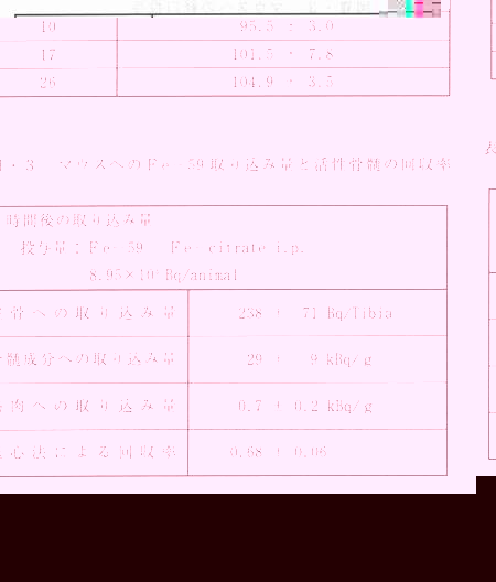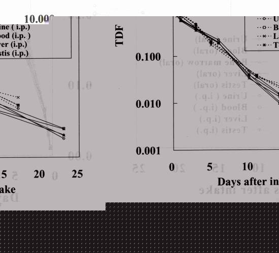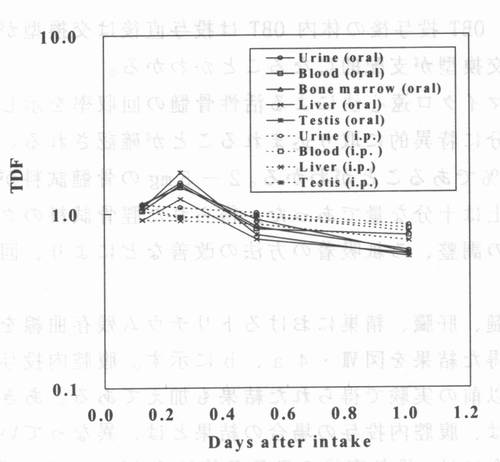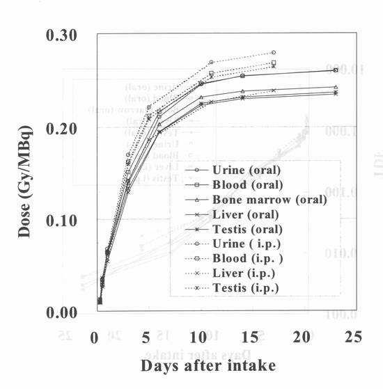 | Z章 トリチウムの環境動態と人体影響 Z‐4 トリチウムの被ぱく線量評価と人体影響 Z‐4・2・3マウス動物実験で明らかになったこと 表Z‐2は、トリチウム標識アミノ酸を投与した後のマウス体内の0BTについて、非交換型の0BT量を評価した結果である。 表Z‐2トリチウム標識アミノ酸を投与したマウスでの非交換型0BTの割合 ![]() 表Z‐2から、0BT投与後の体内0BTは投与直後は交換型が残っているが、時間とともに非交換型が支配的になることがわかる。表Z‐3に、マイクロ遠心法による活性骨髄の回収率を示してある。まず、Fe-59が骨髄成分に特異的に取り込まれることが確認される。また、活性骨髄の回収率は約68%であることがわかる。2−5mgの骨髄試料が採取可能であるので、線量評価上は十分な量であった。得られた脛骨試料のクリーニングの方法や、遠心時間の調整、ろ紙吸着の方法の改善などにより、回収率の向上は可能である。 尿、血液、骨髄、肝臓、精巣におけるトリチウム残存曲線を、経口的およぴ腹腔内投与後に得た結果を図Z‐4a、bに示す。腹腔内投与の1日以後の結果については、以前の実験で得られた結果も加えてある。あきらかに、経口投与の場合の結果は、腹腔内投与の場合の結果とは、異なっている。すなわち、腹腔内投与の場合には、投与直後のTDF値は0.92-1.12 の間に分布し、次第に対数的に滅少する。これとは、対照的に、経口投与の場合には、TDF値は最初急激に増加し、その最大レベルは工2を越え、その後時間とともに滅少する。このとき最大のTDF値は、1.2-1.7 に分布し、精巣での値がもっとも大きい。また、経口的に投与されたトリチウムの投与後1日までの初期体内半滅期は腹腔内投与の場合に較べて短い。経口的に投与されたトリチウムの方が、体内成分に弱く結合しているようである。 摂取の経路による、トリチウム残存曲線の違いは、投与後1-14日目の間でも、明らかである。投与後6日目までは、経口投与されたトリチウムの滅少率は、腹腔内投与の場合よりも緩やかでその後はより急激に滅少する。骨髄でのトリチウム残存曲線は他の組織や体液成分のものによく似ている。得られたトリチウム水経口投与後のTDF値のばらつきから、動物間のばらつきが、投与後6峙間目あたりでもっとも大きいことがわかった。このような動物間のばらつきは、腹腔内投与の場合には見られないことであり、胃腸管から血液への移行率に動物間のばらつきがあることを示している。胃腸管の内容物の量に関係しているのかもしれない。しかし、投与後のトリチウム残存曲線は時間0でほぼ1に外挿されることからして、摂取されたトリチウム水は、きわめて効率よく胃腸管から吸収されているといえる。 トリチウム水投与後の線量蓄積曲線を図Z‐5に示す。腹腔内投与後の線量蓄積は高いものから尿、血液、精巣、肝臓の順になっている。骨髄への線量は尿と血液への線量より小さく、肝臓への線量よりも高い。一般的な傾向として、腹腔内投与の場合の線量蓄積は経口投与の場合よりも早い。このことは、経口投与の場合のTDF値が腹腔内投与の場合のTDF値よりも低いことに対応している。 ![]() 図Z‐4aトリチウム投与後の体内濃度(3時間−1日後) これまでに行われた研究で、トリチウム摂取直後の体内トリチウム分布に関する研究は少ない28)。トリチウム経口摂取後のTDF値が一時的に1よりも大きくなる。したがって、単純な指数関数で近似されるトリチウム急性被ばくの場合の線量評価法に若干の修正が必要になるかもしれない。トリチウム摂取後1‐5日目での、投与法によるトリチウム残存曲線の違いがなぜ起こるかについては、まだよくわからない。もし、体内の軟組織中のトリチウム濃度と体液成分のトリチウム濃度が平衡状態にあるならば、トリチウム残存曲線は、両者の場合同様になるはずである。採取した組織以外のところに大きなトリチウムプールがあり、ここに一時的にトリチウムが移行するという説明は魅力的であるが実証はされていない。 トリチウム水摂取の場合に線量評価では通常体内水成分のトリチウムは様々な組織や器宮内のトリチウム濃度が急速に平衡に達すると仮定する28)。経口摂取の場合線量蓄積は、組織器官の種類に僅かにせよ依存している。その違いは10%前後であり、放射線防護上特に間題になる差ではない。しかし、0BT摂取の場合には、この違いはより顕著になり放射線防護上の意味が出てくる。 トリチウムによる発ガン効果は放射線防護上の大きな関心事である。それぞれの臓器や組織の放射線感受性は、異なるので、発ガンの危険度についての重みも臓器や組織により異なる。赤色骨髄については、ICRPは0.12という組織荷重係数を与えている29)。マウスを使った発ガン実験は、我が国で広島大学のグループにより精力的に行われてきた 30、31、32)。 図Z‐4b トリチウム投与後の体内濃度(投与直後23日後) 正確な骨髄線量を許価することは、たとえば、白血病などの発現に対するト