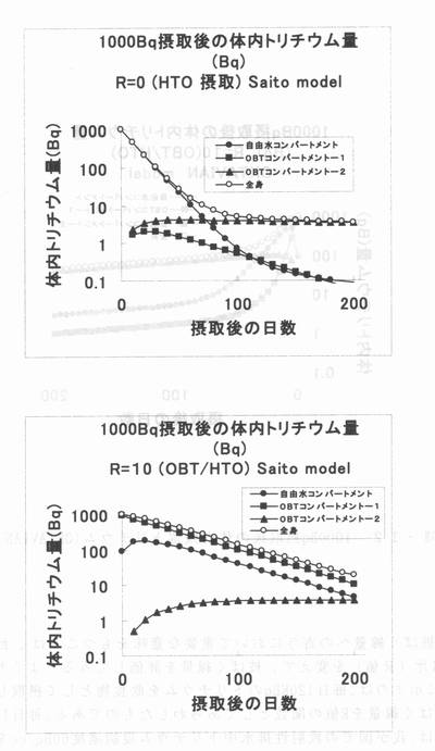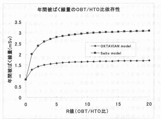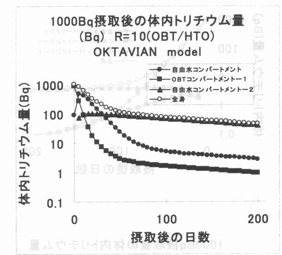 | Z章 トリチウムの環境動態と人体影響 Z‐4 トリチウムの被ぱく線量評価と人体影響 Z‐4・3・5 0BTの直接摂取を考慮した3コンパートメントモデル モデルの有用性は、そのモデルで使われる水素代謝についてのパラメーターがどのくらいの確かさで対象集団を代表できるかということと、個々の内部被ばくのケースについてのパラメータ修正の容易ざできまる。ETHモデルをわれわれ日本人の場合に適用しようとする時にはこれらの点で以下のような難しさがある。 ETHモデルではICRP標準人における水素動態のパラメータを基礎にしており、日本人にそのままあてはめることは出来ない。また、ETHモデルの中で用いられる水素原子の移行定数の決定過程は3コンパートメントモデルに較べて複雑である。実際ETHモデルで移行定数を決めるために行われたように、TFWTの残存曲線を4成分以上の指数曲線の和として近似することはモデルを複雑にし得られるパラメータの値の不確かさを増すだけで、実用状の利益は少ない。 実用上は個々の被ばくケースについての被ばく線量許価を容易に行えるようなモデルを作っておく必要がある。すなわち、それぞれのケースに応じてモデルのパラメータを容易に修正して便えるようにしておくことが望まれる。この点で3コンパートメントモデルは4コンパートメントモデルに較べて格段に取扱が容易である。 このようなトリチウム体自動態モデルとして、体内水素収支にもとづいた3コンパートモデル(Modified three compartment model MTCモデル)23)が提唱された。 MTCモデルの基本的構成と最終的に決定されたパラメーターの値を図W‐9に示す。体内TFWT(体内自由水)コンパートメントをTFW、第一のTBWH(組織結合水)コンパートメントをTBW-1、第二のTBWHコンパートメントをTBW2と書いてある。飲食物中のFWHはすべて直接体内自由水コンパートメントに取込まれる。一方飲食物中の有機結合型水素(0BH)の一部は直接有機結合型水素として0BH−1コンパートメントに取込まれ、:一部は体内取込後直ちに酸化され自由水コンパートメントTFWに取込まれる。 ![]() 図Z‐9 MTCモデル(Saito Model )図中の数字は移行係数 MTCモデルとは独立に、吉田により開発されたOKTVIAN モデルがある(図Z‐10) 45)。このモデルは、トリチウムを夕一ゲットして用いるコックロフトウオルトン型加速器0KTAVlAN周辺でトリチウムを吸入、度膚吸収などで摂取した作業者の尿中トリチウム残留曲線を説明するために、開発されたもので、2番目の0BTコンパートメントと自由水コンパートメントとの間でトリチウムの移行がなく、二つの0BTコンパートメント問でトリチウムの移行があるとしている点で、MTCモデルと異なる。また、0BTコンパートメントから自由水コンパートメントヘの移行率は、MTCモデルに比べて約10倍大きい。 ![]() 図Z‐10 OKTAVIAN モデル(Yoshida Model) 図中の数字は移行係数 また、MTCモデル記述される0BT濃度は全身の平均濃度であるが、OKTAVIANモデルでは尿中0BTとFWTでの比濃度(Bq/g dry)の変化をもとにして、コンパートメント間のトリチウム移行係数を決めている。そのために、体内に長期残留する0BT成分の被ばく線量への寄与がMTCデルに比べて低く見積もられる。実際、Fig‐3.3.7に示すように、定常的にトリチウムを摂取したときの年間被ばく線量を較べて見ると、R値(0BT/HT0比)が1より大きくなると、MTCモデルでの評価線量はOKTAVIANモデル(Yoshidaモデル)での評価線量よりも大きくなる。 R=20では、その差は約2倍になる。 図Z‐11、図Z‐12に示すのは、1kBq(1000Bq)のトリチウム水を一回摂取した後の体内濃度をそれぞれのコンパートメントについて、上記二つのモデルを用いて計算した結果である。HT0のみを摂取した場合、体内の総トリチウムは最初、自由水成分トリチウムの滅少を反映して、指数関数的に滅少するが、やがてHT0から0BTへの転化により、0BTレベルが高くなり、この長期残留型0BTの変化に支配されるようになる。この傾向はどちらのモデルでも変わらない。 ![]() 図Z‐12 1000Bq摂取後の体内残留トリチウム(OKTAVIANモデル) ![]() 0BTが被ばく線量への寄与において重要な意味をもつことは、飲食物中の0BT/FWT比(R値)を変えて、被ばく線量を評価してみるとよくわかる。Fig‐Z‐13に示すのは、毎日120KBqのトリチウムを飲食物として摂取したときの、年間の被ばく線量をR値の関数としてあらわしたものである。毎日120KBqのトリチウム量は、我が国での放射性排氷中トリチウム規制濃度60Bq/ccをもつ飲料水を毎日2リットル(日本人の平均的な摂取量)飲んだ場合のトリチウム量に相当する。 MTCモデルでの計算によると、R値が大きくなり、取り込みトリチウムのほとんどが0BTである時(R=20)の被ばく線量はHT0のみの摂取(R=0)に較べて約3倍になる。我が国の、排氷中0BT規制濃度は、HT0規制濃度の1/3であるが、その妥当性を裏付ける計算結果である。武田らの動物実験の結果も、0BTの線量寄与はHT0の約3倍であることを示している。一方、0KTAVlANモデルで同様な計算をすると、R値が大きくな