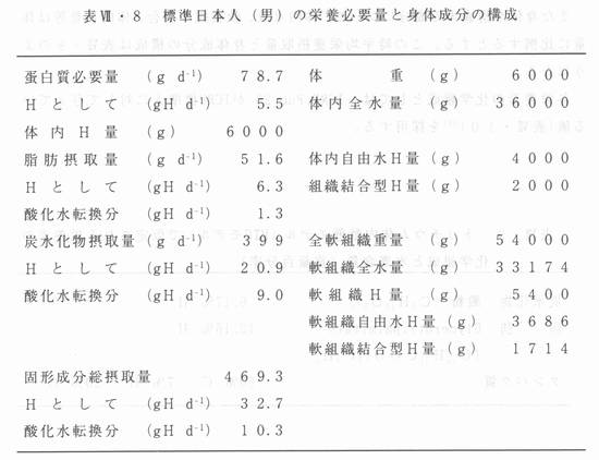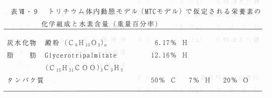 | Z章 トリチウムの環境動態と人体影響 Z‐4 トリチウムの被ぱく線量評価と人体影響 Z‐4・3・6 水代謝に関する標準日本人の想定条件 定常被ばくは、一定のトリチウム環境下に長期間生活している場合の被ばくであって、大気中のトリチウムが一定の比放射能値をもって存在している状況下での内部被ばくである。この場合の平衡条件下では環境中、飲食物中およぴ人体中のトリチウム比放射能は一定の比例関係を保つので人体の内部被ばく線量は環境中のトリチウムの比放射能をもとに:一義的に評価することが出来る。 急性被ばくは短期間にトリチウムを吸入、皮膚からの吸収、飲食物からの摂取等により体内に取込んだ場合の内部被ばくである。この場合は体内に残留したトリチウム量の時間的変化についての情報を得てそれをもとに内部被ばく線量を評価しなけらばならない。 以下斉藤によるMTCモデルをもちいて内部被ばく線量、体内トリチウム残存量、飲食物中のトリチウム濃度限度を予測する具体的方法について述べる。 モデルを適用して被ばく評価を行うには、ヒトの水収支のデータがまず必要である。人体内の氷素原子の代謝速度(Turn over rate )は水素原子の存在様式、すなわちその化学形や存在する場所に大きく依存する。体内トリチウムの線量評価の目的からすると、そのような化学的存在様式や分布場所の違いを可能な限り単純化して近似的に扱わなければならない。 トリチウム体内動態モデルでは体内でのトリチウム分布の局在については考慮しないで人体内のコンパートメントはそれぞれブラックポックスとして扱われる。MTCモデルではETHモデルでの場合と同様に人体内の水素原子のコンパートメントとしてTEWHコンパートメントと0BHコンパートメントを仮定する。MTCモデルとして必要なパラメーターは3つのコンパートメントの水素原子のプールサイズ(コンパートメントの大きさ)、各コンパートメントヘの水素原子の単位時問あたりの取込量及びコンパートメント間の氷素原子の移行率(移行係数)である。これらパラメーターのうち、コンパートメントの大きさとコンパートメントヘの水素原子の取込量は人体のTFWHと0BHのプールサイズ、およぴ取込まれるTFWHと0BHの量と1次的な関係にある。そこで、第一段階の作業は標準日本人に於ける人体中水素原子の構成と水素原子の取込量を明かにすることにある。標準日本人としては田中らによって設定されたもの(男)を採用する。 ![]() また身体を構成する成分について、体内水量、軟組織の割合、体内H量等は体重に比例するとする。この時平均栄養摂取量と身体成分の構成は表Z‐9のようになる。 各栄養素の化学組成としてはICRP Pub23がICRP標準人に対して与えている値(表Z‐10) 35)を採用する。 ![]() 食物に含まれる自由水には調理に便われる水と、もともと含まれていた水の2種類があるがこれらの区別はしないで一括して食物含有水として扱うことにする。食物中の目由水の含有率は70%と仮定する。食物中固形成分の摂取量の合計は469(gd-1)であるのでl日当り取込む食物含有水量は1094gとなる。また調理水を含めた食物摂取量は1563(gd-1)食物含有水量、食物酸化生成水、呼吸や皮膚からの摂取水の合計を上記の1日当りの全摂取水分量から引いた1196(gd-1)がミルク、コーヒー、茶、ビール、酒等から摂取される自由水の量である。これをまとめると表Z‐10のようになる。また摂取源別に水素の摂取量と各コンパートメントヘの取込み量を整理すると表Z‐11のようになる。 ![]() ![]() |