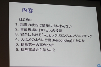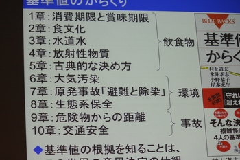 開会のあいさつ 実行委員会委員長 辻本 忠 NPO安全安心科学アカデミー理事長 (挨拶内容は写真をクリックしてください)日本保健物理学会企画s テーマ1:福島復興に向けた取り組みと放射線防護上の課題Ⅲ ―福島県における住民の線量評価 ― ![]() 座 長 :山西弘城 近畿大学原子力研究所 教授 演 題 :1.土壌に分布する放射性セシウムに対する公衆の線量換算係数 (写真をクリックすると抄録が閲覧できます)佐藤大樹 日本原子力研究開発機構 研究副主幹 質疑 ![]() 2.日常生活における個人線量の活用例 ①川俣町における報告 ![]() 細野 眞 近畿大学高度先端総合医療センター 教授 ②伊達市における報告 (写真をクリックすると抄録が閲覧できます)菅野康弘伊達市役所健康福祉部健康推進課 質疑,3.住民の個人線量の推計 (写真をクリックすると抄録が閲覧できます)矢島千秋 放射線医学総合研究所 主任研究員 質疑NPO安全安心科学アカデミー企画 特別講演:最近の安全規制と規制の現状 ![]() 座 長 :飯田敏行 大阪大学 教授 ![]() 講演者 :松本武彦 原子力規制庁 放射線規制室 放射線検査管理官 (写真をクリックすると抄録が閲覧できます) 近畿大学原子力研究所 企画 テーマ2:近藤宗平先生 追悼講演 ― 近藤宗平先生は我々に何を残したか ― ![]() 挨 拶 :伊藤哲夫 近畿大学原子力研究所 所長 ![]() 座 長 :小田啓二 神戸大学 教授 演 題 :1.近藤先生とガラス線量計 (写真をクリックすると抄録が閲覧できます)細田敏和 ㈱千代田テクノル 会長 2.近藤先生と放射線遺伝研究 (写真をクリックすると抄録が閲覧できます)藤川和男 近畿大学 教授 3.近藤先生と放射線ホルミシス研究 ![]() ![]() 田ノ岡宏 元国立がんセンター 4.近藤先生とNPO安全安心科学アカデミー ![]() 辻本 忠 NPO安全安心科学アカデミー 理事長 大阪科学技術センター企画 (写真をクリックすると抄録が閲覧できます)挨 拶 :山本幸佳 大阪大学名誉教授(電離界に関する調査研究委員会委員長) テーマ3:リスクと確率について考える ―ひとりひとりがリスクと向き合うために― ![]() 座 長 :竹下達也 和歌山県立医科大学 教授 ![]() コメンテーター :甲斐倫明 大分県立看護科学大学 教授 演 題 :1.科学情報のリスクコミュニケーションにおける課題 (写真をクリックすると抄録が閲覧できます)広田すみれ 東京都市大学メディア情報学部 教授 2.安全と基準~環境分野と放射線防護分野におけるリスク受容とその管理~ ![]() (写真をクリックすると抄録が閲覧できます) 村上道夫 東京大学生産技術研究所 特任講師 質疑 ![]() 電子科学研究所 企画 ボイリング・ディスカッション セッション1―福島原子力発電所で何が起こったかー ![]() 司 会:豊田亘博 大阪大学特任研究員 講演者:吉澤厚文 原燃輸送㈱ 社長 ![]() ![]() 質疑応答![]() 保物セミナー2014 記念撮影 *講演内容詳細については保物セミナー2014要旨集をご覧ください ボイリング・ディスカッション2 内容ダイジェスト版 (大きめのサイズはこちら) ![]() ![]() ![]() ![]() ![]() ![]() ![]() ![]() ![]() ![]() ![]() ![]() ![]() ![]() ![]() ![]() ![]() ![]() ![]() ![]() ![]() ![]() ![]() ![]() ![]() |