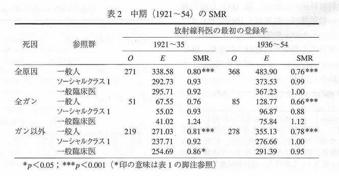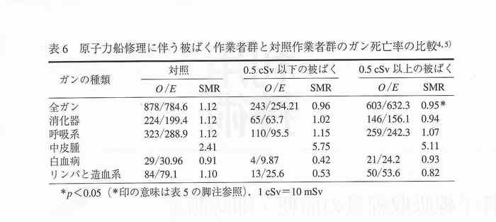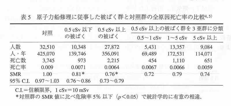 | 1 はじめに JCOの臨界事故では,事故現場にいた作業者3人のうち,2人が約18Gyと約8Gyの放射線被ばくで亡くなり,l人は約3Gyの被ばくで助かった。これは,「放射線の急件被ばくの場合,50%致死量は約5Gyで、3Gy以下なら急性死亡の危険はない」という経験法則が正しいことを証明した。 3Gy以下の放射線被ばくなら,成人の場合,たとえ一時的に身体の被ばく部位に障害が起こってもほとんどは正常に治る。しかし,胎児の場合は,原爆放射線1.4Gyの急性被ばくで,重度精神遅滞症が70%の高頻度で発生した。ただし,この精神遅滞症も,0.2Gy以下の被ばく線量では,被ばくしない場合に発生する頻度まで低下し,放射線の危険はなくなった。ところが,0.2Gy以下の放射線被ばくは胎児に異常を起こさない事実I)は,一般には知られていないようである。JCO事故の直後,事故現場から遠く離れた所に住んでいた妊娠女性の多くが,放射線の扱ばくで胎児に異常が起こるかもしれないと夜も眠れないほど心配したと聞いた。 放射線は徴量でも危険であるという誤解のな原因は,放射線の徴量の洩れも,放射線の事故だと週大に取り扱うマスコミなどの不誠実とも青える対応によっていると思われる。このような実例が最近起こった。 平成14年4月4日,大阪の河内長野市の日本農薬総合研究所で,廃液処理施設の配管の徴小な損傷で,放射性炭素が徴量外部に浅れた。新聞は,「放射性廃棄物施設で爆発」などの見出しで誇大報道をした。このとき洩れた放射能の量は,法的に安全であると許容されている範囲内であった。しかし,法的規制以内の放射性物質の洩れであったという事実を,取り締まり責任当局は明言しなかった。これらの結果,河内長野市では住民の間に放射性物質の便用そのものへの恐怖が広がった。 放射線は,かなり浴ぴても,痛くも痒くもない。放射線が怖いのは被ばくによる健康影響の程度で決まる。被ばく線量がわかれば,どの程度の健康影響が起こるかは,放射線の健康影響の調査資料と放射線の生物影響の研究資料から,正しい予測が得られるはずである。しかし,最近までは,放射線の健康影響の資料は,原爆被ばくの資料以外は,限られた資料しかなかった。原爆の資料は,被ばく線量が0.2Sv以下の低線量では信用できない。JCO事故と河内長野の放射能洩れの場合には,原爆影響の資料は道用できない。幸いにも,最近,英国放射線科医の過去100年の健康調査の結果と米国の原子力船修埋作業中に徴量被ばくした作業者大集団の便康調査の結果が報告された。これらの調査結果は,JCO事故と河内長野の放射能洩れの場合に適用できる。本稿では,この二つの資料の概要を紹介する。 2 適量の放射線被ばくが英国放射線科医の寿命をのばした 論文‘100years of observaion on the British radiologists:morality from cancer and other causes 1897~1997’by A.Beington,S.C.Darby,H.A.Weiss and R.Dollは2001年6月発表された2)。 これは放射線の健康影響に関する論文として今後長く引用されると恩われる。この論文には,1897〜1997年の100年間にわたって,英国放射線科医2,698人の死亡率と,放射線を浴ぴなかった一般の英国男性,ソーシャルクラス1の男性,または一般臨床医男性の死亡率を比較したものである。調査は,放射線科医が初めて放射線学会に登録した年によって4期に分けてなされた。 2.1死亡率の比較(初期1897-1920) 男性放射線科医の観察死亡数(0)と放射線を浴ぴない参照群(一般男性,ソーシャルクラスlの男性,または一般臨床医男性)の死亡率を用いて計算する期待死亡数(E)の比を,SMR(stndardized mortality ratio:標準化死亡比)とよぶ。Eは次式で求める: E=n1P1+n2P2+n3P3+・・・・+nkPk (l) ここに,n1は放射線科医集団のi番目の年令階級の人数,P1は参照集団の1番目の年令階級の死亡率,kは調査集団で採用した年令階級数である。SMRがlより大きいか小さいかで,放射線科医の死亡率が参照群より高いか低いか判断する。表lに初期(1897−1920)に最初の登録をした放射線科医の観察死亡数と期待死亡数の比SMRが,死因の違いによってどのように変わるかを示す。これによれば,ガンによる死亡では,放射線科医の死亡率が一般臨床医の1.75倍ソーシャルクラスlの1.45倍で,いずれも統計的に有意に高い。一般人と比べても,有意の違いではないが,放射線科医のガン死亡率は高い。これらの事実は,1920年以前に最初の登録をした放射線科医は,臨床現場で,かなりの量のX線を毎日のように被ばくしたためであることは間違いない。ところが,表1によれば,ガン以外の原因による死亡では,放射線科医の死亡率は,一般臨床医の死亡率の0.86倍で,これは統計的に有意の滅少である。一般人やソーシャルクラス1に比べても,放射線科医のガン以外の死亡率は,有意の違いではないが低い(表l)。すなわち,ガン以外の原因による死亡では,放射線科医が浴ぴた大量のX線は,死亡を防ぐ健康増進効果があったことを示唆する。 |