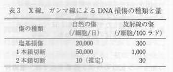 はじめに ルネッサンス歓人には,外見的にわかるような発生異常の増加は認められなかった。しかし,重い精神発達遅延症の頻度は被ばく量1Gyの胎児では60%以上というおそるべき高頻度で祭生した(図2)。とくに妊娠8−15週に被ばくした場合がハイリスクである。しかし,このハイリスク期の被ばくでも,被ばく量が低下するとリスク激減し,20ラド以下では対照りスクと有意の差はない。(図2)。妊娠26遇以降の胎児は1Gy以上、被ばくしても精神達遅延症りスクはゼロである(図2)。 以上の事実があるにもかかわらず,9月30日の東海村のJCOのウラン臨界事故では,東海村や周辺の地区の妊娠している多くの人が深刻に胎児の異常を心配していると間いて暗然となった。チェルノブイリ事故による放射性降下物に汚染された西欧では,恐怖のあまり数万人の妊娠母親が人工流産をした1)。放射線過剰規制の弊害は放射線の害より桁違いに大きい。風評被害の事実にどう対処するか,放射線防護専従者の責任は大きい。 ![]() 被ばく細胞のアボトーシス;p53遺伝子は放射線に対する胎児の守護神 普通のマウスの妊娠中期にX線2Gy照射すると.60%が胎内死亡し,生き残った仔の50%に発生異常が起こる(図3)。p53遣伝子が欠損したノックアウトマウスは,2Gy照射しても,10匹のうち1匹しか死亡しないが,生き残った仔の殆ど(80%)が発生異常を持って生まれる(図3)。放射線に強いp53ノックアウトマウスが発生異常を普通マウスより多発するのはなぜか?これはつぎの仮説で説明できる。普通のマウスの細胞では,放射線によるDNA損傷が治らないと,p53遺伝子の生産するp53タンパク質分子がDNA損傷を見つけて自爆装置をオンに作動させるため,傷つきの不良細胞の大部分が自爆し組織から排除され,死亡率も高い。このような細胞の自爆をアポトーシスという(図4)。このアポトーシスのおかげで,放射線障害のかなりの部分が被ばく組織から排除されるので,生き残った仔の発生異常リスクは,被ばくしない場合の20%より30%多いに過ぎない(図3)。これに反し,ノックアウトマウスでは,被ばくしてもアポトーシス頻度は上昇しないので胎内死亡率は低いが,生き残った仔の殆どが発生異常を持って生まれる図3)。この仮説はつぎの実験結果で支持された。X線照射直後に被ばく胎児の組織標本を調べたところ,普通マウスでは自爆細胞が塊になって組織外に廃棄されていた。ノックアウトマウスでは,自爆細胞数はX線照射後全く増加しなかった。p53遣伝子は胎児を放射線リスクから守護してくれる。 ![]() 少しずつの長期照射の場合,放射線は発がん毒性が消えて安全である マウスにトリチウム濃度の違う飲料氷を生涯与える。高濃度トリチウムは強い胸腺腫瘍誘発毒性を示すが,低濃度にすると胸腺腫瘍の発生率はゼロになる(図5)。腫瘍リスクゼロの安全トリチウム濃度は,線量率でいえば,年間30ラド以下の場合である(図5)。 ラットにラドン濃度の違う空気を吸入させると,高濃度では肺癌が多発する。低濃度の100WL(1WL=0.01ラド/時)で全量25WLM(19ラド)を4カ月に分散して与えても発がん率が2%で,対照より有意に高いが,同じ25WLMを超低濃度の2WLで18カ月に分散して与えると,発がん率は対照区と有意差がない(図6)。 図6の実験結果は,ラドンからでるα線でさえも,線量率を下げると発がん毒性が消えることを意味する。放射線リスクの評価では,放射線によるイオン密度の大小よりも,線量率の高低のほうが重要だということである。従って,シーベルト単位でα線:γ線のリスク比を20:1に,科学的根拠なしに決めているのは,放射線リスクの正しい尺度としてはたいへん不都合である。21世紀の放射線防護のためには,この単位の厳しい再評価が必要である。シーベルト単位は一利百害の単位である。 DNA損傷の自然発生率は電離放射線によるものより桁違いに多い 表2と表3に示すように,自然に発生するDNA損傷の頻度は放射線少量照射した場合のDNA損傷率より桁違いに大きい。自然リスクの主役は活性酸素,太陽紫外線,熱エネルギーである。化学物質も多様なDNA損傷を誘発する。しかし,DNAの2本鎖切断(図7)は活性酸素や化学物質では誘発されない。DNA2本鎖切断は電離放射線特有の損傷であり,電離放射線を特別に怖がるべき科学的根拠にされ,2本鎖切断を高密度で誘発するα線のリスクをX線やγ線より20倍怖がりすぎてもよいという考えの根拠にされてきた。しかし,次節に述べる証拠によって,DNA2本鎖切断が増殖中の細胞に自然に多発することが最近発見された。 ![]() DNA修復とアポトーシスの協調作業が低線量放射線リスクをゼロにする DNAに2本鎖切断が起こっても,そばに無傷の相同DNA鎖があれば,無傷のDNAから切断部に相当する部分を移植すれば修復できる。これは組換え修復と呼ばれる(図7)。この修復では,DNA鎖の1本を相手の鎖に組み入れなければならない。これには多種多様なタンパク質分子群の共同作業が必要で,修復完了までは時間がかかる1)。この修復作業の初期に必須であるのがRad51タンパク質分子である(図7)。 ![]() Rad51遺伝子