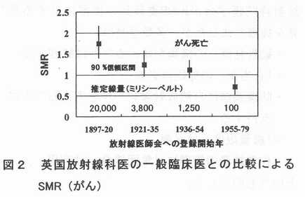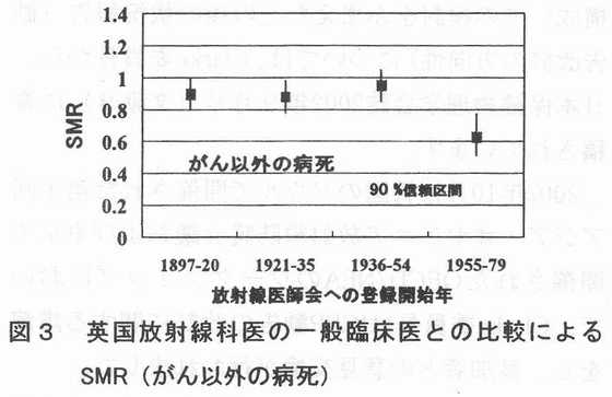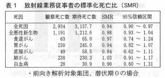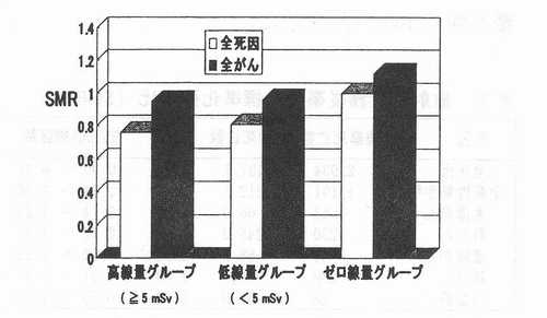 はじめに 現在、放射線防護においては、放射線による発がんのリスクが最重要視され、主に高線量率の放射線を被ばくした広島・長崎の原爆生存者の追跡調査結果をもとに定量的なリスク評価とそれに基づく線量規制が行われています。しかし、同じ被ぱく線量でも線量率によって影響の度合いが異なることが分かってきており、低線量率で長期間被ばくする放射線業務徒事者の疫学的調査によって、低レベル放射線の健康影響について科学的な知見を得る努力が国内外でなされています。第1部では、放射線業務従事者について日本および欧米で行われた主な疫学調査とその結果を紹介しますが、現在の線量限度以下の放射線被ぱくは、健康に対して検出できるような悪い影響はなく、反対に、低線量の場合には健康に良影響がある可能性さえ示唆しています。また、第2部では、国際放射線防護委員会(ICRP)のR.Clarke委員長の個人的な提案に始まる1990年勧告の改訂に向けての検討状況と今後の動向について紹介します。 第1部 放射線業務従事者の疫学調査 1.日本の原子カ発電施設等従事者の疫学調査 (財)放射線影響協会が科学技術庁(現在、文部科学省)からの委託により平成2年度から実施してきた原子力発電施設等放射線業務従事者に係る疫学的調査の平成12年(2000年)12月に公表された結果では、全悪性新生物の死亡率は、日本人男性一般と比ぺて増加は認められず、低線量域の放射線が悪性新生物による死亡率に影響を及ぼしているとの明確な証拠は見られないとされています(文献1)。表1に示すように、原子カ発電施設等で働く放射線業務従事者の標準化死亡比(SMR)は、目本人成人男子一般と比較して、むしろ低い結果となっています。なお、食道がんなど一部の消化器系臓器のがんによる死亡率が累積被ばく線量と有意な柏関が認められましたが、生活習慣などの交絡因子の調査により、喫煙、飲酒などの影響が強く示唆されました。 ![]() (注1)標準化死亡比(SMR):ある集団の観察死亡数と、その集団が標準集団と同じように死亡したと仮定した場合の死亡数(期待死亡数)の比を標準化死亡比(SMR)と言い、次の式で計算されます。 SMR=〈観察死亡数)/〈期待死亡数) (注2)交絡因子(confounding factor):今、知りたいと考えている要因(この疫学調査では放射線)と結果(この疫学調査では死亡)との関係をゆがめる第3の困子のことを交絡因子といいます。 2.米国原子カ船修理作業者の疫学調査 米国エネルギー省(DOE)がジョンズ・ホプキンス大学(G.M.Matanoski教授)に委託して行ったもので、1957年から1981年の間に、原子力艦船のオーバーホールを行った米国の2カ所の民間造船所および6カ所の海軍造船所で働いた約7万人の男性作業者を調査の対象としています(文献2)。放射化したコバルトー60のガンマ線による被ばくで、結果は、図1に示すように、放射線作業者の死亡率は、5mSv以上を受けた高線量グルーブ(27,872人)、5mSv未満の低線量グループ(10,348人)とも、同様の作業を行ったが放射線を受けなかった非放射線作業者(32,510人。死亡率は、標準とした米国人白人男子一般と同じ)よりも有意に低い結果です。高線量グルーブの全死因のSMRは、0.74(95%信頼区間:0.73〜0.79)で、低線量グルーブよりも低く、米国人一般と比較すると、24%も低い。また、全がんのSMRについても、非放射線作業者よりも放射線作業者の方が低いことが分かります。 ![]() 3.米、英、カナダの原子カ従事者の合同解析 国際がん研究機関(IARC)における米国、英国、カナダ3カ国の原子力施設従事者95,673人の疫学調査データの合同解析では、全がんによる過剰死亡リスクは認められておらず、リスク係数はマイナスとなっている(文献3)。白血病による死亡(総数119例)については、線量一応答関係に統計的に有意な傾向を示したとされていますが、化学物質への暴露が考えられる再処理施設で働いた400mSv以上の累積線量を持つ少数例(期待数2.3:に対しで観察数6例)に基づくものでした。 4.英国放射線科医の疫学調査 英国の放射線科医の100年に及ぶ追跡調査の結果が、2001年6月、英国の放射線医学雑誌に掲載されました(文献4)。初期の放射線科医のがん死亡率は高いが、放射線防護対策が講じられた1921年以降、がん死亡率は低下し、1955年以降は一般臨床医よりも低くなっています。がん以外の病気による死亡率については、被ぱく線量の大きかった初期においてさえ、一般臨床医と比較しても、むしろ低いという結果でした。調査報告の概要は以下のとおりです。 (1)調査の経緯 英国の高名な疫学者リチヤード・ドール卿らは、放射線科医のがんによる死亡に着目した調査を1956年に開始し、1921年より前に放射線科医に登録された者は、一般臨床医と比べて75%もがん死亡率が高いことを報告しておりました。その後、調査対象者を1979年までに登録された放射線科医に拡大し、今回、1997年1月時点での生死確認と解析が行われました。 (2)調査の対象 1897年から1979年の間に登録された2,698人の男性放射線科医を調査の対