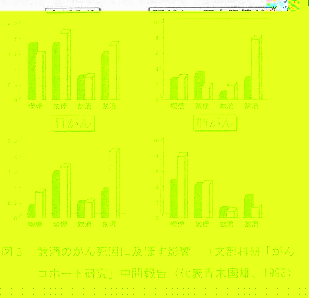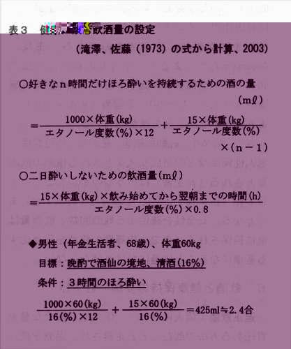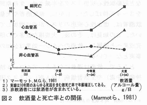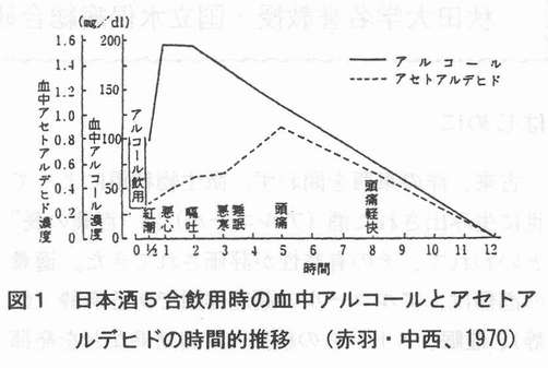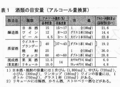 はじめに 古来、洋の東西を問わず、微生物利用によって世に生み出された酒(アルコール)は“百薬の長”といわれて、その有益性が評価されてきた。適量の酒類は、アルコールの薬理作用である麻酔(鎮静)、催眠、ストレスの緩和、栄養効果などを発揮し、哀歓の泉として人間の生活習憤に溶け込んでいる。 この卓効について、員原益軒の『養生訓』は、「酒は天の美禄なり。少し飲めぱ陽気を助け、血気を和らげ、食気をめぐらし、愁いを去り、興を発して、甚だ人に益あり。」とその極意を吐露している。教訓は「少し飲めば」と安心科学を唱導し、適量であれば、まさに“酒は百薬の長”となる。:幸い近年、適性飲酒は心臓病、がん、骨粗髪症、老化・痴呆などの発症リスクを低下させるへルシー効果のあることが分かってきた。その事始めは、1974年のKfatSkyら1)が明らかにした虚血性心疾患の予防効果である。全米健康栄養調査結果の再評価は、中等度の飲酒が非飲酒と比べて心筋梗塞など冠動脈性心疾患リスクを半減させ、生存期間を3〜4%伸ばした2)。しかし、非飲酒者や大量飲酒者は、虚血性心疾患のリスクが逆に増加していた。この知見は、その後、大規模な数多くの研究成果へと進展し、飲酒のへルシー効果は公知の事実となっている3)。 ところで、飲酒は過量になると、アルコール精神病(中毒)や生活習慣病(成人病)のリスク因子となることは周知のとおりである。しかし、酒を飲むこと自体が問題ではなく、どういう飲み方でへルシー効果を引き出すのかが肝要である。ここに、適正飲酒の安全性を見極め、天の美禄から健やか長寿を希求したい。 1.暮らしの酒学 1.1薬効の背景 酒(アルコール)とは:酒類はアルコールそのものではないが、一般的には同類として扱われている。わが国の酒税法では、アルコール分を温度15度のときに原容量100分中に含むエチルアルコールの容量と決めている。「この吟醸酒は17度」と言い表しているのは、パーセントの数字のことで、一般に「酒の度数」と言っている。酒類は大きく醸造酒と蒸留酒に分けられる。前者は醗酵させて造ったアルコールであり、清酒、ピール、ワイン(ぶどう酒)など、後者は蒸留して造る濃度の高いアルコールで焼酎、ウイスキー、ブランデー、ウオッカなどである。 通常、度数の違う酒を飲む機会があるので、飲酒量をそのまま用いることは不適当である。酒類中アルコールを絶対量で示せば正しい判断ができる。この場合、飲んだアルコール量は体内に吸収され、血中に拡散するが、体重の2/3の水分で希釈されるため、実際吸収されるアルコール濃度は以下の式で求められる。各種の酒類の目安量としてアルコール量の換算値を表1に示す。 飲酒量(mlXアルコール濃度(%)×0.8 ![]() 酒の工ネルギー量 酒は糖や蛋白に比べ高カロリーで、アルコール(エタノール)を完全燃焼させると、そのカロリー価は理論値の1g当たり、7.1kcal(一般に7.0kcalを採用)になる。酒の栄養素量は、アルコールの生理的利用によるエネルギ一を化学的燃焼価の75%として計算してみると、180(mDX16(%)×75(%)×7.1(kcaD=153.4(kcal)となり、ほとんどが主成分のアルコールとなる。それ以外では糖質、無機質(カルシウム、リン、鉄など)、蛋白質がこの順にごく微量含まれている。日本酒の栄養成分:清酒は15〜16%のアルコール分のほかに、アミノ酸、アミン、砂糖、ピタミン、その他100種類以上の微量物質が存在する。これが日本酒独特の風味を醸しだすのである。飲酒時の生理的感覚や心理的感覚に影響を与えるのはおもに蛋自質の構成成分であるアミノ酸類である。 発がんリスクを抑えるなどのヘルシー効果は、これらの生理活性物質によることが分かってきた。なお、こうした微量物質はウイスキー、ブランデ一や焼酎などの蒸留酒にはほとんど含まれていない。 1.2 アルコール代謝、胃での吸収差 酒は胃粘膜から約20%、小腸から約80%が直ちに吸収される。その速度は空腹時に最も速く、アルコール度数が高いと摂り込み易い。体内に入ったアルコールは1〜2時間で全身の組織に均等に広がる。吸収されたアルコールは、大部分が肝臓で酸化(分解)され∴最終的には炭酸ガス(CO2)と水になる。この過程では、アルコール脱水素酵素が働いてアルコールはアセトアルデヒドに変わ1す「るが、これが悪酔いの元凶とされている。アルコールの血中濃度は飲んだ量に比例する。成人が清酒5合飲んだ時の血中アルコール濃度と生成されたアセトアルデヒド濃度をみると、図1のように、アルコール濃度はほぽ1時間で最高値に達し、これが約2時問続いて、その後は直線的に下がり、12時間後には正常に戻る4)。 ![]() 一方、アセトアルデヒドはアルコールより遅れて上昇し、飲んだ5時間後頃に最高となり、以後はアルコールと同様に直線的に下がる。アセトアルデヒド濃度が高まると、吐き気や頭痛などの悪酔い症状が現れる。胃粘膜のアルコール代謝能に性差がみられ、女性は男性に比べ低く、アルコールの影響を