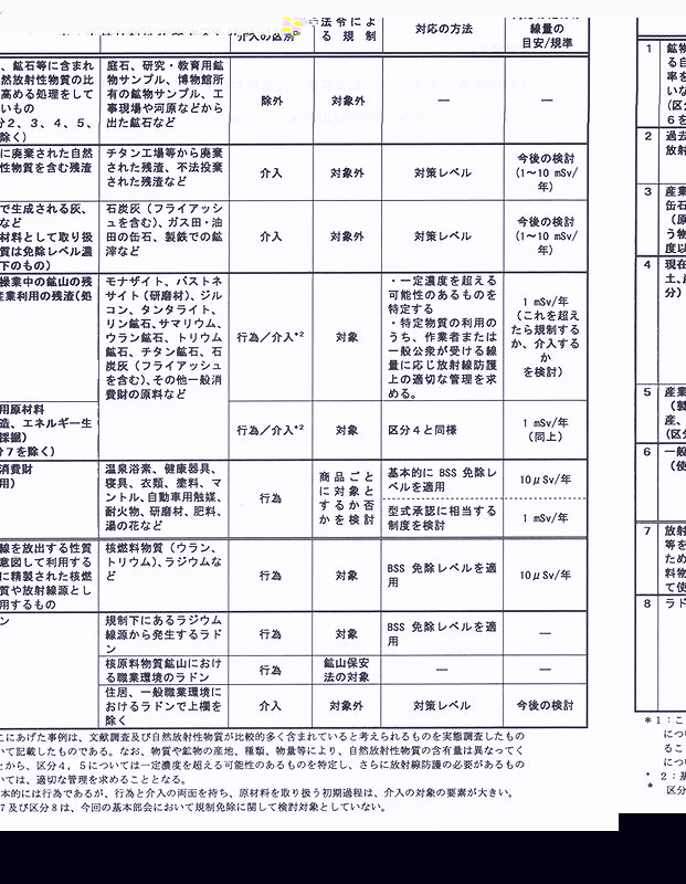 | (2)NORMの規制について 放射線医学総合研究所ラドン研究グループ米原英典 1.はじめに 国際放射線安全基準(BSS)が規定した免除レベル(BSS免除レベル)の法令への取り入れ方針が、昨年10月に放射線審議会基本部会において取りまとめられたが、その報告書の中で、自然放射性物質の規制免除については、今後国内の利用実熊およぴ海外の動向の調査を踏まえて検討することと整理された。BSS免除レベルにおいても、永続平衡にあるウラン系列、トリウム系列の自然放射性核種のための値として、親核種で1Bq/gと与えられているが、現行法令の届出が不要である上限値が370Bq/gであるのに対してかなり厳しくなること、また1構SS免除レベルは、1トンを越える大量の物質の利用については線量評価シナリオの対象に含んでいないとこと、また我が国における自然放射性物質の利用の現状が明らかでないことなどの検討すべき課題が残されていた。基本部会においてこれらの課題について平成15年3月から9回の審議を重ねて方針がまとめられ、国民への意見募集やシンポジウムでの意見聴取を経て、10月に開催された放射線審議会において最終案が承認された。本報告では、自然放射性物質の規制について、海外の規制状況と基本部会でまとめられた方針について報告する。 2.規制の現状 現在産業用の原材料や一般消費財に用いられている自然放射性物質は主にU,Thを含む物質であり、これらは我が国において原子炉等規制法で規制される核原料物質に該当するが、それらの濃度が370Bq/gを越えないものがほとんどであり、使用の届出の必要はない。 その他放射性同位元素等による放射線障害防止法の対象となるもので検討を要するものとしては、Sm-147,K-40などがあるが、これらは現在のところ、固体状のものについては定義濃度である370Bq/gを越えないために、規制されていない。またラドンについては、鉱山や規制下のラジウム線源由来のものは規制対象とされているが、住居や一般職業環境における高濃度のラドンについては、規制されていない。 海外の状況としては、ほとんどのEU加盟国において、人工放射線源の規制免除レベルが導入され、その後自然放射性物質の規制についても検討され、すでに導入または方針が決められた国も多い。ドイツにおいては、主に1mSv/yを線量規準とした免除レベルが規定され、作業者についてはラドンの被ぱくを含めて6mSv/yを越えて被ばくする場合に届出が必要とすることを盛り込んだ新法令が策定され、2004年1月から施行される。フランスは、1トン未満の物質はBSS免除レベルを超える場合は規制対象になり、またそれ以上の大量物質については、作業者の被ばくが1研Sv/yを超える場合に届出が必要となる。欧州では、これらの例のように、様々な基準ではあるが多くの国で自然放射性物質の規制について検討された。一方米国、カナダ、中国などでは、まだほとんど規制をしていない。 3.放射線審議会基本部会での検討結果 自然放射性物質を含む物質には、未加工のままで利用するものから複雑な加工を経て利用するものまで人為性において、また制御のしやすさも様々なものが利用されており、それらを一律に規制することは困難である。そこで基本部会では、これらの物質を、8つの区分に分類し、我が国の利用実態やICRPの考え方を勘案して、それぞれの対応について検討された。その検討結果をまとめたものを表lに示す。 ICRPによると、自然放射線源が自然のままに存在し、その制御が困難な場合は、「除外」と対象としている。自然放射性物質の比率を高める処理をしていないものは原則的に「除外」の対象とし、区分1とした。これに相当する事例として、庭石や博物館で展示される鉱物サンプルなどが当てはまる。 区分2は、過去の活動による残潅査であるが、現在の規制の対象としての「行為」がないこともあり、ICRP Pub1.60でも「介入」の対象としている。区分3は石炭、石油など利用したエネルギー生産や産業の処理過程において生成される灰や缶石(scale)などが対象であるが、これらも「介入」の対象として考える。 つまりエネルギー生産については原材科としては、放射性核種の濃度がBSSの免除レベルと比べても十分低いので、この利用自体は「行為」には当てはまらない。しかし処理の過程で出てくる、フライアッシュ(石炭灰の一種)や缶石スケール)などは、放射性物質を利用するという意識がない状況で免除レベルを超えることがあり得るが、これらについては「介入」の対象として対応し、対策レベルを今後検討するとしている。 近年モナザイト、ジルコン、リン酸を用いる産業、チタン鉱業、研磨材、耐火物製造など種々の産業分野で自然放射性物質を含む原材料が広く用いられるようになっているが、区分の4はこれらの活動で処分される物質が該当し、原材科の利用は区分5に該当する。これら免除レベルを超えるような原材料を用いる製造業の活動や処分などは、基本的には「行為」と