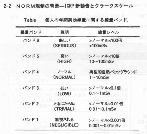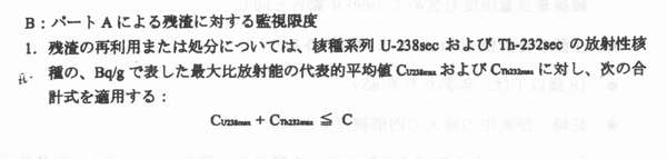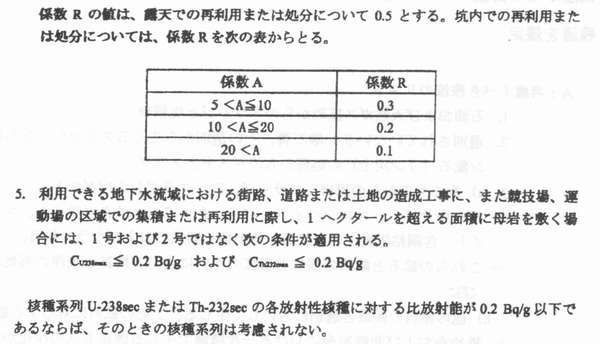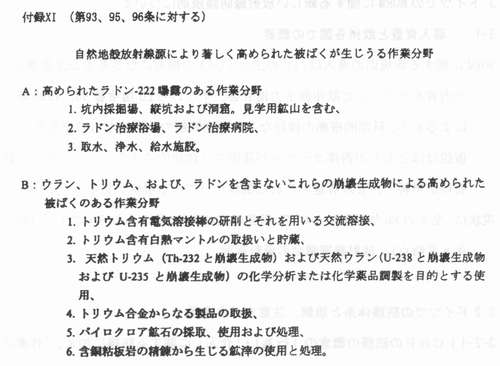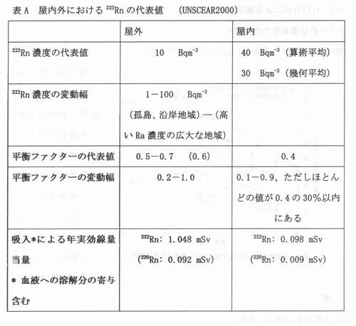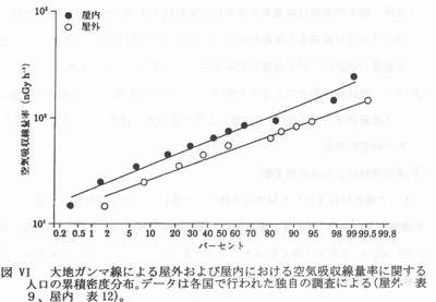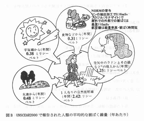 | (1)NORMとは 京都大学原子炉実験所藤川陽子 1.NORMによる被ばく NORM(naturally occurring radioactive materials)、すなわち人為的に濃度が高められた天然放射性物質は、特定地域ないしは特定の集団あるいは個人に対して、相対的に高い被ばく線量を与えるように分布している場合がある。すなわち、 @自然の放射能が地壊的あるいは時間的に高くなる特異な条件が存在する A特定の個人もしくは集団の(特異な)生活様式が存在し、被ばくを誘発することでNORMによる高い被ぱくが起こる。ここでは @自然の放射線源による被ばくにおいて、被ばく量の変動を生じさせる原困として何があるか A上記のような被ばく量の変動はどの程度か BNORMにより生じる被ばくが、様々な原因による被ぱくの統計的分布において、どの程度の位置を占めるのか を明らかにするため、関連する情報を整理する(参考資料「放射線の線源と影響一国連科学委員会2000年報告書・附属書B自然放射線源からの被ぱく」、以下UNSCEAR2000と略称)。 1−1 自然の放射線源による公衆の被ばくの全体像・被ばくの変動要因・変動 1−1−1 宇宙線由来の外部被ばく ![]() 被ぱくをもたらす宇宙線は、主に銀河宇宙線と大気との相互作用で生じる2次宇宙線である。線種ごとの相対的な重要度は図Iに示されている。太陽粒子は、超音速機の航行するような高い高度で被ばくの要因となりえる。 宇宙線由来の被ぱくの変動要因としては、 @太陽活動の11年周期に由来する地球磁場の時間的変動に起因する地上入射宇宙線の時間的変動(約10%) A地磁気緯度効果(宇宙線強度は赤道付近で最小、地磁気極付近で最大、荷電粒子・光子については約10%の変動、中性子では4−5倍の変動) B高度による変動(航空機高度で海面高度の170倍、図A) C建物による遮蔽効果(UNSCEARによる遮蔽係数は0.8、遮蔽係数の分布範囲は木造家屋の1.0からコンクリート建屋最下階の0.4、と約2倍)がある。 UNSCEAR2000では、宇宙線に由来する世界人口の年間平均実効線量当量は300−2000μSvであり、人口で重み付けした平均値は380μSvと算定している。上の平均値は、前回報告と同じである。 1−1−2 大地由来放射親・宇宙線による外部被ばく 被ばくの主要要因は、地殻構成物質中の40Kおよぴ238U,232Th系列の放射性核種である。大地放射線に由来する被ぱく線量の変動は、主に @居住地域の地殻中の放射性物質の濃度による地域的変動(表7およぴ図Vl参照、屋外空気吸収線量率の典型的な変動範囲は10-200nGyh-1で約20倍、屋内空気吸収線量率の変動範囲は20−200nGyh-1で約10倍l:図VIから、ある線量が統計的にどの程度の意味を持つかの判定が可能である。 Aラドン娘核種の降雨による地表輸送(50-100%の変動)・土壌水分の増加による遮蔽効果(5%程度)・積雪による遮蔽効果(積雪1cmあたり1%) 等の時間的変動 B使用建材による地域的変動 人口で重み付け平均した屋外の大地ガンマ線による空気吸収線量当量率は、実測値で59nGyh-1(土壊中濃度からの換算結果で60nGy h-1)で、前回報告値の57nCy h-1より少し高くなった。人口で重み付け平均した屋内放射線の空気吸取線量当量率は、84nGyh-1であった。UNSCEAR2000では、大地の天然放射線に由来する年間実効線量当量は(成人・世界平均値)、屋内で0.41mSv、屋外で0.07mSvとされている。これは1988年報告より0.07mSv高い値となっている。 なお、年間集囲実効線量は約2x106人Svであるが、高度3k m以上のところに住む、人口割合として2%の人が集団線量の10%を浴ぴている。これは高度による空気吸収線量の増大の結果である。 ![]() 1−1−3.ラドン以外の抜射離による内部被ばく 被ぱくの主要要困は、@238Uおよび232Th系列の放射性核種を含む塵の吸入と、A会品や飲科水を介しての4。K、238Uおよぴ232Th系列の放射性核種の摂取、である。この内部被ばくの変動要因としては、以下のものがあげられている。 @塵埃の組成(放射能濃度の高いフライアッシュや放射能濃度の低い有機物の含有の程度)による差 A地域による差(洋上空気中のウラン濃度は陸上一般や工業地域より一桁低い) B食習慣による差(アジアで牛乳消費量少ない、アフリカで葉菜消費量少ない、幼児−子供は成人より乳製品消費量が10−20%多い、魚介類の消費量が国・個人により変動大きい、喫煙により肺の軟組織中の210Po濃度は3倍に) C食物中の放射能濃度の地域差(UNSCEAR2000の表15を参照100−1000倍の変動) D核種の臓器中濃度の年齢依存性 ただし、食品流通の広域化が進んでいることから、食物摂取による内部被ばくは、ある地域における個人の被ぱくが顕著に高くなることは少ないと考えられる。 UNSCRAR2000 では、大地の放射性核種の吸入と経口摂取による全実効線量当量は310μSv(40Kより170μSv、238U,232Th系列放射能より140μSv)としている。 1−1−4ラドンによる内部被ばく 被ばくの主要要因は、222Rn(238U系列)と220Rn(232Th系列)の吸入である。ラドンの抜ばくの変動に関係する要因として、以下のものがある。 @地質中のラドンの親核種(226Raおよぴ224Ra)の濃度(一般に花崗岩>堆積岩、変成岩>石灰岩、ただし例