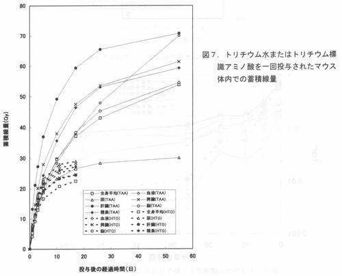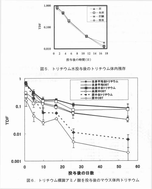 ただし、わが国では、野外実験が出来ないことや、RI投与実験が難しいことなどの理由で、大型動物を使った投与実験は行われず、マウスやラットを使ったモデル実験が、1970年ころからに行われて、その成果は、トリチウムの人体影響評価や、現場の放射線防護に生かされてきた。たとえば、ICRP勧告の中にある、有機結合型トリチウムと自由水型トリチウムの濃度限度比を決めるに当たっては、わが国のトリチウム生物影響研究仲問(放射線医学総合研究所武田博士)のデータが採用されている。