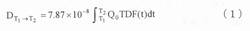 このTDFを使うことにより、時刻T1(日)からT2(日)までの時間における被ばく線量(吸収線量(Gy)は)以下の式で表すことが出来る 15)。