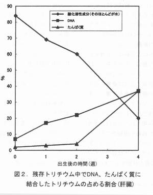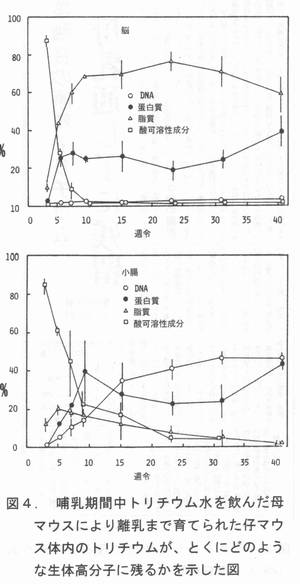 この実験では、胎児期に取り込まれたトリチウムは出生後2.5-2.9日の生物的半減期で体外に排出されることと、全投与トリチウム標識チミジンのうち、45%がマウス胎児のDNA成分として移行することなどがわかった。図1からもわかるが、胎児期に母体を介して取り込んだトリチウムは4週間後(ヒトで言えば多分15歳くらい)には90%以上が体外に排出されてしまう。一方、体内に残留するトリチウムを、自由水、たんぱく質、脂質、DNAなどの成分ごとに計ってみたところ、たんぱく質やDNAなど有機成分に含まれるトリチウムの割合が、時問とともに増えることがわかった(図2)。この有機成分に含まれるトリチウムとは前回に述べた有機結合型トリチウム(Organically bound tritium,OBT )にほかならない。ブルトニウムやC-14など、長半減期の放射性核種が環境の放射線汚染で間題になるように、生物学的に長く生体内に残るトリチウムによる被ばく線量は、短い期間で体外に排出される自由水型トリチウムによる被ばく線量に較べて無視できなくなる。この実験の結果は、OBTによる生物影響の重要性を明らかにしたもので、UNSCEAR Reportにも引用されている。
