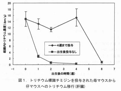 トリチウムで標識された胎児が出生後直ちに、このきれいな乳母マウスに哺乳させることによって、マウス胎児が、母体を介して摂取したトリチウムが出生後どのように残るかを知ることが出来た。