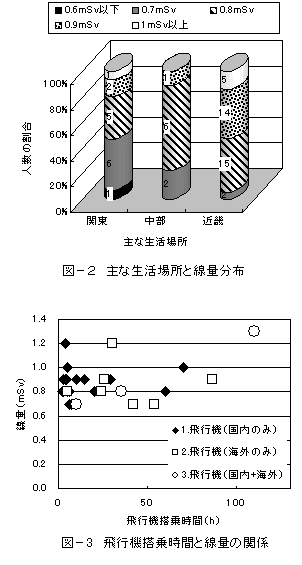 個人線量(平成14年3月13日〜平成15年3月31日)の比較では、図−1に示すように、最低は0.6mSv、最高は1.3mSvであり、平均値は0.83mSvである。分布としては0.7〜0.9mSvに偏り、0.8mSvが一番多い。地域別では図−2に示すように、近畿地区の線量が高く、関東は低い傾向にある。近畿地域に含めているが、うち2名は四国在住者であり、これらの2名は少し高い線量となった。これら2名とも松山の人で、このうち一名は測定期間中、飛行機によく搭乗した。中部は関西と関東の中間的な値である。アンケート調査によれば室内での滞在時間はいずれの地域でも長く、また、地域差はほとんどなかったが、被曝量には関東、中部、関西等で地域差らしいものが現れている。このことは、建物のコンクリート骨材の素材の違いに関係しているのかもしれない。今後の調査が必要である。 飛行機に乗った人は、乗らなかった人よりも高い値を示したが、搭乗回数と線量の相関はなかった。これは線量がフライトの高度、緯度、搭乗時間に依存するためである。これらの関係を図−3に示す。当図においてもほとんど相関がみられないのは、標本数が少ないという理由のほかに、本調査に使用したガラス線量計は137Csγ線により校正されており、エネルギー特性は50keV〜3MeV範囲内は30%以内となっているが、宇宙線のような高エネルギーの放射線に対しては正しい値を表していないことにも因る。今後、宇宙線に対する補正の仕方を検討しておく必要がある。 W.謝辞 本調査研究のモニターになって頂いたNPO安心科学アカデミー会員の諸氏、および線量計の借用から測定までご協力頂いた株式会社千代田テクノルの方々に感謝いたします。