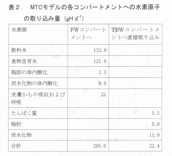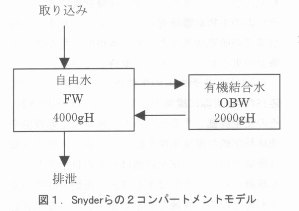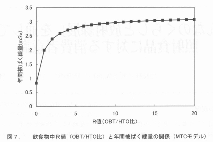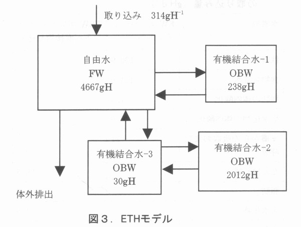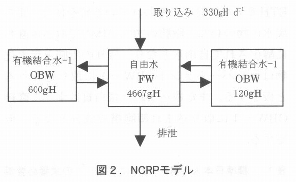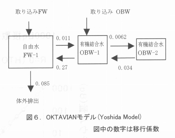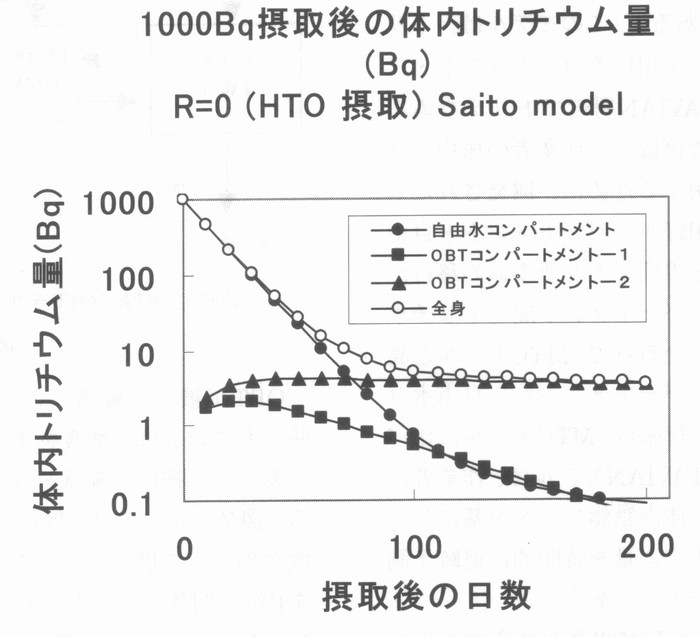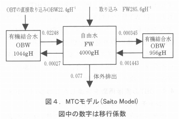 はじめに 国際核融合実験炉(ITER)の建設場所がどこになるのか、本稿を書いている今は、まだはっきりしない。わが国になれば、核融合研究者はその研究に拍車がかかるだろうし、経済効果も莫大なものになろう。また、一介の保健物理学者、トリチウムの生物影響研究者としても、これまでの我が国での研究成果がようやく本格的に生かされる機会が来るわけで、大いに期待している。 前回はトリチウムの生体内での挙動について述べたが、実際に環境中にトリチウムが放出され、その安全評価をするとなると、複雑な生態環境や地球科学的な環境条件を総合的に取り入れた評価は簡単ではない。安全評価は、その日指すところを精緻なものにすればするほど、面倒で時間を食うものとなる。複雑な系を対象にして、安全評価をするためには、評価の方法そのものを最適化しないと実際の用は足せない。安全評価の質を決めるものは、評価に要する時問、評価に必要な資源(お金と人)、評価の精度をかけあわせたものである。 環境に放出されたトリチウムが人に取り込まれるまでの過程をモデル化したものは、“トリチウム環境動態モデルと呼ばれ、IAEAのブロジェクトEMRAS(Environmental Modering for Radiation Safty)でも、その国際比較がとりあげられている。著者はその中のトリチウムと炭素14の作業グループに参加している。第1回の会合は昨年の9月にウィーンで開かれ、第2回の会合は、本年4月にカリフオルニアのローレンスリバモア研究所で行われる。モデルつくりはその対象となる核種の動態についてのパラメータ(決定要因とその時間的変動に関するパラメータ)がわからないと出来ないが、実環境においてはわかっているパラメータよりもわからないパラメータのほうが圧倒的に多い。そのため、すでにわかっているパラメータを代用させたり、それらから類推したり、対象とする系を可能な限り単純化するというようなやり方でモデルが作られる。EMRASでは、トリチウムの環境動態(植物や動物への取り込み)モデルを、モデラーが準備しておき、実験者が実験条件や環境測定の条件(シナリオ)を提供する。測定結果はモデラーに知らされず、モデラーは自分のモデルを使って、答えを出す。その答えが出揃った段階で、測定結果が開示され、モデラーと実験者が集まり、その結果を議論するという方法がとられる。答えがわからない状態で、モデラーはその技術と知恵と競争する訳で大変面白い。EMRASの前身であるBIOMASS(Environmental Modering and ASSessment)にも参加したが、例えば、煙突からの放出核種の大気拡散ひとつ取ってみても、場合(気象条件や距離、地形)によっては、10倍以上のモデラー間のばらつきがあり、環境安全評価コードのデータ信頼性は、ログスケールで考えるべきだということを実感する。 ヒトのトリチウム被ばくを評価するには大きく分けて二つの動態モデルが必要である。ひとつは環境中でどのようにトリチウムが振る舞い最終的にヒトにどれだけ取り込まれろかということを語るためのモデルであり、もうひとつは体内に入ったトリチウムが体内でどう振る舞いどれだけの線量を人体に与えるかを評価するモデルである。 一般に、前者は環境動態モデルと呼ばれ、後者は被ばく線量評価モデルと呼ばれる。トリチウムの内部被ばく線量評価コードは、これまでに多くのものが作られている。 現在、放射線管理の現場でトリチウムバイオアセイに使われているのは、最も簡単な1コンパートメントモデルである。このモデルは体内のトリチウムがすべて自由水型トリチウム(Free Water Tritium, FWT)であると仮定した時のモデルであるが、将来は環境中から、食物連鎖を介して、有機結合型トリチウム(Organically Bound Tritium ,OBT )を取り込むこともある。また、長期間定常的にトリチウム水やトリチウム水蒸気に被ばくした場合には、体内でOBTに転化し、長く残留することになる。 そのため、OBTの直接摂取を考えた線量評価モデルが必要になる。以下、代表的なトリチウム体内動態モデルを紹介する。 ![]() 4.1被ばく線量評価モデル - 1コンパートメントモデルと2コンパートメントモデル 最も簡単なトリチウム動態モデルは1コンパートメントモデルであり、体内の自由水中のみにトリチウムがあるとするモデルである。このモデルはトリチウム水を事故などで、呼吸や皮膚などからの吸収で摂取した場合に役に立つ。しかし、食物連鎖などを介してOBTを摂取した場合にはOBTの体内動態を考えたモデルが必要になる。このようなモデルで最も簡単なのは、図1に示すSnyderらの2コンパートメントモデルである 1)。 以下の図で、OBWとあるのは、Organically Bound Water すなわち有機結合水の意味であり、FWとあるのはFree Water、すなわち自由水のことである。FWTはFWに、OBTはOBWと共存する。また、コンパートメントの大きさは、そこに含まれる水素原子のグラム数で4000gHというように表現される。 Snyderらのモデルで、二つのコンパートメント、すなわち体