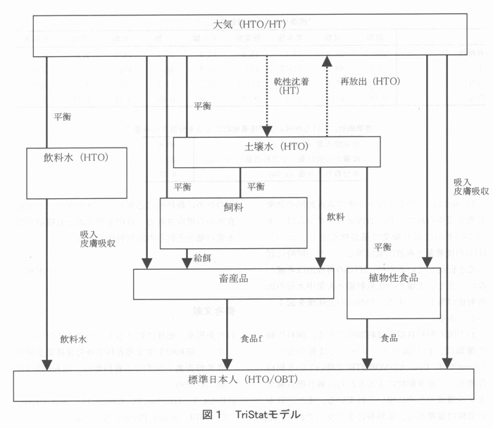 | はじめに トリチウムがこれを大量に扱う放射線施設や原子力施設の事故により、大量に環境中に放出された場合や、平常時の施設の運転により、環境中のトリチウムが定常的に高レベルになっている場合、住人はどのくらいの被ばくをするのか。この評価を行うには、環境中でのトリチウムの挙動を、出来るだけ現実の環境に即して述べることの出来る環境モデルが必要である。とはいえ、現実の自然環境は、地圏、水圏、大気圏、生物圏と多様であり、トリチウムの挙動を記述するためのパラメーターは無数にあり、その挙動の道筋も数え上げればきりがない。モデルで使われるパラメーターの数をなるべく少なくして、すなわち、我々が関わっている世界を可能な限り単純化して考え、その中で、ヒトヘの影響を評価することが必要になる。我々が、現実の社会システムの中で、放射線の安全管理を行う場合には、多くの法的規制があり、具体的な規制値がある。そのため、現場の管理者は、規制値を超えた、超えないで苦労することになるが、規制値そのものは、本来、統計的な不確かさを持った安全限界から導き出されたものである。また、安全判断の根拠となる数値が、本来の性質としてばらつきを持っている場合には、社会的な悩みの対象となる。低線量放射線影響に関する議論はその一例だと思う。自然の持つあいまいさが、自然の本質であるとすれば、得ることの出来るデータのあいまいさを受け容れる寛容さも必要なのではないかと思うがいかがなものか。リスクを受け容れるにはさまざまな社会的道徳的、かつ個々人の生き方についての判断が伴う。これは科学の領域の問題ではなく、哲学や宗教の領域の問題であろう。 ともあれ、数値に振り回されることなく、安心して、放射線や原子力を役立てるためには、規制に使われる数値の拠って立つところを知っておくことは無駄ではなかろう。トリチウムは、環境中や人体での振る舞いの研究が、これまでに、最もよく行われた核種のひとつである。前回は、人でのトリチウム内部被ばく線量評価モデルについて、述べたが、今回は数多くあるトリチウム環境動態モデルでの一般的な考え方を紹介する。 5.1 トリチウム放出源と被ばく線量の予測 このシリーズの最初で述べたように、現在地球環境中に存在するトリチウムの殆どは、宇宙線と上層大気成分との核破砕現象によって作られたものであり、年問およそ、1×1018Bqすなわち1EBq(エクサベクレル)である。過去の大気圏内核実験により、地球環境に放出されたトリチウム量はこの70−100倍(70−300EBq)であった 1)。また、地球上の現存の原子力施設などから、放出されるトリチウム量は、自然界で生咸される量の1000分の1程度である。 さて、核融合炉が実現した場合には、ITER[国際熱核融合実験炉]の場合、最初に燃やされるトリチウム量は約3kgである。量としては、少ないようであるが、放射能量に換算すると、1.1EBqとなり、実験炉一基だけで、毎年自然界で生成されるトリチウムに相当する量が便われることになる。前稿で述べたように、60Bq/ccの飲料水を飲み続けた場合の年間被ばく線量は約1mSvである。 現在の地球環境水中のトリチウム濃度は1Bq/L以下であるので、大雑把に言って、現在の環境トリチクムによる内部被ばく線量は、17nSv/年以下である。したがって、仮に将来、10000基のITERクラス核融合炉が作られ、装荷しているトリチウム全量が毎年定常的に環境に放出されたとしても、地球人類の被ばく線量は170mSv/年くらいである。 実際には、トリチウムは完全ではないにしても、閉じ込めは可能であるから、被ばく線量の増力加は、地球全体の平均だけを見れば、無視できる程度であろう。問題は、可能性のあるトリチウム放出源近傍での、環境やヒトヘの影響である。放出されたトリチウムは地球規模で拡散するが、定常的にトリチウムが放出されている施設の近傍では、事故による一時的な放出も含めて、被ばく線量が無視できない可能性がある。そのために、施設周辺での環境条件を考慮した、ヒトへのトリチウム移行と被ばく線量のモデル化が必要になる。インターネット上でトリチウムの安全性を検索したら“500gのトリチウム水が、環境に流出すると、数十レムの放射線障害を引き起す”とか“ITERで使うトリチウムは小型水爆1000個分”とか恐ろしげな表現に出会った。また、“脂肪やDNAに入ったトリチウム(OBT)は体外に出て行きにくいので危ない”といった表現がトリチウム影響の量的な評価抜きで書かれていた。OBTの体内動態や被ばく線量評価に関しては、我々日本人研究者による研究が大いに貢献していると自負している。しかし、トリチウムの安全性の正しい評価に使われていないことは、研究者としての情報伝達能力のなさもあったのだろうが、はなはだ残念なことである。 線量評価には、気象条件、環境中での動植物への移行、土壌への吸着と再放出、人の食生活習慣、など、自然環境と