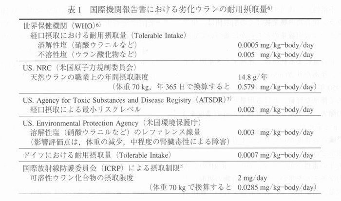 「劣化ウラン」は,Depleted Uranium の邦訳である。Depleted は,「使い尽くす,消粍させる,損耗させる」という意味があり,「劣化」という訳語もその意味で充てられている。すなわち,天然に存在するウランには,238U,235U,234Uが重量比で,それぞれ99.275%,0.7%,0.005%含まれているが,原子力発電等で用いる核燃科では,235Uが3−5%くらいまで濃縮されており(濃縮ウランと呼ばれる),その分だけ,ウラン濃縮上場から発生するウラン廃棄物の235U重量比が,「損耗」または「劣化」しているというわけである。235Uの重量比が0.3%以下であるウランが,劣化ウランである。235Uの重量比が0.7−0.3%以下に「劣化」しても,化学(重金属)毒性についてはほぼ同様であるが,放射性物質としての影響の度合い(比放射能)は,235Uの重量比が下がっている分だけ同重量の天然ウランよりも低いことになる。 ただし,一般の受け止め方は必ずしもそうではなく,天然ウランと劣化ウランでは,劣化ウランの方が,「劣化」しているのだから「危険」に違いないと考えられているようなところがある。経年劣化=性能の低下など,「劣化」という言葉には,「潜在的な危険」のイメージ,リスクの匂いが伴うからである。 ここでは,この劣化ウランの毒性に関する国際的な規制の考え方について紹介し,劣化ウラン弾として湾岸戦争以降に実戦で使用された劣化ウランの,環境及ぴ健康への影響に関する国際機関による調査報告害の概要を紹介する。 ウランは毒性が高い―その化学毒性について 国際放射線防護委員会(ICRP)のPub1.75 1)では,腎臓でのウランの許容濃度,可溶性ウラン化合物の1日あたりの摂取制限について検討しており,特にPub1.78 2)では,動物実験等の毒性学的データ,新しい生物動力学モデルを用いて再評価している。その結果,腎臓でのウランの許容濃度3μg/g,可溶性ウラン化合物の1日あたりの摂取制限2mgを,それぞれ安全側(リスクを過小評価しない)の値として勧告している。ここで主に考慮されている健康影響は,放射線被ばくによる影響ではなく,可溶性ウラン(硝酸ウラニルなど)の経日摂取による腎臓機能への化学毒性が主であり,これは,天然及ぴ濃縮度の低いウランの慢性摂取についても同様である。これらの健康影響の評価は,英国放射線防護庁(NRPB)のStradlingらの生物動力学モデルによる検討 3,4)に基づいており,不確実性が大きいことが指摘されているが,包括的なウランの毒性研究データは,他にはあまりないようである。 その報告書の概要は以下の通りである。 1) 動物実験及ぴヒトの吸入被ばく事例研究が基礎。 2) 核燃料サイクルで対象となる大部分のウラン化合物の体内での吸収特性は,ICRPのヒト呼吸気道モデルで,Fタイプ(可溶性),Mタイプ(不溶性)に該当する。 3) ウラン化合物の職業被ばくの制限値は,化学毒性または放射線量のどちらかに基づいて定められる。 4) 放射線量による制限は,連続する5年間の平均で,年あたり20mSvである。 5) 1950年代より,化学毒性による制限は,きわめて簡単な腎臓における用量と影響(腎臓機能の障害)モデルから,腎臓での許容濃度を3μg/gと定めた。 6) 腎臓許容濃度から逆算して1日あたりの摂取制限を2mgとした。 7) 近年の毒性学的データ,新しいICRPの生物動力学モデルを用い,ウラン化合物の摂取による線量,用量推定とリスク評価を行い,制限値を見直した。 8) その結果,腎臓濃度3μg/gを生じる吸入摂取量は,TypeFの場合で30mg,TypeMの場合で230mgのウランの急性摂取に相当する。 9) 別のいくつかの研究に基づくと,最大許容腎臓濃度は0.3μg/gと推定される。この値を用いる場合,可溶性ウラン化合物の1日あたり摂取制限は,上記の1/10(TypeFで3mg,TypeMで23mg)となる。 10) 従来の可溶性ウラン化合物の1日あたり2mgという摂取制限は,それでもなお,安全側の値である。 11) 1日あたり2mgという摂取制限は,放射線影響ではなく,化学毒性によって現定される。 12) 天然及ぴ濃縮度の低いウランの慢性摂取についても,化学毒性によって規定される。 13) きわめて高濃度に濃縮されたウラン化合物,トリウムを多く含むウラン化合物の慢性摂取については,放射線量を根拠として制限される(年間最大50mSv,5年間で100mv)。 14) 可溶性ウラン化合物の場合,1日あたり2mgという吸入摂取制限は,空気中濃度0.2mg/m3(呼吸率1.2m3/h,作業時間8時間)に相当する。 15) 大きな事故直後に摂取の推定に用いる場合を除き,尿のモニタリングによる(吸人)摂取量の推定は不確実性が大きく信頼できない。 表1は,ICRP 2) 世界保健機関(WHO)5,6),米国環境有害物質・特定疾病対策庁(ATSDR)7)といった国際機関の報告書における劣化ウランの耐用摂取量をまとめたものである。これら報告書において,毒性に関する以下の点については,一致した見解が示されている。 @ウランから出る放射線はわずかなため、外部被ばくの影響は少ない。 A摂取に伴う影響として,内部被ばくによる健康影響,及ぴ化学(重金属)毒性による健康影響を考慮しなければならない。 B内部被ばくによる影響は放射線発がんの可能性である。 C化学(重金属)毒性による健康影