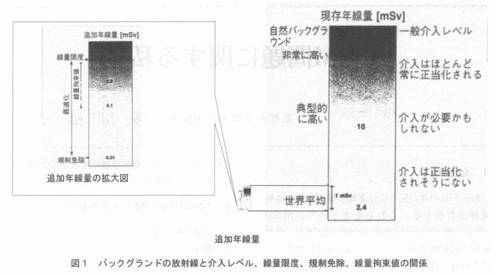 | 1 はじめに われわれの身の回りには多種多様の自然の放射線源が存在する。これらをまとめて、NORM(Naturally Occurring Radionuclide Materials,自然起源の放射性物質)と言う。NORMは自然界の中に不均質に存在し、また時に人間活動によって高められた状態で存在する(TENORM:technologically enhanced naturally occurring radionuclide materials )。 NORMによる被ばくは、国連科学委員会の報告に基づけば、航空機搭乗による宇宙線被ばく、高自然放射線地域に居住することによる被ばく、自然放射性物質を多く含む物質を扱う産業活動によって高められた被ばくに分類できる。IAEA、EU等ではICRPの勧吉を参考にしながら、一部の自然放射線源について規制体系が提案され、欧州では政府による規制が開始されつつある。 NORMをわが国の規制体系に取り入れることを考える場合、人工放射線に対する規制のバランスとの関係で、不合理を感じることがある。このことについては、有志のグルーブ(NORM研究会)で議論を行った。NORMの規制問題は、低線量の放射線のリスク評価という難しい問題とともに、社会的・経済的問題にも関係しており、議論の収束には至らなかったが、議論の経過について2004年春の保健物理学会で「自然放射線源の規制方向に関する考察科学的・論理的真実と国際動向等の調査から」と題して発表したところである。 本稿では、NORM規制に関する国際動向をまとめると共に、NORMを法規制の対象とした場合に起こりそうな問題点について私見を述べたい。 2 NORM規制に関する国際動向 NORM規制に係って今まで発表されてきた数値類を表1に示す。 (1)国際放射線防護委員会(ICRP) ICRPは、特に「制御可能」なNORMあるいはTENORMを対象に白然放射線防護の体系を提案してきた(Pub39,Pub65,Pub82)。Pub39「自然放射線源に対する公衆の被ばくを制限するための諸原則」(1983年10月)以来、ICRPの提示している方向性は、 1)現状既にある被ばく源については介入で対処、 2)新たな清動からおこる被ばくには、人工放射線源と同様に計画段階での制限と制御である。 実際的には、図1のように人工放射線に起因する年線量について1mSvの線量限度(公衆)を設定する一方、現存年線量(主に人間の手の加わらない自然放射能起源)には年10〜100mSv程度を介入レベルに設定している。 図1のICRPの防護のアプローチは、ALARA精神に基づいて自然バックグランド放射線については制御の可能性に着目し、「行為」についてはリスク管理を念頭において、放射線防護体系を考えているためである。ただし、この防護体系は、結果的に、自然放射線源より小さい人工放射線源に対するりスクを厳しく規制する方向に近い形となっている。 ![]() ![]() (2)IAEA,EU,EC等の規制 表向きは、ICRPの考え方に治った形で、幾つかの国際機関が、自然放射線源に起因する空間線量の基準、規制免除となる行為の基準、規制除外やクリアランスの対象となる核種濃度等について、表1の数値を提示している(IAEA-BSS,EU-BSS,EC-RP-122,IAEA-DS161)。 必ずしも自然放射線に限らないが、免除およびクリアランスレベルについて2004年の国際放射線防護学会(マドリッド、スペイン)において、EU各国のアブローチの差を見ることが出来た。たとえば、クリアランスレベルについて国により最大4桁もの差がある(Hillis他、Clearance and exemption Application in EU member srates,IRPA-11)。様々な違いの生じる原因としては、以下の事項が考えられる。 @NORMによる被ばくの「制御可能性」「制御困難性」、正当化における「費用」と「便益」算定の違い、 IAEAでは免除の基準として、10μSv/yを掲げているが、ECのRP−122ではNORMを加工する産業等の被ばくの免除の基準として300μSv/yを提言している。その根拠として、そのような産業等では事実上10μSv/yの尊守は難しい、10μSv/yは自然放射線の様々な要因による変動範囲より小さい値でこの値に準拠する必然性が薄い、としている。また、EU-BSSではく10μSv/yの行為について免除すると考えて構築されているが、放射線を含む器具・放射線を発生する電気器具は0.1mの距離で1μSv/hrなら免除とする、として、放射能を含む商品について比較的単純な免除の体系を設けている。 AICRPの考え方をもとに除外・免除・クリアランス濃度値を計算する際のシナリオのバリエーション 2004年の国際放射線防護学会で紹介されたスイスの例(Baecher他1., A simple model for establishing exemption limits,IRPA-11)では、被ばく経路などのシナリオを変更して計算しIAEA-BSSより更に厳しい数値が導出されている。 B介入か、計画段階での制限と制御、どちらの方策を優先するか たとえば、IAEAでは、様々なTENORMによる被ばくを計画段階での制限と制御、すなわち人工放射線源に近い形で規制する姿勢を明確にしている。 すなわち、放射能を含むコンシューマー・プロダクトの規制について(l)除外、(2)免除、(3)放射能を含んだ当該商品を公衆が使用して良いと言うauthorization、を考えている(Safety SeriesのAppendixV14)。ICRPの言う放射能を含んだ商品についての「介入」措置(Pub 82の(124))と