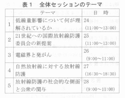 | 1.はじめに 2004年5月23日(日)から5月28日(金)の6日間、スペインの首都マドリッドで国際放射線防護学会主催の第11回国際放射線防護会議(IRPA11)が開催された。ご存知のように、4年に1度オリンピックのある年に開かれてきた本会議は、放射線防護の分野では世界で最も権威のある会議であり、この分野の多くの研発者・技術者が集う会議である。今回も、80を越える国・地域から1300名を超える参加があったとのことである。日本からは、現地での登録者を考えると100名以上の参加者であったようだ。参加国別では、開催国のスペインが最多人数であったのは当然として、次に隣国のフランス、次いで日本であった。わが国は経済的に最悪に状態を脱したとはいえ多い人数であり、アメリカからの参加者の少なかったことと合わせて、いささか妙な感じを持った。 会場はマドリッドの中心地に近いマドリッドシティコングレスホールであった。会場の模様を写真に示した。 スペインは、古代にローマ帝同の版図にあった後、アラブによるイスラムの洗礼を経て、大航梅時代はポルトガルと世界の覇権を争った国であり、コロンブスの故郷として馴染み深い。また、日本とのつながりも長く、安土桃山時代に4名の少年キリスト信徒が紡問したことなどもあって、われわれには親近感のある国といってもよいだろう。最近では、ECの加盟国であることはさておき、サッカーの強豪レアル・マドリッドの国と有名であり、またバルセロナ・オリンピックの記憶も新しい。 ![]() 2.会議の全貌 会議の中心は新しい知見の発表で、全体セッション、小セッション、ポスターセッションにおけるハイライトと総括が当てられていた。そのほかに総会、IRPA関連団体フオーラムや招待講演、シーベルト賞の授与(IAEAのA.ゴンザレス氏が受賞)記念講演、さらにレセプション、バンケット、企業の展示、ソシアルブログラムなどなど、国際会議などではよく見られる多くのセッションや催しが企画されていた。 運営は、日本やドイツではありえないと思われる場面がしばしば見られた。私も当目登録をしたのであるが、手続きが終了したのは2日後の水曜日であった。したがって、朝会場に入るときは、警備の目をごまかすことになったのであるが、これがまた容易でもあった。バンケットもプログラム上は7時半開始9時終了であったが、始まったのが10時ごろであり、終わったのは真夜中の12時であった。われわれがホストの役目として常識と思えることもそれほど気にしていないようであって、国民性を表していて、これまた是と思ったものである。 3.論文発表セッションの概要 このセッションは、参加者全員が出席できる「全体セッション」と特定の9テーマからなる「小セッション」に分けられていた。なお、各セッションの前にキーノートレクチュアが組まれており、早朝のレフレッシヤーコースも組まれていた。全体セッションのテーマ等を表1に示した。 ![]() これらの中では、とりわけ、ICRPのクラーク主委員会委員長から報告されたICRPの新提案(A)では、2005年に提案が予定されている「新勧告」案が参加者の注目を浴びたように思われた。同案については、すでに5年ほど前からドラフトが出されては修正され、また改訂ドラフトが出されるということを経て開係方面で種々議論されてきたところで、そのほとんどは既知であった内容であった。さらにあらかじめコメンテータとして登録されていた6名から5分間ほどコメントがなされた。日本からは藤元氏が手際よくコメントした。 その後、フロアがら17名が質疑をし、それに対するICRP委員による回答がなされたが、すでに検討済み、聞き置くなどで、正面からの回答のあったのは少なかった。また、放射線防護における自然放射線では、わが国でも法令へ取り入れるべきかどうかとその際の論点について、放射線審議会でも議論され、また本誌でも解説記事があったように関心の高いセッションであった。IAEAなどで長く議論されてきたこともあってか講演後の質間・コメントも活発ではあったが、新たな論争に発展するような状況ではなかった。なお、ICRPの新勧告については、日本保健物理学会等で十分に議論されているので、関心のある方はそちらをご覧いただくのがよく、放射線防護における自然放射線(NORM)についても、本誌や放射線審議会基本部会報告等を参考にされたい。 小セッションは次の項目に分類されていた。表3にテーマと発表申し込み件数(保物調査団による)を示した。小セッションでの総発表論文数は1,045であった。一般発表はすべてポスター発表であったが、それらの中からトピックス的な論文が口頭発表の機会を与えられていた。それが、「ハイライトとまとめ」のセッションで、26日(1時間半)と28日(1時間)にあった。これら論文の内容はプロシーディングを、またそれらの発表時の状況と印象については日本保健物理学会保物調査団報告などをご覧になれば詳しくお分かりになると思