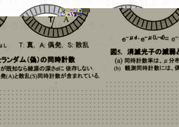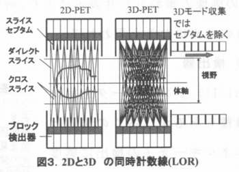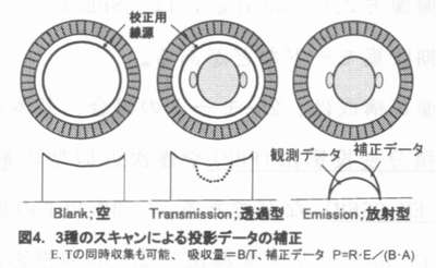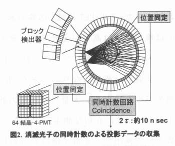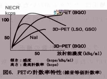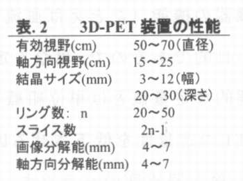 はじめに 核医学は、放射性核種標識化合物の生体内分布やその動態を撮像して臓器の形態とともに機能を診断する分野であり、従来からのX線の体内透過・吸収から得るX線写真、X−CTなどの形態を観察する画像診断とは大いに異なる。今日、話題の陽電子放射型断層(Positron Emission CT:PET)装置は、1970年代から開発され、80年代より臨床利用され始めた。 PETの特徴は、 @C,N,0,(F)などの生体構成元素による、生化学的に自然な化合物の生体での挙動の映像化、定量。 A超高感度(p-molレベルのトレーサの使用。X‐線、MRIでは検出不可)。 B標識化合物の壁(あらゆる物質の体内挙動の観察の可能性)。 などで、molecular imaging と言われる所以である。また、ポジトロンの特異な性質を利用するため、従来の99mTc,123I,201Tl等の標識化合物の体内分布を撮像するガンマカメラやSPECT(単光子放射型CT)に比べて、感度、分解能、定量性に優れている。PETは高価な設備、維持費と多くの人材の必要なことから、大施設における脳神経、心筋などを中心とした研究的な利用(リサーチPET)が主であったが、近年、がん診断を焦点とした日常診療(クリニカルPET)に利用され始めた 1,2)。この1年でPET施設数は倍増し(〜100施設)、さらに広く普及すると思われる。 1.PET装置の概要 1)検出原理: 核から放出されたポジトロンは、組織中で運動エネルギーを失うと、図1に示すように組織中の電子と結合して自らは消滅し、同時に1対の消滅放射線を放射する。消滅光子は、運動量保存則に従い、180方向に放射され、エネルギーはエネルギー保存則より、電子の静止質量511keVに等しい。1対の消滅光子は核のごく近くから放射されるので、被験体を挟んだ1対の検出器により同時係数(coincidence)すれば、両検出器間を結ぶ線上(同時時計数線:L0R;line of response)に存在する標識化合物が検出できる。片方の光子だけが検出されても計数されない。従って、多くの検出器を被験体の体軸周りに配列しておき、各検出器と反対方向にある複数の検出器との間を同時計数回路で結んでおくと、図2のように多方向からの投影データが得られ、CT再構成と同様の手法でPET像が構成できる。 PET画像の分解能の原理的な限界は、放射性核と消滅光検出器子の発生位置はボジトロンエネルギーに依存した飛程(組織中;数mm)だけ離れていること(表3)、および物質中の電子が持っている僅かな運動量のために、2本の光子は厳密には180に放射されないことにあるが、後者は普通ほとんど問題にならない。 ![]() ![]() 2)PET装置の種類: PET装置は今目まで様々のタイプが作られてきた。検出器群の線移動と回転を組み合わせた6角形の機種、リング型多検出器の単層、多層の装置、より細かい一様な投影データを得るため、ガントリーに小さなゆすり運動(wobbling)を加えた機種や消滅光子の飛行時間差をも考慮したTOH-PETも開発された。近年の装置のほとんどは多層のリング静止型であるが、次世代PETとして、さらに高い感度、最高計数率、分解能の装置が開発されつつある3)。さらに最近、X線CTを組み込んだPET装置 PET/CTも作られ、X‐CTとPETの画像の重ね合わせ表示により、病巣部の把握がより正確となり、今後の主流になると思われる。 a)検出器 NaI(Tl)シンチレータを用いた機種もあるが、多くの装置は高エネルギー光子の検出に感度(検出効率)の高いBGO結晶が使われてきた。T0F−PETには、応答の速いBaF2等が使われた。しかし、BG0は検出効率は高いが発光効率、光の減衰時間、エネルギー分解能の点でNaIに劣るため、これに替わるLSO,GSO などのシンチレータを用いた装置が一般的になりつつある(表1)。光の減衰時間が短いと計数損失が少ないため、大量の放射能の計数によく追従して最高係数率が上がり、非常に有利な測定ができる。多くの装置では多数の結晶と複数の位置検出聖の光電子増倍管(PMT)を高密度に配列し、円周方向、スライス(体軸)方向ともに細かいサンブリングができるブロック検出器が使われている。装置の固有分解能は結晶幅の1/2であるため、結晶は寸法の小さい、多数のできるだけ密にに配列されたものが良い(約800個/リング、計3,4万個)。結晶の深さは511keV光子を止めるために数cmと長いので、リング内の視野辺縁部の同時計数線や3D−PETのリング間の同時計数線の幅が大きくなる(分解能が低下する)が、この改良のため、近年、シンチレータ内での相互作用の位置(深さ)を検出するD01(depth of interaction)検出器が研究されている3)。 ![]() b)2Dおよび3Dデータ収集 2次元(2D)−PETでは、同一リング内で同時計数をとるダイレクトスライスと、隣接するリング間で同時計数をとるクロススライスのデータが収集でき、n層のリングで2D‐PET3D‐PET3Dモード収集スライスは2n‐1スライスのPET像が撮像できる。感度はクロスの方が少し高い。各リング間には他の層から入射する光子遮断のためスライスシールド(セプタム)が置かれている。2D−PETは定量性は良いが、感度が低い。これを飛躍的に改善した装置が3次元(3D干PETである。 3D−PETは