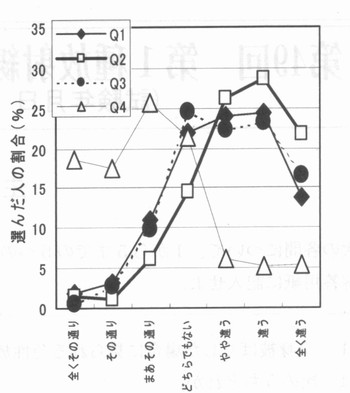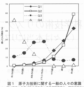 | 1.インターネットを利用した意識調査 現在では人々に何らかの危険が及ぶ可能性のある場合には、行政や企業などからリスク情報やリスクの回避をうながすためのリスクメッセージが発せられることが多い。例えば最近、京都府下で発生した鳥インフルエンザに関する事件では、その発生の一週問後の新聞(2004年3月5日、朝日新聞)では、“鳥インフルエンザに感染した鶏からどう身を守るか”として、発生地域の住民や一般の消費者に対して行動の指針を与えている。また、同月9日、政府は鶏肉や卵が安全であることを人々に説明する一方、生卵や不十分な加熱の鶏肉摂取については(不安な場合は)回避するよう呼びかけている。このような指針や呼びかけは、鳥インフルエンザという突発的で、かつ危機的な事象に対するリスクメッセージであり、情報を有する側が人々の不安感やリスク感を蔡知して、それに答えたものであるといえよう。 では、人々の日常の意識からは遠い科学技術に対して、平常時に人々はどれほどのリスク情報を求めているものなのであろうか。換言すれば、科学技術情報を持つ側は、日常、どのような意識をもって人々にリスク情報を提供してゆかねばならないのであろうか。ここでは科学技術の例として原子力技術をとり上げ、人々が原子力技術に対してどれほどのリスク情報の提供を望んでいるのかを、インターネットを用いて行った社会調査結果をもとに見てみよう。 これは東京都区内と大阪市の両都市部、および福井県と福島県の2地域に在住する20歳以上の男女のインターネット利用者を対象として、原子力情報提供の適不適やエネルギー政策の支持度などを調べたものである。このインターネット調査では、はじめに、あらかじめモニターとして登録された対象者から居住地などの条件に合った調査候補者を抽出し、Eメールを発送して調査の依頼を行う。調査に同意した対象者は、調査候補者以外は非公開の指定されたURLにアクセスして質問項目に回答するものである。モニターが調査に協力した場合には、金券等に交換できるポイントが与えられる。これらのモニターはポータルサイトを運営する民間企業に所属するものであり、こうした企業によって、インターネット上の広告やパソコンおよびインターネット関連雑誌等の広告によって募集されたものである。調査期間は平成13年12月および15年の11月であり、東京都区内では264人、大阪市では550人、福井県では246人、福島県では165人分だけのデータを得た。この種のインターネット利用調査は、調査票を郵送したり回送したりする郵送法や、直接、各家庭を訪れて調べる訪間調査法などとは異なり、短時間でデータが取得でき、またデータの取り扱いも極めて容易である。しかし、調査対象者はインターネット利用者に限られることになる。現在、わが国ではインターネットを利用する人々の割合が急速に増大している。しかし、この現象は主として都市居住者や、若年齢層に限られるといっても過言ではない。実際、福井県や福島県でのモニター数は少なく、特に女性層や中高年齢層は極めて少数でしかない。このため、調査対象層はその地域に居住する人々の平均的な属性、例えば学歴や職業の分布、および、こうした属性に起因していると思われる価値観やライフスタイルなどの分布が平均的なものであるのかどうかや、結果の代表性、すなわち、調査結果はその地域に住む人々の平均的な意見を代表するものであるかどうかなどか問題となるところである。しかし、このことが直ちに、特定の事項に対するインターネット利用者の意識が当該地域の母集団の意識とは一致しないと必ずしも言い切れないにしても、一般にはインターネット利用調査は、「モニターとして登録したインターネット利用者」の意識調査であることに注意しておく必要があろう。以下ではいくつかの調査結果を紹介しよう。 2.人々は何を知りたいのか 図1は一般的な原子力発電についての質聞、Q1は「国は原子力発電が安全であるとする情報を充分、国民に知らせている」かどうか、Q2は「国は日常、原子力発電の危険な側面に関する情報を充分、国民に知らせている」かどうか、Q3は「国が原子力発電の安全性について言うことは信頼できる」かどうか、さらにQ4は「原子力発電の利点をもっと積極的に知らせるのが良い」かどうかに対する全回答者の平均値をプロットしたものである。回答者は「全くそのとおりだと恩う」から「全く違うと思う」までの選択肢から1つを選択するものである。これらの質間に対しては、地域に依存した回答の分布差はほとんど見られない。 また、Q1、Q2で「国」を「県や市町村:jまたは「電力会社」などと置き換えた場合でも、「国」の分布と本質的に変わることはない。当図によれば、人々は原子力発電の安全情報の提供が充分であるとは決して思っていない。Q1で不十分だと考える人、すなわち、「やや違う」から「全く違う