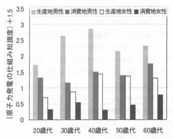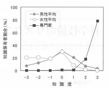 | 1.科学技術の知悉度 一般に科学技術に対するベネフィット感やリスク感の構成要素は、専門家と一般の人々とでは大きく異なっていることが指摘されている(1)。専門家は技術のリスクを単純に単位時間当たりの死亡者数等で予測するのに対し、一般の人々は死亡者数だけではなく、その技術の未知性や事故発生頻度、およびその技術に対する恐怖感などをもとに、社会的、文化的な背景に則って総合的に判断するとされる。人々は決して専門家と同様な知識を有するわけではなく、また専門家と同様な反応を示すわけでもない。しかし、両者間でそれが実際にどのように異なるものであるか、その実態を示す具体的なデータは我国の場合、ほとんどない。ここでは人々にリスク情報を提供しようとする場合に問題となる両者間での違いや、人々の属性の違いによる感受性の違いのいくつかを、前章までと同じ社会調査に依って紹介しよう。 はじめに、一般の人々の客観的な知識の程度を知るために、ここでも科学技術の代表例として原子力を採るものとし、 (1)「原子力発電のおおまかな仕組み」、および (2)「高速増殖炉と軽水炉のおおまかな違い」 を調査対象者か知っていると思うか否かを、調査対象者自身に主観的に判断してもらうことによって人々の知識度を調べた。図14は、都市部(大阪市)と地方(福井県)に居住する人々に対する質問項目(1)に関する(主観的)知識度の属性依存性を示したものである(質問項目(2)については示していないが、(1)と類似の傾向となる)。ここで、生産地とあるのは電力生産地である福井県の南部(嶺南地域)であり、消費地は電力消費地である大阪市の人々に対する値である。当図での知識度の+3は「よく知っていると思う」、−3は「全く知らないと思う」に対応する値であり、0は「どちらともいえない」状態である。したがって、絶対値の大きい負(又は正)の知識度である程、人々は原子力発電の大まかな仕組みさえも知らない(または、よりよく知っている)ことになる。 図1によれば、電力生産地の男性層(および同地域の60歳代女性層)を除いては知識度はすべて負の値となり、人々が「大まかな」仕組みや違いでさえも知悉していない状態にあることを示している。電力消費地在住の女性層は年齢にかかわらず極めて低い知識度であること、こうした女性層と生産地の男性層との問での知識の差は極めて大きいことなどに柱意すべきであろう。 嶺南地域では男性眉のうち72.8%の人々が自分自身や家族、または親戚知人が原子力関連業務に携わっているのに対し、都市部での女性層に対するこの値は12.0%であり、原子力発電は彼女等には非目常的でなじみが薄く、未知性が大きいことが知識の差となって現われたと言えよう。さらに、他の質問とのクロス分析からは、(骨に女性層の)消費地在住者のこのような低い知識度が、原子力発電(やその他のエネルギー問題)に対する無関心さや他の統計量などとも強い相関を持つこともわかった(2)。 つぎに、専門家と公衆とが原子力に関して持つ主観的な知識量の程度を比較してみよう。ここで専門家とは、第2章で述べた原子力専門家である。質間は”あなたは新聞やテレビなどの「原子力発電」に関する報道を充分に理解できるほど「原子力発電」の知識を持っていると思いますか”であり、「原子力発電」に対する知識の程度を、上の場合と同様に主観的に判定するものである。この状況を図2に示す。横軸における知識程度の指標は図1と同じである。知識度に関する人々の平均は、男性−0.2,女性−1.1であるに対し、専門家は2.7であり、一般の人々と専門家との間での知識度の分布形状には著しい違いが見られる。注意すべきは、人々の多くはメディアから送られる原子力関連報道を充分に理解できない(すなわち、知識度が負となる)と答えていることである。これは、既に前図で指摘したとおりである。 個々の科学技術について、どの程度の人々がどの程度の恐ろしさを感じているかは、すでに第2章に示したとおりである。そこでは、日常広く接する科学技術(例えば、自動車)については、専門家と一般の人々の間で恐ろしさの分布に基本的な差異はないが、原子力技術に対する人々の恐ろしさの分布は専門家のそれとは著しく異なるものであることを指摘した。こうした違いは諸種の科学技術が事故をおこす確率の予測や、その科学技術によって一年間に発生する死亡者数の推定にも現れる。人々は総じて、実際値に比して科学技術の事故発生頻度が極めて高いものであるとみなしている。 原子力に関する人々の知識の質は既に指摘したように(また、後述するとおり)、専門家に比べて否定的な色彩を強く持っている。原子力問題はその開発開始時期からメディアが常に注目し続けてきたものであり、我国では一つの重要なニュース議題として位置付けられてきたものである。原子力施設で発生する事象、特に否定的な事象については、その重大さの軽重にか