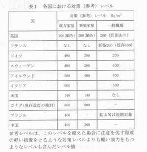 らがきっかけで、米国EPA(環境防護防護庁)が、1986年に148Bq/m3という対策レベルを示し、ラドン のリスク低減政策に乗り出した。 ICRP(国際放射線防護委員会)は、ラドンのような自然放射線源で、制御可能な被ばくについては、 介入によりその被ばくを低減することを勧告してきた。介入の対象となる被ばくの防護には、線量限度 は設けず、その制御のしやすさに応じて、対策レベルを設定して、それを越える場合は介入により低減 することとしている。ラドンに関する刊行物としては、1987年にラドン娘核種への屋内での被ばくの肺 がんリスク(Publication50)で、放射線防護において屋内のラドンの重要件を示した。1990年勧告 (Publication60)では、住居におけるラドンを介入と対象として微量の自然放射性物質を含む物質の利用と貯蔵とともに職場におけるラドン被ばくを職業被ばくとして管埋すべきであると勧告した。 1993年には、「住居と職場でのラドン222に対する防護」(Publication65)を発行し、その中で、対策レベルとして、住居で200〜600Bq/m3を示した。これらの対策レベルは、年間被ばく線量で、3mSvか ら10mSvに相当する。この提示に治って、現在欧州を中心に多くの国で表1に示すような対策レベルが設 定されている。 |