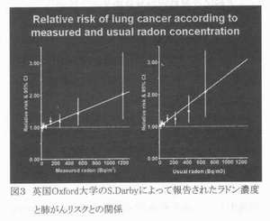 | 2.住居1こおけるラドンの疫学調査 ラドンの影響に関する研究は、分子生物学レベルから、細胞レベル、実験動物レベルまでの実験的な研究も長期聞にわたり蓄積されてきた。しかし、ラドンの人体へのリスクを定量的に把握するには、実 際の人を対象とした研究結果に頼らざるを得ない。疫学研究は、当初は、前述のヤキモフの鉱山での疫 学調査が進められ、その後米国、カナダ、スウェーデン、フランスなどの鉱山での調査が行われた。こ れらの調査の結果から、ラドンの吸入と肺がんのリスクの相関が示され、鉱山の濃度レベルにおけるリ スク係数(単位曝露量(線量)あたりのリスク)も明らかになった。その後住居におけるラドンが問題 になった頃から、その疫学調査についても、行われるようになった。しかし、多くの住居ラドンの疫学 調査は、地域相関研究といわれる、ある地鼓の平均ラドン濃度とその地域の肺がん発生率との相関を調 べる研究であった。住居内は、鉱山と比べてラドン濃度が低いため、これらの研究では、他の肺がん因 子の影響が大きく、ラドンが原因かどうかを分析することが不可能であった。しかし、1994年に Pershagenが、地域相関研究ではなく、他の交絡因子の影響を排除することが可能となるCase−control (症例−対照)研究という手法を用いて、スウェーデンの住居内ラドンで、ラドン濃度と肺がん発生と の間に正の相関があることを初めて示した。その後主に欧州において、このCase−control研究の手法 で、多くの住居内ラドンの調査が行われたが、明解に有意の過剰なリスクが示される結果は、ほとんど なかった。個々の調査では、有意な過剰リスクを示すには、サンブル数が不足であった。英国のOxford 大学のS.Darby等は、欧州で実施された7,148の症例を含む13のCase−control研究について、統合解析を行った結果を、昨年12月に論文として 発表した。この論文では、症例についての、年齢、性別、学歴、喫煙、地域などの交絡因子について慎重に考慮した結果、ラドン濃度と肺がんリスクとの間に、閾値無しの直線的な関係が認められたと報告した。そのデータは図3に示すように明解で、100Bq/m3付近においても相対リスクが有意に上昇していた。 ラドン測定の不確実性を補正すると、図3の右側のグラフのようになり、そのリスク係数はさらに大 きくなり、100Bq/m3当たりの過剰相対リスクは16%であった。住居内ラドンからの被ばくによる発が ん影響はこれまであまり明確ではなかっただけに、この報告は衝撃的な結果となった。また、カナダの Ottawa大学のD.Kfewski等は、北米で実施された4,155の症例を含む7つの症例−対照研究の統合解析の結果を論文として報告した。この研究では、単純に集計した調査解析では、ラドン濃度と肺がんリスクとの間に相関関係は認められなかったが、データが適切に収集された調査のみに限定すると正の相関関係があった。100Bq/m3当の濃度は、lCRPの線量への換算係数で、線量に置き換えると、年間1.5mSvと言うことになる。このような小さい線量で、有意な過剰リスクが出ることは、何か隠れた原因が潜んでいるのではないかと考えるが、最近これらの他にも、有意な肺がんのリスクを示す、疫学調査の結果が示され、それらの結果が示すリスク係数は、大きな誤差を含んでいるものの、リスク係数の値においては大きな差異はない。 |