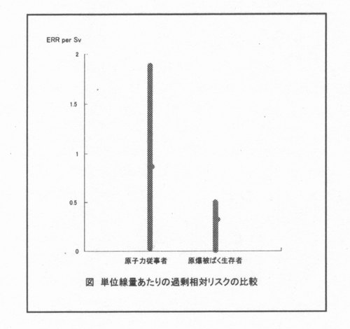 1.目的 Cardisらの論文で得られたリスク推定値の不確かさを定量的に議論することは情報が限られているために困難であるが、論文に記載されたリスク係数をもとに、原爆被ば<生存者との比較を行い、問題点を明らかにする。 2.Cardis論文の記述 論文中では原爆被ば<生存者とのリスク係数比較を行っており、次のように述べている。 1)固形がんの過剰相対リスク(SVあたり、括弧内は95%信頼限界) 原子力従事者:0.87(O.03-1.88)原爆被ば<生存者:0.32(O.01-0.50) 2)白血病の過剰絶対リスク 線形モデル 原子力従事者:1.93(<O − 8.47 ) 原爆被ば<生存者:3.15(1.58 − 5.67) 線形2次モデル 原爆被ば<生存者、:1.54(-1.14 − 5.33) 3.原爆被ば<生存者と原子力作業従事者の比較に際して考慮すべき点 1)被ば<時年齢 被ば<時年齢は、リスクに大き<影響する修飾因子である。原爆データ によると、30歳は、50歳に比べてERRは約2倍高い。原子力従事者のような長期 にわたって被ばくする場合、その影響をどの年齢と比較するかによって両者のリスクが同じ であっても見かけは異なってくる。 2)性 男性同士で比較すればよいので問題はない。 3)ベースライン発がん率の異なる集団 日本と欧米とでベースライン発がん率が、とくに、肺がん、胃がん、乳がん、大腸がんなどで異なる。異なる集団間でリスクの転換が必ずしも相対リスクが妥当であるという証拠は明白ではない。乳がんは相対リスクに比べて絶対リスクがより適切であると日欧米の疫学データ比較から明らかになってきた。そうなると、相対リスクを比較して一致しないことをもって、急性被ばくと慢性被ばくの違いを示すことにはならない。 4)急性被ばくと慢性被ばく(DREF) 上記に示した問題をクリアして初めて、原子力従事者と原爆生存者の同じ線量でのリスクの違いは、被ば<形式の違いということになるが、統計的には差が認められていないので、DREFは1ということになる。