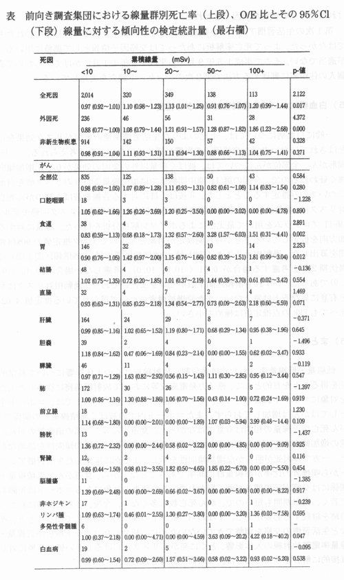 1)はじめに 電離放射線が発がん作用原であることに疑う余地はない。原爆被爆者はもとより、初期の放射線科医(皮膚がん、白血病)、ウラン鉱山坑夫(肺がん)、夜光時計文字板 のラジウム蛍光塗料塗装工(骨肉腫)など多くの疫学調査結果と、マウス、ラット、ビーグル犬など小動物について行われた発がん実験の結果から、白血病はじめ種々固形がんの発生頻度は、被ばくの態様(線源、線質、線量率)に応じて、また被ばく線量の増加により有意に増加することが明らかにされてきた。一方で、われわれの意識には普段ほとんどのぼることはないものの、太古より人類は極低線量率ながらも自然放射線を浴びて生活をしてきた。では、果たして自然放射線の何倍以上の線量・線量率を被ばくすれば発がん頻度の増加がん死亡、非がん疾患が1,346例、外因死が397例であった。 SMRの点推定(95%信頼区間下限、上限)は、全死因で0.94(0.90,0.97)、非がん疾患死亡で0.86(0.82,0.91)で、いわゆる健康労働者効果(healthy worker effect)がみられた。がんに関しては全部位でも部位別でもすべて1.0をまたぎ、コホートと基準日本人男性との間に差異を認めなかった。 次に、死因毎にこの前向き観察コホートにおける線量群別内部比較を行った(表参照)。全死因については、累横線量の増加に応じたO/Eの増加傾向性は統計的に有意であった(p=0.017)。これには累積線量に対する外因死の顕著な増加傾向性(p<0.001)の寄与が大きいと考えられる。とくに100mSV以上の累積線量群における外因死は信頼区間が1をまたがない。非新生物(非がん)疾患では増加傾向性に乏しかった。まず潜伏期を設けない解析では、全部位のがんについて統計的に有意の増加傾向性はないが、部位別の検討では、食道がん(p=0.002)、胃がん(p=0.012)、多発性骨髄腫(p=0.047)に有意の増加傾向性が認められた。 50-100mSV群に見られる食道がんの増加のみ(O/E比3以上)その95%信頼区間が1をまたがなかった(表)。ただし、このO/E比3以上の増加は、従来の原爆被爆者の解析結果を踏まえれば、電離放射線単独の影響としてはなはだ考えにくい。次に潜伏期を設けた解析でも、食道がん(pく0.001)、胃がん(p=0.025)はやはり統計的に増加傾向性が有意で、これに直腸がん(p=0.024)が加わったが、全部位がんは増加傾向性が強まるものの有意ではなく(p=0.099)、多発性骨髄腫は増加傾向性が有意ではなくなった(p=0.07)。 4)交絡因子に関する調査結果 コホート調査対象者の生活習慣などの交絡因子に関する情報を解析結果の考察に役立てる目的で、平成9年10月から翌10年3月にわたって、当時原子力発電施設等で業務に従事していた対象者に第1次の生活習慣調査を行い、約4万8千名から回答を得た。このうち半数の2万人強が上述の第II期疫学調査前向き追跡集団と重なっているので、累積被ばく線量と相関する5つの特性が判明した。 (1)20代、30代、40代、50代、60才以上の各年齢区分を通じて、高線量群ほど喫煙率は高く、喫煙本数の多い人の比率も高かった。 (2)飲酒率は線量群間で差がないが、多量飲酒者の比率は高線量群に高かった。 (3)高線量群ほど紅茶飲用者の比率が小さいが、コーヒーを含め他のお茶類の飲用者については差はなかった。 (4)アスベストなどの有害業務従事歴を有する従事者の比率が高線量群に高かった。 (5)高線量群ほど上部消化管透視を受けた対象者の比率が小さかった。 以上より、生活習慣、とくに喫煙と飲酒に関して累積線量群間に差異があることが示唆された。一般に食道がんでは飲酒と喫煙が相乗的にリスクを高めることが知られて いるので、前項の食道がん死亡率の累積線量群間の差異を解釈する場合には考慮しなければならない重要な要因と思われる。 第1次の生活習慣アンケート調査は調査対象コホート全体に対して行われたものではなかった。よって死亡率解析にあたっては交絡因子情報として調整に用いることが適当でない。そこで平成15年9月から平成16年11月にかけてあらためて直接個人の住所宛に郵送する方法で第2次のアンケート調査を実施している。 5)白血病についての過剰相対リスクの推定 一般に白血病については、上記のような生活習慣関連の要因がリスク効果を示すとはされていないので、交絡因子の影響が極めて少ないものと考えられる。一方で、固形がん、全部位がんについては、被ばく線量以外の要因の効果がO/E比増加傾向に強く疑われるので、今回の第11期中間解析では単位線量あたりのリスク値を白血病についてのみ推定することとした。非被ばく群に対する各線量被ばく群のがん死亡相対リスクは、線量に対して直線的に増加すると仮定し(線形相対リスク回帰モデル)、AMFITプログラムを用いて最尤法によるポアソン解析分析を行った。線量に対する増加方向を仮定していることから片側検定が対象となるのでリスク推定値の90%信頼区間を算出した。過剰相対リスク(ERR)値(90%信頼区間下限、90%信頼区間上限)は、潜伏期2年を考慮する場合が0.01(-10.0,10.0)、考慮しない場合が-0.42(-9