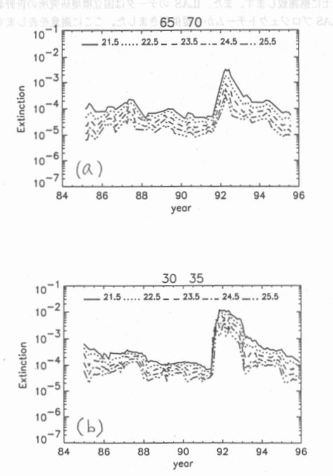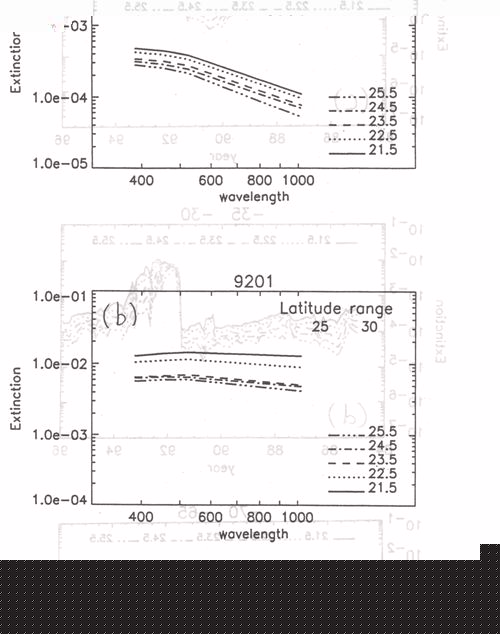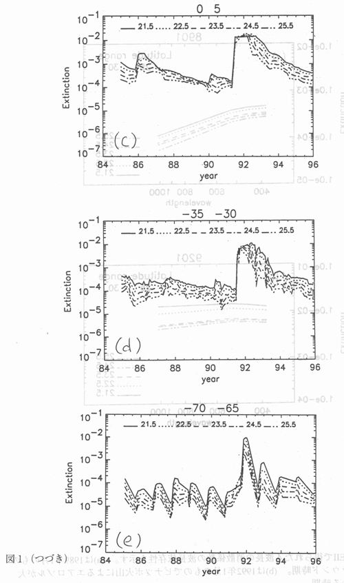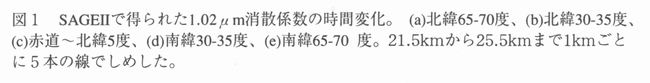 参考文献 MCCormick,M.P.and P.-H.XVang: Satellite occultation measujrements ofthe Earth's atmosphere using SAMH, SAGE and SAGEH, in Diagnostic tools in Atmos. Physics,Proceedings of the international school of physics, 6/22-7/2/93, varenna, ltaly,Edited by G. Fiocco and G. visconti, IOS Press: Wash・, DC・p.183-202.1993. 林田、西村、斉藤: SAGEHで観測された成層圏エアロゾル消散係数の波長依存性の時間・空間変動について、日本リモートセンシング学会誌(投稿中)、1 9 9 7. 謝辞 SAGEHデータの提供に当たって、NASA/Langley研究所のMCCormick博士、Thomason博士に感謝致します。また、ILASのデータは国立環境研究所の笹野泰弘氏を始めとするILASプロジェクトチームから提供頂きました。ここに謝意を表します。 |