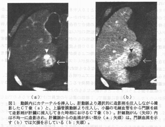 | 放射線被曝による発がんの危険性については、これまでに多数の研究結果が報告されている。近年、バイオテクノロジーの急速な進歩により、がんの発生メカニズムが遺伝子レベルで明らかになってきている。例えば、p53は発がんに大ぎく影響するがん抑制遺伝子として有名であるが、放射線照射によりDNA二重鎮の切断がおこると、DNA−PKが活性化され、p53N末端のリン酸化の促進により、結果としてリン酸化p53が細胎内に蓄積される。しかし、細胞内のリン酸化p53の増加は、その機序は一部異なるが、紫外線照射や熱ショックなどでも起こることが知られている。放射線被曝による発がんリスクについて、その機序が遺伝子的に解明され、放射線以外による発がんリスクも同様に遺伝子レベルで分析できるようになれば、放射線だけを特別扱いせずに、喫煙、食品中のさまざまな化学物質など日常生活における多くの発がん要因を並列的に、総合的に評価・検討することが可能になり、その中で個別の放射線被曝によるリスクの客観的な見直しも行われるのではないかと考えられる。 BRCA1という遺伝子が壊れていると10人中8人は乳がんか卵巣がんになり、しかもその半分以上は50歳までに発症することがわかっている。日本では、この遺伝子に異常を持っている女性は2000人に1人の割合で存在する。日本では1年間に80万人弱ががんで死亡しているが、このような遺伝性のがんは全体の5〜10%と推定される。特に20〜40歳台の若年者のがんには遺伝性のものが多い。色素性乾皮症はDNAの傷害を修復する機能が低く、紫外線により2000倍も皮膚がんの発生率が商い遺伝疾患であるが、このように高率でなくても放射線等による発がんの危険性を増加させる遺伝子異常の存在も明らかになってくれば、放射線の発がんリスクは統計学的な数値ではなく、個々人におけるリスク評価も不可能ではなくなるかも知れない。 さらに、放射線被曝による発がんメカニズムが明らかになれば、その知見を応用して、放射線被曝による発がんを予防する手段を開発することにより、積極的に放射線被曝のリスクの軽減を図るようにすることも可能になるものと期待される。 発がんのメカニズムは非常に複雑で、1種類の遺伝子の変異だけで発生するものではない。また、細胞が1個がん化し、それが増殖を続け、臨床的にがんを発症するに至るまでには、長い時間と多くのステップが考えられる。例えば、肝細胎がんは日本に多く、その約85%はHCV感染によるC型肝炎から肝硬変を経て発生し、肝硬変と診断されてからの15年間に患者の60〜70%に肝細胎がんが発生する。肝細胎がんは、病理学的に多段階発がんの過程を示す。肝硬変の再生結節といった肝細胞の反応性増殖である不規則再生を繰り返すしていると、境界病変と考えられる異型性腺腫様過形成を経て、高分化型肝細胞がんとなり、さらに中・低分化型肝細胞がんへと悪性度が進行していく。正常の肝細胞は肝動脈と門脈から血流を供給されており、門脈からの血流の方が肝動脈からの3倍以上と多い。初期の高分化型肝細胞がんは、正常肝実質と同様に門脈から主に血流が供給されており、臨床的な画像診断のみではがんと診断することは困難である。中・低分化型肝細胞がんでは腫瘍血管の新生がみられ、肝動脈優位の血流供給に移行し、いわゆる古典的な肝細胞がんと診断されるようになる。そして、この時期より腫瘍の増殖速度も加速される。ただし、1個の腫瘤内に悪性度の異なる組織がモザイク状に存在していることが少なくない。図1−aは、肝動脈にカテーテルを挿入し、肝動脈から選択的に造影剤を投与しながら撮像したCT像で、肝細胞がん(矢印)の造影はかなり不均一で、同じ患者の門脈血流を反映している図1−bのCT像では、腫瘤内の造影程度は図1とほぽ逆の関係を示し、図1−aで濃染された部分(矢頭)は、図1−bでは欠損(矢頭)を示している。この部分は病理学所見では中分化型肝細胞がんで、図1−aで濃染されなかった部分は高分化型肝細胞がんであった。このような腫瘍血管の新生には血管増殖因子に関連する遺伝子の異常が発生していると考えられ、多段階発がんのレベルに応じて遺伝子の変化も増加すると推定されるが、結腸がんのようには明瞭にはなっておらず、中・低分化型肝細胞がんにおいてもp53遺伝子の異常の発現率は1/3程度に過ぎない。