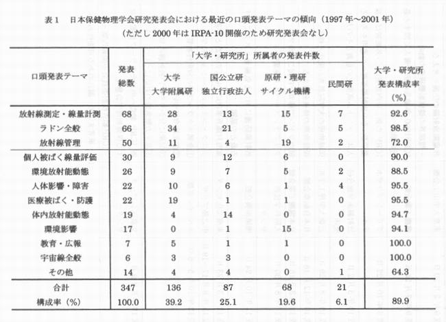 1.はじめに 日本保健物理協議会発起人総会の開催された1962年から約40年、日本保健物理学会は言うまでもなく原子力、放射線分野のみならず、医療や様々な産業分野等にわたる幅広い領域において「放射線防護」をキーワードとして重要な役割を果たしてきた。その間、時代の流れと共に多様化する社会のニーズに応えるために、保健物理(学会)の将来像について学会主催のシンポジウムが企画され、会員間の意見交換が活発になされてきた(1988年、1998年にシンポジウム開催)。また、これらを継承する形で保健物理分野のさらなる発展を目指して、1999年日本保健物理学会に将来検討委員会(石榑主査(NIRS)他委員7名)が理事会直属の委員会として設立され、約2年間にわたるこの委員会の活動報告が最近公表された。中長期的な展望のもとに日本保健物理学会の進むべき方向性が系統的に整理されたこれらの議論を参考にさせていただきながら、「大学・研究所」に所属する若手研究者の一人として、保健物理分野関係者、主に日本保健物理学会の会員の活動に関する現在と将来について若干の意見を述べさせていただく。 2.最近の学会活動で扱われるテーマ 最近学会で扱われているテーマについて調査整理した。保健物理分野に携わる者の活動の場として、また外部との情報交換の場として大きなウェイトを占めるのは学会であり、その中でも年に一度の研究発表会は重要な役割を果たしているものと考えられる。研究発表会では鮮度の高い議論が可能であるため、正にいま問題となっている事項がテーマとして選択されることが多く、また、将来の保健物理分野の焦点が浮き彫りになっているはずである。表1に、1997年から2001年間までの最近5年間(2000年の研究発表会は第10回国際放射線防護学会(IRPA・10 ; 広島)の開催により実施されなかったため、実質的には4大会分)の、日本保健物理学会研究発表会における口頭発表テーマを発表者の所属別に整理した。表中の発表者の所属は、大学(含大学附属研究所等)、国公立研究所(含;独立行政法人)、主要3組織(日本原子力研究所、核燃料サイクル開発機構、理化学研究所)、民間研究所(民間企業附属研究所、財団法人等)と、その他に分類されている。さらに4大会分の口頭発表者の所属内訳を図1に整理した。表1、図1に見られるように、研究発表会における「大学・研究所」所属者の占める割合は90%程度となっており、本学会の特徴が明確に現れている。「放射線管理」等の一部の発表テーマを除き、電力各社やメーカー等の民間企業からの発表件数は極端に低くなっている。また発表の件数の多いテーマは、「放射線測定・線量計測」、「ラドン全般(測定法、調査、線量評価、影響等)」、「放射線管理」の順となっている。この3テーマで発表総数の過半数が占められており(この傾向は最近10年以上変わっていない)保健物理分野として扱うべき幅広い項目から考えると、結果的にかなり偏った内容に集中していることがわかる。その他の注目すべき傾向として、環境科学的な研究の増加がある。従来は放射線防護に直接的または間接的に関係する項目が対象とされていたが、例えば放射性廃棄物の処分等が原子力業界における最重要検討項目の一つとなり、最近は保健物理研究の場で、あるいは並立した形で「環境科学研究」も多く議論される傾向にある。本来、○○研究はここ、○○研究はそこというような縦割り的な議論はすべきではなく,多彩な分野の知識を融和させながらその分野の発展を考えることは重要であり、このような傾向は理想的と考える。 ![]() 図1 日本保健物理学会の口頭発表者の所属内訳 (1997〜2001年、第32〜35大会のまとめ) 学会が主催・共催する情報交換の場としてのもうひとつの重要な機会は、年数回の企画行事や勉強会である。表2に、日本保健物理学会が主催した最近の企画行事をまとめた。これに加え、他学会や他機関、他組織との共催行事を含めると、ほぽ月1回の割合で関係者間の意見交換の場が提供されているといえる。そのような行事や勉強会では年に1度の学会研究発表会における発表項目のバイアスを埋めるべく、学会発表での発表件数が少なくなりがちなテーマ、または研究として発表しづらいテーマが意図的に選択されているように感じる。また、大学・研究所に所属する者のみならず、その他の一般企業からの講演、参加も多くなっているので、研究発表会と企画行事等をまとめた学会活動の全体としては、内容、参加者共にバランスがよくとられているように思う。 3.「大学・研究所」所属者の役割 日本保健物理学会、保健物理分野における大学・研究所に所属する研究者や技術者が担う役割を考えたい。 周知の通り、現在国内の大学には「保健物理」を講座名として掲げる研究室はなく、当該の枠としては、一般的には放射線計測や環境問題を主テーマとして扱っているケースが多い。また、原子炉や大きなRI事業所、核燃料事業所、加速器施設等を