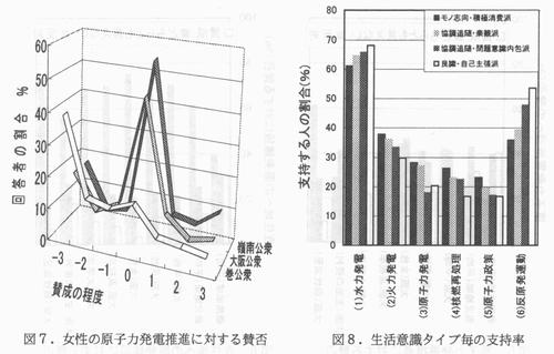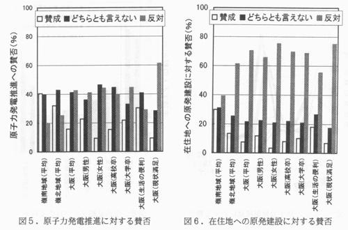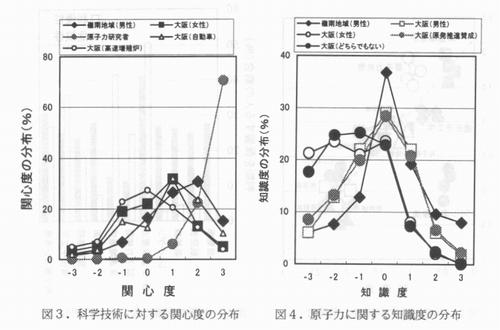 1.はじめに 新たな科学技術が出現した場合、人々がそれを受け入れるか否かは当該技術の利便性と危険性の兼ね合いによって決まる。利便性に比して危険性がより高いと感じられる科学技術については、人々はその技術の拡大を強く規制することを望むが、そうしたことによる制度的な規制は、危険性のより低減された改良技術の出現をうながす。従って、人々の判断は危険性低減のための社会的な力として働く。人々が対象技術の危険性を(例えば数値のような)客観的な基準に基づいて判断する限り、こうした社会的圧力は技術の社会浸透のために有効となる。しかし、危険性の判断が主観的であり、感覚的、心理的な要因に強く依存してなされる場合には、技術の社会浸透は容易ではない。こうした科学技術のひとつが、放射線利用技術である。 従来から、原子力発電や高速増殖炉、放射性廃棄物処理、放射線の食品照射、医療への放射線利用,さらには核兵器などの放射線利用技術に対しては、(他の科学技術と比較して)人々がどのように認識しているかについて、利便性や危険性などのディメンション上で議論されてきた(1)。これらの技術に対する人々の危険性認識は根億い恐怖感や不信感に裏打ちされるものであり、こうした感覚は(人々の生活する環境や教育、文化などをも含めた)社会や人々の総体的な属性に依存したものであることが、多くの研究から明らかになってきている。 本報告では、我が国では、放射線利用技術は他の技術と比較してどの程度に社会的に受容されているかの社会調査例を紹介する。さらに、放射性利用技術の代表例として原子力発電を採り、これに対する人々の受容程度の属性依存性や、その推進の賛否について「どちらとも言えない」とする人々の特徴なども紹介する。これらをもとに、人々はどのような「内的要因」に基づいて新たな科学技術に対する態度を形成し,さらに、それを受容、または非受容することになるのかについても考察する。 2.社会調査の概要 以下では、主として1999年11月における(敦賀市および美浜町を中心とした)福井県嶺南地域および(福井市および鯖江市を中心とした)嶺北地域での調査、および、2000 年11月における大阪市を中心とする25km圏内の近畿圏都市部での調査結果を示す。第一の調査の対象地域である嶺南は現在、原子炉15基の立地する原子カエネルギー生産地 域であり、一方、第二の調査地の大阪市は嶺南地域からは遠隔したエネルギー消費地である。福井県嶺北はこうした両地域の中間的性格を帯びた地域である。 福井県における調査では20歳以上69歳以下の成年男女を対象者とし、嶺南嶺北各地域においてそれぞれ約500名だけのサンプル回収を目処に、調査対象者を二段階無作為抽出 法により選出した。この場合、調査対象者の選出は十歳幅の各年代毎のサンプル数が等しくなる、すなわち、性別毎、年代毎に約50サンプルのデータ取得となるように設定し、これらの対象者宅に調査貝が直接訪問して調査表の記入を依頼して、後日、巡回回収した。一方、近畿圏都市部では、同地域の住民と相似な属性を持つことが確かめられている20歳以上、69歳以下のモニター1200人に対して調査表を送付し、送付されたモニターが記入、返送することにより調査表の回収を行った。回収数は1025名である。 調査内容は対象者の属性の他に生活意識、エネルギーについての認識や意識、各種の科学技術に対するイメージや感じ方、原子力発電に対する関心や知識の程度などである。このような質問では、例えば「まったくその通りだと思う」から「まったく違うと思う」などのように、意識の両端を含んだ七個の選択肢を設定し、各選択肢には−3(最も否定的な、最も弱い、最も小さい程度)から十3(最も肯定的な、最も強い、最も大きい程度)までの整数のスコアを付した。以下で例示する数値はこのようなスコア値か、または、選択肢を選択した人々の割合を重みとして平均したスコア値である。当調査で考慮した科学技術は自動車、航空機、新幹線、レントゲン、ラドン温泉療法、原子力発電、高速増殖炉、麻酔薬、臓器移植、遺伝子工学、および、粒子線ガン治療の11種である。 3.放射線利用技術に対する危険性判断の特異性 図1に、近畿圏都市部の人々の判断した利便度(利便性の認識程度)−危険度(危険性の認識程度)面上における科学技術の位置関係を示す。ここでは属性の違いによる認識の広がり程度を見るために、男性、女性、20歳代男女、60歳代男女の四種のサブグループについての(利便度、危険度)を示し、これらを実線で結んである。破線は、仮に平均的な調査結果が一直線上に乗るとした場合の回帰直線であるが、利便度−危険度の認識変化が直線に沿って移行することを示すものではない。(ここでは示さないが)考慮した11種の科学技術については、それらの利便度と受容度(社会的に受容されているか否かの認識程度)とはほぽ比例関係にあることが当調査か