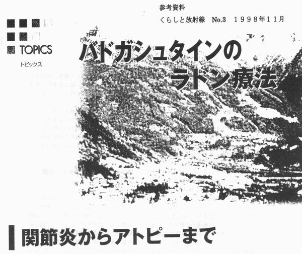 我国で65歳以上高齢者で最も頻度の高い疾患は関節炎であり(20〜30%)、その大部分は変形性関節症と慢性関節リウマチである。ヨーロッパではもっと頻度は高く、関節炎の治療は高齢者医療の重要な課題である。 1998年2月、オーストリアのラドン療法で有名なバドガシュタインを訪問、治療を体験することができたが、ここで最も多い患者はやはり関節炎の患者であった。今回、治療体験、治療成績、行われている研究の成果についてお知らせしたい。 バドガシュタインとガシュタイン療養トンネル バドガシュタインはザルツブルグ県のイタリア国境に近い、2,000〜3,000m級のヨーロッパ・アルプス連峰に囲まれたガシュタイン渓谷の最も奥深いところにある。標高は1,083mで、冬はョーロッパ山岳スキーの中心地、夏は登山やハイキングなどのアウトドア活動の拠点で、ホテルやペンションなどの宿泊施設が多数整備されている。多くのホテルは17のラドン温泉源から湧き出す500万リットルの湯を引いて、温泉プール、温泉浴治療施設を設備している。 バドガシュタインにあるタウエルン山は、数世紀の間、金、銀の採掘が行われ、価値ある鉱石は採り尽くされて廃坑となっていた。 1940年、経済的に行き詰まったナチス・ドイツはこの鉱山で再採掘を試みたが失敗に終わった。ところが、坑道を1,800m入ったところに高温多湿の環境が発見され、そこで働いた鉱夫の腰痛や関節リュウマチが治ることが発見された。戦後、インスブルック大学医学部とザルツブルック大学理学部の共同研究で、ラドン濃度が非常に高いことが判明、治療効果との関連性について研究が開始された。 臨床医学的に有効である病気のリストは以下の通りである。 強直性脊椎炎(ベヒテレフ病) リュウマチ性慢性多発性関節炎 変形性関節症 喘息 アトピー性皮膚炎 年間10,000人の患者がョーロッパ中から訪れ、週2〜3回のトンネル療法を2〜3回繰り返すから、総治療件数は相当なものになる。 トンネル療法の概要と作用機構 ガシュタイン療養トンネルはバドガシュタインの町から車で10分の距離に有る。地上部には事務室、診察室、検査室、リハビリ室、研究室などを含む建物があり、外来診療が行われる。患者は周辺のホテル、ペンション等の宿泊施設から通院し、医師の診察を受けた後、トンネル療法を受ける。専門医の紹介と処方涜がいるが、オーストリアとドイツの健康保険が適用される。 治療は電動トロッコでトンネル内に入り、約2.5km奥にある4ケ所の治療ステーションで一定時間ベッドに臥床する事により行われる。 トンネル療法後は30分、休養室で休む事になっている。医師の指導で運動療法、マッサージ、電気治療などが受けられる。治療回数は週2〜3回、2〜3クールが標準。 ラドン濃度:166,500ベクレル/平方米 温度:37〜41.5℃ 湿度:70〜95% 標高:1,888〜2,238m トンネル療法の有効性と作用機構 治療患者として最も多いのが強直性脊椎炎、ついでリウマチ性慢性多発性関節炎、喘息と続くと言われている。完治は困難だが、何れについても有効性は高く、繰り返し治療を受ける患者が殆どだと言うことで有効性は示されていると思う。 臨床試験の例:頚部痛や頚椎の変形の患者42例をラドン投与群と対照群に無作為的に分け、3週間に9回、前者には、37℃の温水にラドン含有水を加え、放射能が3,000ベクレル/Lに調整した風呂に、後者はラドンの入らない風呂に入浴してもらう。痛みに対する効果は、治療中は両群とも同じように改善された。しかし、治療終了後、対照群でパラメータが悪化したが、ラドン群では改善状態が維持された。喘息の臨床試験でも、療養トンネルの治療は呼気流量で有意な改善を示した。 作用機構として幾つかの仮説が提出されている。@ラドンが身体に取り込まれて、組織がアルフア線で照射されることで、SOD活性が高められる。Aベータ・エンドルフインが誘導されて痛みがやわらげられる。B高温多湿環境が血液循環をよくする。C高地で気圧の低いことが、ブドウ糖の分解過程の中間代謝産物である2,3−ジホスホグリセリン酸(DPG)が増加し、ヘモグロビン機能を調節する。 終わりに ガシュタイン療養トンネルの治療効果は間違いなく存在し、ラドンが主要な役割を演じていることに違いないが、作用機構の解明には今後の研究が未だ必要と考える。 ![]() ■はじめに オーストリアの中部、音楽祭で有名なザルツブルグと、オーストリアの西部、冬季オリンピックの開催地となったインスブルックの中間辺りにあるバドガシュタインはラドン療法で有名な温泉や療養施設のある所です。今年の2月、オーストリアのインスブルック大学、生理学温泉気象学研究所所長デーチエン教授の招きを受け、オーストリアのバドガシュタインにあるガシュタイン療養トンネルの施設を視察し 、治療そのものを体験する機会を得ました。また、ラドンのどのような働きで病気が治るのかについて、色々と意見を交換する機会がえられました 前に一度、バ