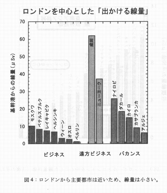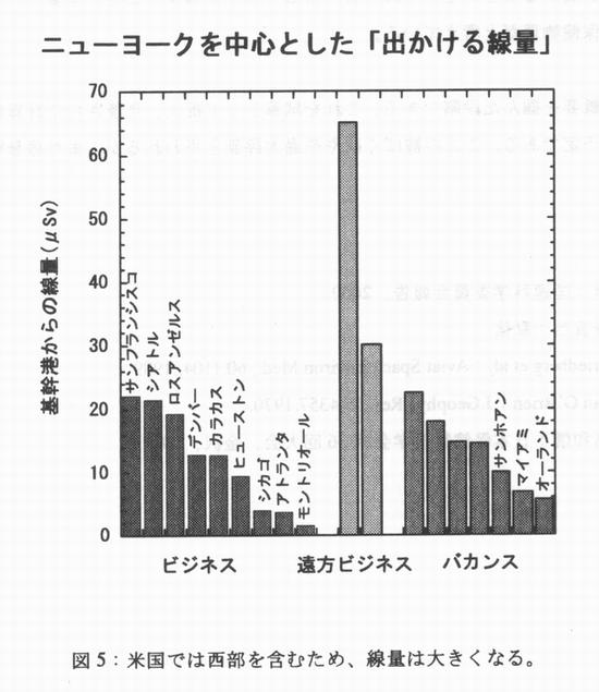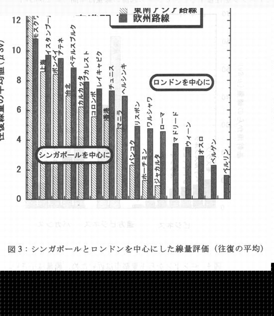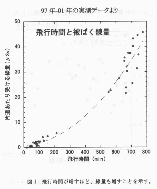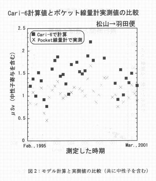 はじめに 我々が遭遇する高レベルの中に、高高度を飛行して受ける宇宙線被ぱくがある。宇宙空間に行けば大きいことは分かっているが、より低い所を飛ぶ航空機でも被ぱくを無視できない。宇宙へ出かける人は数が限定されるが、航空機は大衆の乗り物だから誰でも利用でき、現代生活に不可欠になっている。もし今航空機が発明されたばかりで、これから大いに利用しようという場合なら、線量の議論が沸騰して、乗るべきだ、乗らずに済ますべきだ、等々さまざまな意見が巻き起こったであろう。しかし放射線の知見が広がる前に、既に進むことに決まってしまったのである。 最初に結論めいたことを言ってしまうと、通常航空機で被ぱくする線量は大きく見積もっても年10mSv以下である。1年間にそれ以上浴びることはありそうもない。即ち日 本国内だけを飛ぶなら年間200回を越えても年間lmSv以下と予想され、最も被ぱくの大きいニューョーク路線で必死にトンボ帰りを繰り返したとしても(往復5日間で)、年間 6mSv程度以内と予想される。要はそのレンジの線量が生物学的に有害かどうかである。生物学の観点に加えて、正直だったか否かも問われる。そしてそれ以上の高レベルも太陽活動次第であり得る。 宇宙線は自然放射線であり、それゆえに対処が先送りされてきた。今まではそれで済んだ。しかし現在、保健物理に関わる者としては、少しでも正確に評価し、変動要因を明らかにし、有効な防御手段は何かを提示しなければならないだろう。そういう時代になったのである。線量を決める最大の要因は高度だが、時として太陽の磁場ポテンシャル (Heliocentric Potential)も効く。磁場ポテンシャルが強い時は宇宙線が地表に近づき難く、この場合磁場ポテンシャルとは平均的な太陽を表す言語である。一方で、平均からはみ出した太陽を記述する言語がある。フレアである(フレアは単純に太陽活動が盛んになったものと言うより、エネルギーが突出する)。 これは良く出る質問なので繰り返すが、太陽活動が盛んな時期は地球近傍が太陽磁場に覆われ、磁場の壁に跳ね返されるため、宇宙線は近づき難い(太陽活動と宇宙線強度は逆相関)。すなわち地表レベルでは太陽活動極大期の宇宙線は弱い。逆に太陽活動が極小の時期は、宇宙線が自由に近づけるため地表レベルの宇宙線は強くなる。一方太陽フレアの場合はそのフレア粒子の速さが毎秒1,500kmに達するので、磁場の壁なぞ突き抜けてしまう。すなわちフレアが起きるほど太陽が盛んな時は、地表で観測される宇宙線も増大する。これら両者、すなわち「通常の」太陽活動と、「異常に」活発な太陽を区別しなければならない。 実測とモデル 図1は航空機で実測し、校正した線量の値である。各地への距離が伸びるほど線量も大きくなる。すでに各地で発表して来た図である。多くの点がプロットされているが、実はこの各一点を数分おきの時間変化に分解できる膨大なデータ群が用意してある。最も遠いところは成田からニューョークまで飛ぶ路線である。これはシリコン半導体検出器のポケット線量計のデータであり、元来は電離成分しか計測していない。そこで別途に行った3インチNal(Tl)スペクトロメータとの同時測定結果を大量に求め、それから換算係数を出し、その換算係数をポケット線薫計指示値に掛けて評価する。中性子成分も存在するが、幸い通常の航空機の飛ぶ高度範囲は5,000m 14,000mだから、国連科学委員会報告(文献1)にあるように、そこでは中性子の量はほぽ一定である。電離成分と中性子を合計した線量に換算する時は、ポケット線量計の指示値を2.7倍すればよい(文献2 )。そのようにして求めた結果は概略良く合っている。 ![]() 一方、宇宙線の被ぱく量データには、測定値の他に計算によるものがある。Cariというモンテカルロ計算コード(文献3)を米国の連邦航空局が用いているが、これは大気中の衝突・崩壊を記述するO'Brienのモンテカルロ計算コードLuinに基づいている(文献4)。Cariには色々なヴアージョンがあり、少し前までVer。2が良く使われていた。現在は Ver.6である。全体的にみれぱ実測とよく一致しているので、まずこの計算モデルは正しいと考えられる。細かい所までは合わないが、余り細かいことを言わなければいいのである。Cari-6で計算するには飛行コース、時刻、、高’度の情報、そして太陽の磁場ポテンシャル情報が必要である。線量への影響が大きいのは高度だが、いつ、何回、飛行高度を変更したか、を詳しく入力する必要がある。この場合の飛行コースは大圏コースを仮定する。すなわち2点間を結ぶ最短距離を飛ぶのである。磁場ポテンシャルは2002年7月まで月平均値が発表されているから、それを入力すれば良い。あとは具体的に出発点と終点の空港名を入力するだけである(例えば成田空港はRJAA、ヒースロー空港はEGLL 、ケネディ空港はKJFK等)。最終結果は電離成分寄与ど中性子寄与の和としてSv単位で与えられる。図2にCari-6