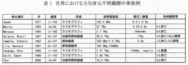 1.身元不明線源とは 身元不明線源は、英語の「Orphan Sources 」の訳語として日本保健物理学会が当てたものである。 IAEA BULLETIN 41/3/1999 によると、次のような線源を含めた制御されていない線源のことを意味する。 (1)規制による管理を過去にも受けたことがない線源 (2)過去には規制による管理を受けていたが、遺棄、紛失、あるいは誤配置された線源 (3)盗難あるいは、正当な手続きなく処分された線源 上記の意味において、日本語訳として、「身元不明線源」とした。 2.国内における事例 過去に身元不明線源として見なせる事例は下記のように分類することできる。 (1)障害防止法施行以前から使用している場合。 (2)使用に際し使用者が文部科学省の許認可が必要であることを知らなかった場合。 (3)「校正用線源」ということで、使用者及び販売業者が文部科学省の許認可が不要と思っていた場合。 (4)海外での法規制が無かったので、輸入装備機器等に放射性物質が利用されていることを知らなかった場合。 (5)国内で法律規制対象外の放射性物質を機器等に装備している場合。 (6)放射性物質の廃棄の措置を間違えた場合。 (7)その他 幸い、我が国において放射線障害に至った事例は最近ではないが、それぞれに該当する事例が報告されている。例えば、(1)の場合は、障害防止法施行以前(大正時代のものもある )から使用された医療用の226Raの針、管状等の密封線源がこれに相当する。医療用の226Raの針、管状等線源は、皮膚科、産婦人科等で広く利用されていたことがあり、特に古い病院では、文部科学省の許認可が必要であることを知らなかった場合や許認可を申請する際に線源の存在を知らなかった場合が多い。(5)の場合、ラドン温泉器はトリウムを使用しており、放射能濃度は370Bq/g以下であるが、ゲトモニタで一番多く検出されている。特に、ラドン温泉器は、一般家庭で使用しているもので、デパト等で販売しており、かなりの数が国内で使用されていると思われる。また、アスキパは、天然ラジウム鉱石(カタログによる)を使用しており、自動車のエンジンの吸排気系統に利用されている。どちらも、一般家庭で使用されている物である。(6)の場合は、海外から輸入されたスクラップに放射性物質等(密封線源、汚染したダクト)が紛れ込んでいた場合があった。密封線源が検出された例としては、平成12年4月の和歌山での241Am/Be中性子線源と137Cs線源の例や平成13年3月の山口での137Cs線源の例がある。 3.諸外国の事故例 現在、世界では金属スクラップに混入される身元不明線源に対する対策が各国で進められている。とくにIAEAは、1999年にアクションプランを作成し、使用済みの線源の管理のあり方などについて勧告している。 スクラップ業者が犠牲者となった事故の代表的なものがブラジルのゴイアニア市で1987年に起きた事故である。この事故は、廃院となった施設にあった放射線治療用の137Csの照射装置が解体され、拾われた線源部分がスクラップ業者の手に渡ることで放射線障害事故が起きた。事故の発見は事故で死亡した女性が健康に異常に気づいたことが端緒となっている。この事故では、スクラップ業者の親類および友人など4名が死亡している。 2000 年にもタイにおいて死亡者をだす事故が発生している。 身元不明線源に関係した事故は表1に示した。すべての事故で過剰被ばくに至った原因は放射線源であることを認識していないためであり、放射線測定によって未然に防ぐことができた事故ばかりである。多くの事故で、金属スクラップは商品的価値があることが事故につながっている。過去に利用された放射線線源が使用済みとなって、誤って廃棄されたり、誤配置されたりした結果、線源としての認識がなく、金属スクラップとしてリサイクルされる可能性は今後ますます増大するものと考えられる。米国では、1983年以来、線源を高炉で溶融してしまった事故が20件報告されている。これらの事故では、人の過剰被ばくに至っていないが、除染などに伴う経済的損失は極めて大きいものがある。平均で800万ドルから1000万ドルの費用の負担を製鉄メーカーは被っているとされている。 ![]() 4.身元不明線源の線源分類 (1)線源分類の考え方 線源の分類は、身元不明線源に対する社会的な対応の規準となるものである。つまり、身元不明線源が発見された場合に、その線源がどの程度の重大さをもつものであるかを判断する目安となる物差しがあるとさまざまな対応が容易となる。社会的にどの程度の強さの線源なのかは潜在的な影響を考える上で必要な情報となるからである。線源の分類は、ヒトヘの放射線影響を基準にして決めることが最も適切である。放射線影響は、放射線防護の視点から、確定的影響と確率的影響に分類される。線源の分類に際しては、身元不明線源に接触する人々および接触時間が限られていること、また、障害と被ばくとの関係が明確であることが必要とされることなどを考慮して確定的影