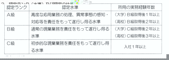 1.現業技術・技能認定制度の目的 @当社が必要とする現業技術・技能の水準を明らかにし、社員研修の充実を図ることで、現業技術・技能の一層の向上に資する A習得した技術・技能を公正に認定し、ふさわしい業務を担務させることで一層の活力高揚に資する B社会的にも権威ある制度とすることで、技術・技能に対する社会の信頼感の向上に資する 2.認定対象業務 ○配電 @配電技術・保守技術 A建設運営技術 ○給電・給電運用 ○火力発電 @運転操作 A保修工事 ○原子力発電 @運転操作 A保修工事 3原子力保安 C原子力技術 3.認定ランク(水準)及び認定の仕組み