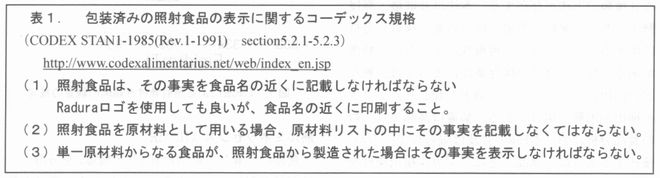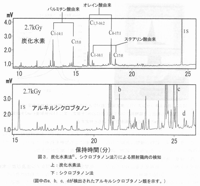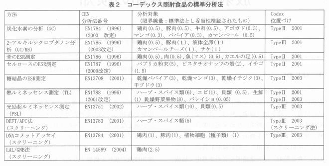 | 1.はじめに ガンマ線、電子線、エックス線などを農産物や食品に照射すると、腐敗や食中毒の原因となる食品に付着した微生物(細菌、酵母、カビなど)が死滅するとともに、野菜、生鮮果実の場合には成熟、発芽、老化等の生物的変化が抑制される。これらの照射効果を利用した放射線照射技術、すなわち"食品照射”は先進諸国を含め世界中で猛威を振るっている食中毒に対し、残留性のある薬剤に代わる防徐法、農作物の検疫に広く用いられてきたオゾン層破壊原因物質、臭化メチルの代替法としての期待が高まっている。現在では世界中で257,000トンの食品が照射されており(1999年度)、そのうち香辛料の照射は100,000トンを占めている1)。 このような食品照射の発展が健全に持続するためには健全性が確認された線量範囲での照射や照射施設における工程管理が適正に行われていることを確認し、消費者に選択権を与えるために適切な表示を行う必要性があり、このことは国際機関 (表1参照)や食品照射が許可されている国々の規制にも盛り込まれている。 しかしながら、表示の規制を施行するだけで、照射食品の適正な表示が確保できる保証はなく、規制を強制して効力を持たせるためには、照射食品が適正な基準に従って照射され、表示されていることを検査するための方法、すなわち「検知法」が必要になってくる。本講においては照射食品の検知技術の現状を概観するとともにわが国の現状についても簡単に触れたい。 ![]() 2.欧米における照射食品の検知法整備 1960年代から1970年代にかけて行われた照射食品の健全性研究の過程で放射線照射特有の分解生成物は加熱等の他の処理に比べて極端に少ないことが明らかにされ、放射線照射を検出することは事実上不可能であると考えられてきたが、照射食品の表示や表示の有効性を検証することの必要性が重要視されるにつれ、検知に関する研究も盛んになり、1990年代に入るといくつかの有望な方法についてEUやFAO/IAEAが国際的な共同研究を行い、現在EUにおいてはすでに10の公定法(CEN標準分析法)が整備され、コーデックス委員会においても、コーデックスサンプリング分析法部会(CCMAS)において、CEN標準分析法についての検討を行い、この中の9種類を照射食品に関するコーデックス標準分析法2)として採択している(表2参照)。 ![]() 3.CEN標準分析法の概略 表2に示された分析法の概略を以下に解説する。 電子スピン磁気共鳴法(ESR) 照射によって、食品中に生成する比較的安定なラジカルを電子スピン共鳴装置により検出する方法である(図1参照)。 CEN標準分析法の中には、肉類などの骨に生成するラジカル、乾燥果実などに含まれる結晶性の糖に由来するラジカル、植物組戦中のセルロースに由来するラジカルを測定する3種類の方法が存在する。本法は非破壊・無侵襲法であり、試料は無限に使用可能、繰返し分析に供することができる、再現性がよいという特微かある。反面、食品の保存条件によっては、熱などの作用によるラジカルの消失が起こり、シグナル検出が困難な場合がある。装置は高額で、一般の食品分析におけるESRの普及は限られているが、後述するように、食品ごとにラジカル検出条件を最適化すれば、さらに分析精度と適用範囲の拡大が望める可能性がある。 ![]() ![]() 熱ルミネッセンス(TL)法 食品に付着した鉱物物質(ケイ酸塩)を分離し、放射線照射によってトラップされた不対電子を熱的に励起して放出される光を検出する。この時の発光特性や線量に対するシグナル強度は鉱物によって異なる。食品由来の鉱物の種類は未知であるため、CEN標準分析法では、測定後の(鉱物)試料に対して既知線量(通常1 kGy)のガンマ線を照射して再度発光を測定し、初期発光景に対する比を求めて判別を行っている(図2参照)。 農産物に由来する食品やエビや貝などには土壌や砂に由来する鉱物質が含まれる可能性が高いために、多くの食品に応用出来る可能性がある。そして検知の判別精度は良好である。ただし、食品自体を測定している訳では無いので、鉱物質の分離が不可能な場合に分析が出来ない。また、測定原理として、一度の熟掃引でしか測定ができない。 また、再照射のための放射線源が必要であり、通常の食品分析のラボで一連の工程を実施することが難しい。 光励起ルミネッセンス(PSL)法 TL法は熱的励起によって束縛不対電子を開放し、その間のエネルギー遷移によりスペクトルを得る。これに対し、PSL法は熟的励起のかわりに赤外線の振動励起によって不対電子の状態を開放し観測している。 PSL法はTL法に比較して食品付着の鉱物試料を検知する必要がない長所を持ち、直接測定が可能である。しかし、赤外線励起とはいえ、分子振動による加熱を利用しており、ここでも同一試料の繰り返し測定ができない。 化学分析法−シクロブタノン法及び炭化水素法 肉類や卵、チーズなどの動物性食品や、脂質を多く含む植物種子などにおいて、脂肪(トリグリセリド)の